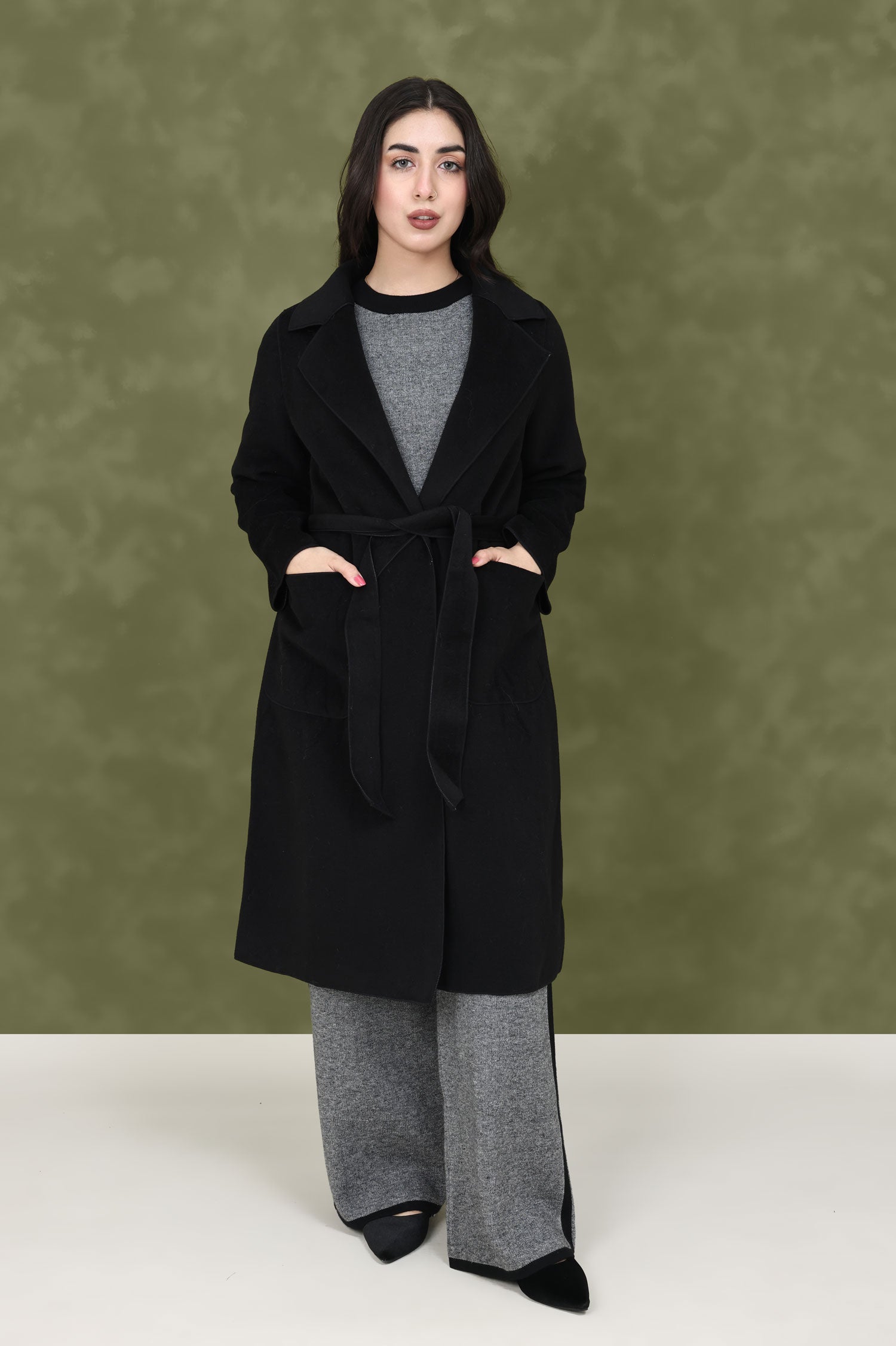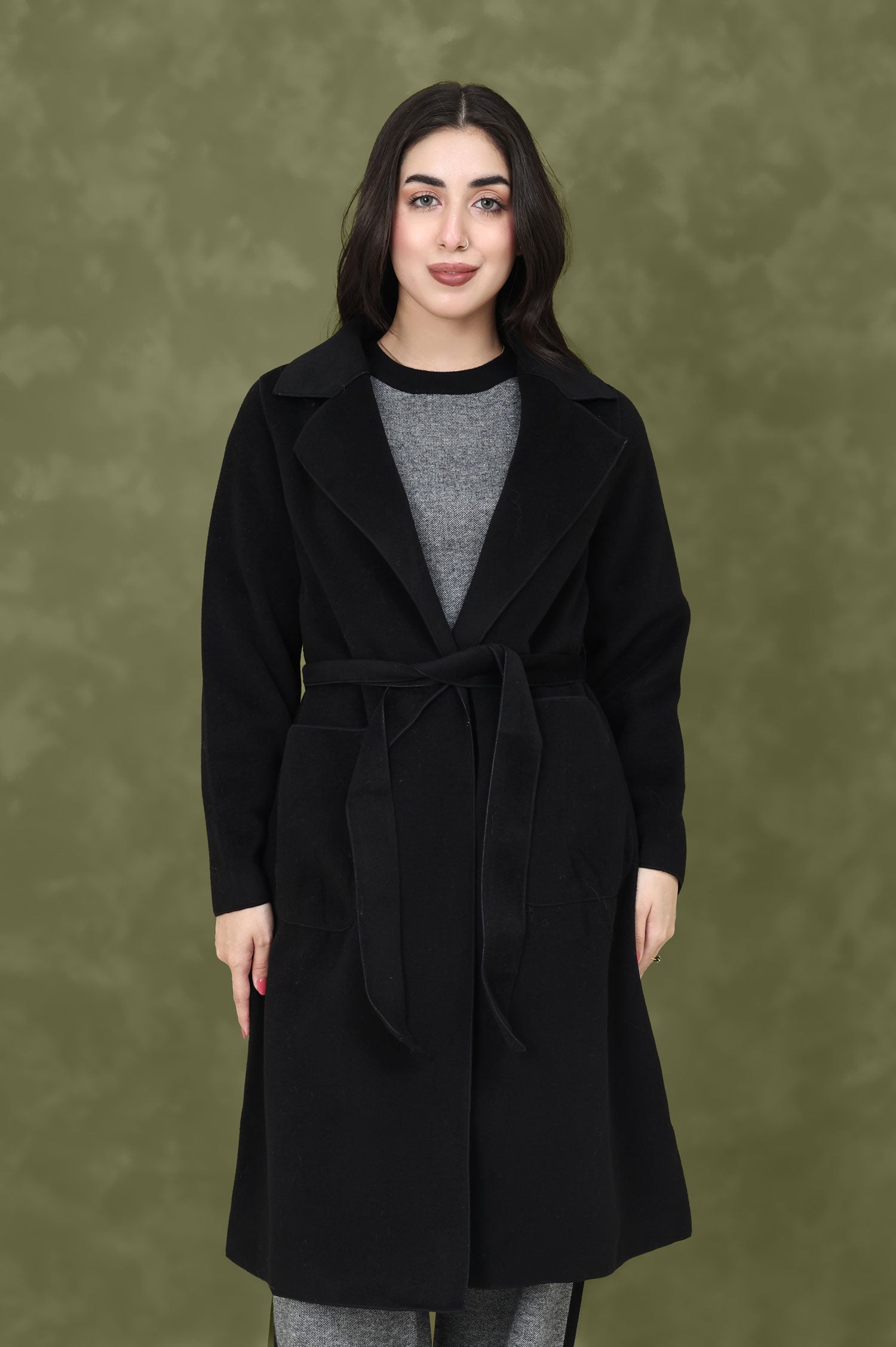 This classic wool-blend trench coat is a must-have for cold-weather styling. The minimalistic design, belted waist, and structured lapels create a polished look, while the soft wool-blend fabric ensures lasting comfort.