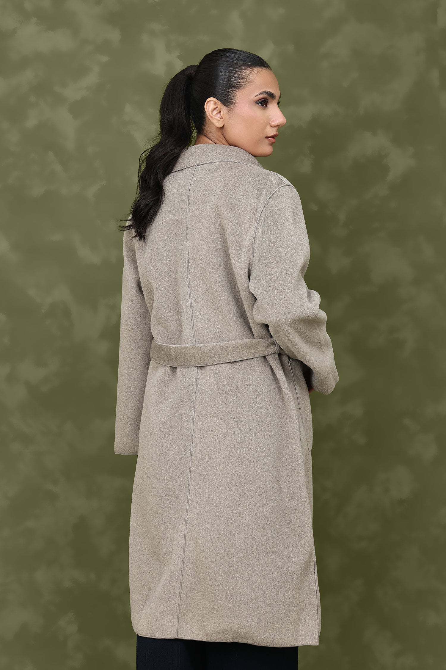 This classic wool-blend trench coat is a must-have for cold-weather styling. The minimalistic design, belted waist, and structured lapels create a polished look, while the soft wool-blend fabric ensures lasting comfort.