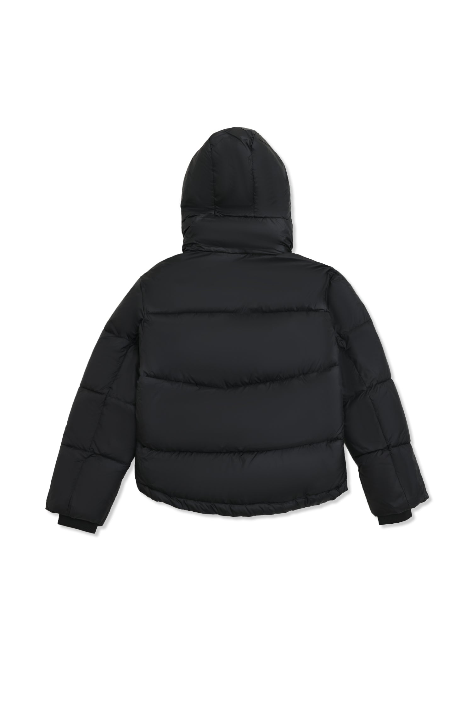This jacket combines plush quilting with a sculpted high collar for added warmth.