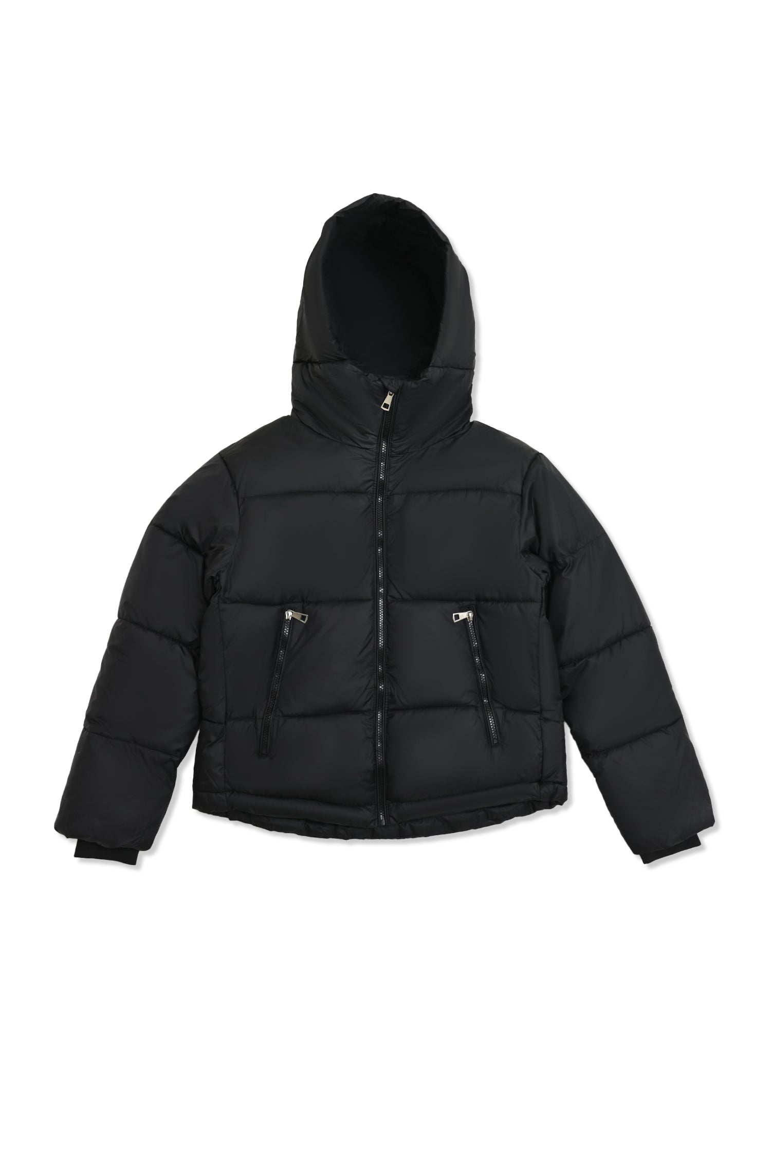 This jacket combines plush quilting with a sculpted high collar for added warmth.