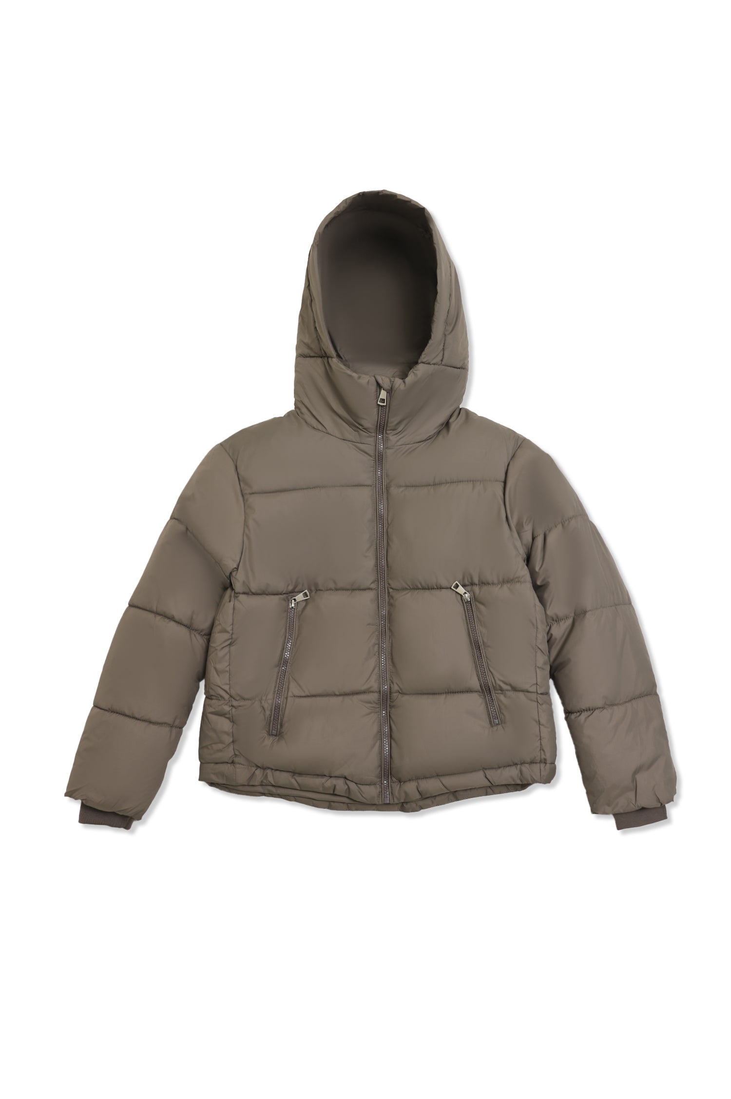 This jacket combines plush quilting with a sculpted high collar for added warmth.