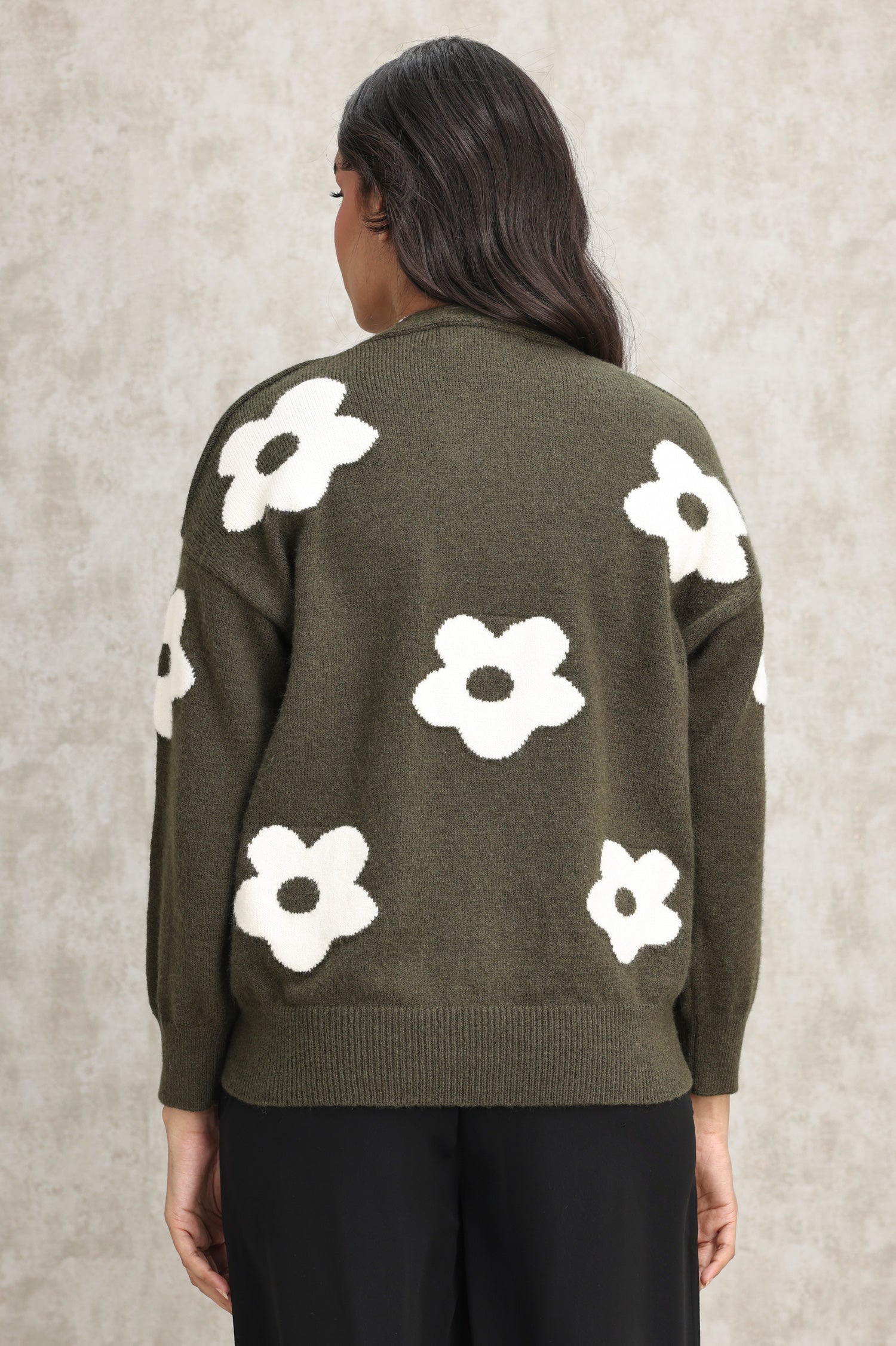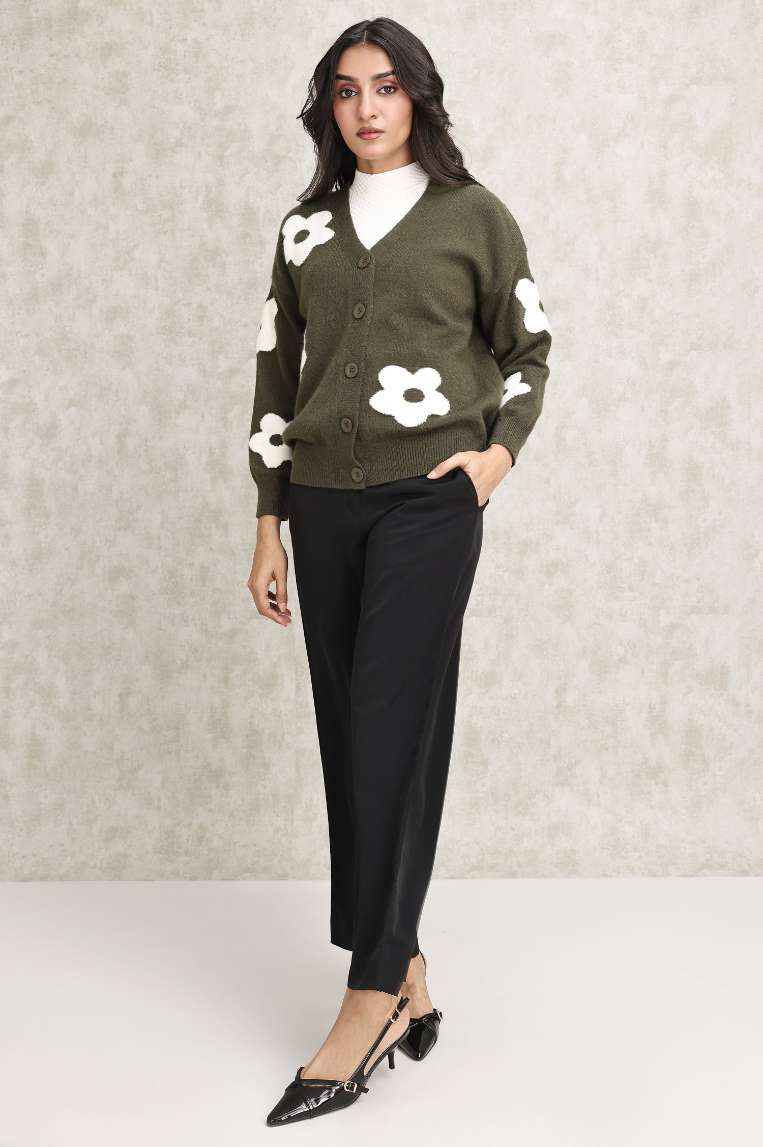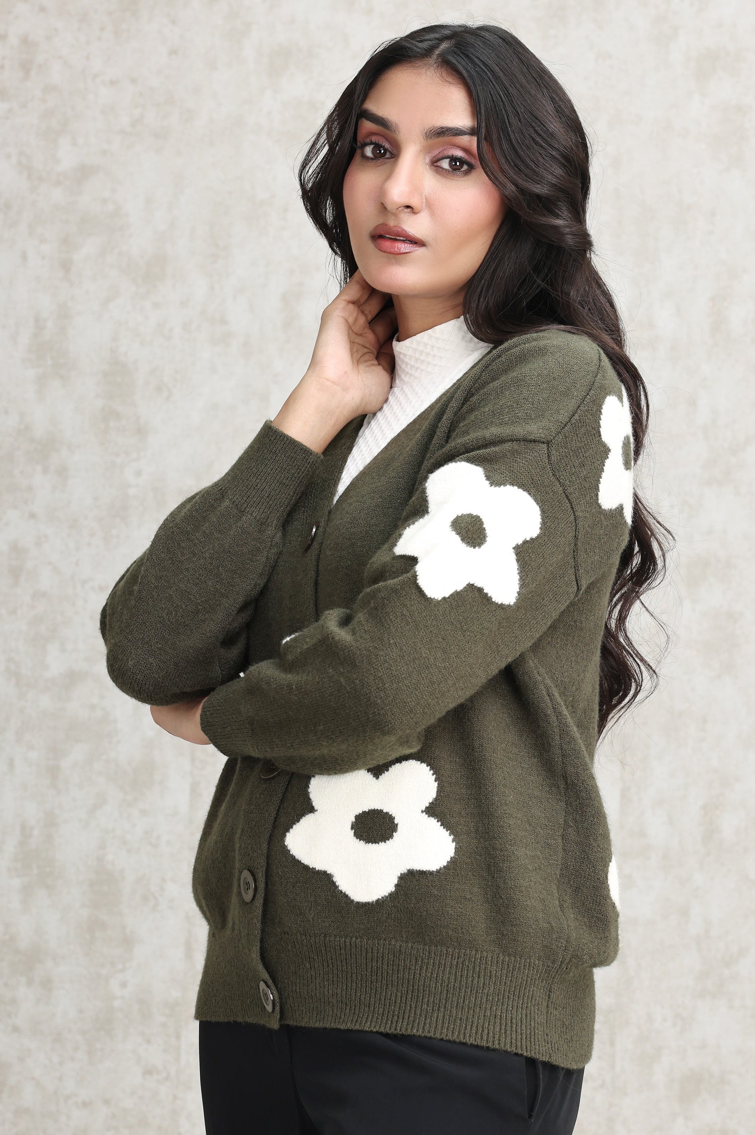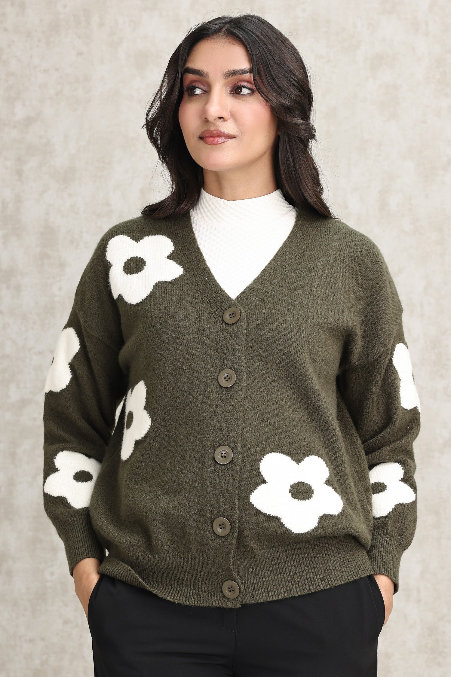 Add a touch of charm to your wardrobe with this floral knit cardigan. Crafted from a soft, breathable fabric, it features a button-down front, V-neckline, and cozy relaxed fit. The vibrant floral pattern enhances its appeal, making it perfect for layering over casual or semi-formal outfits.