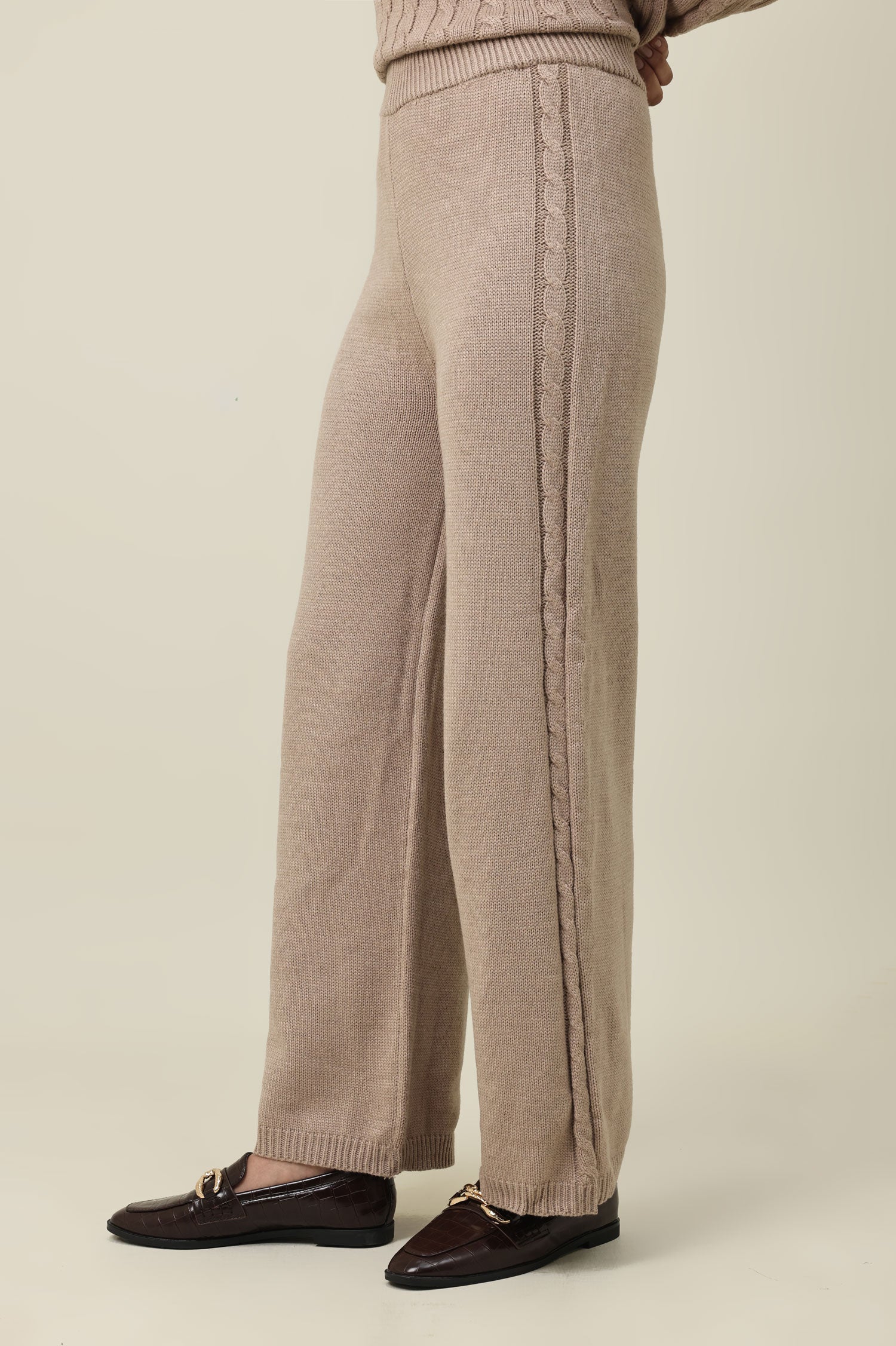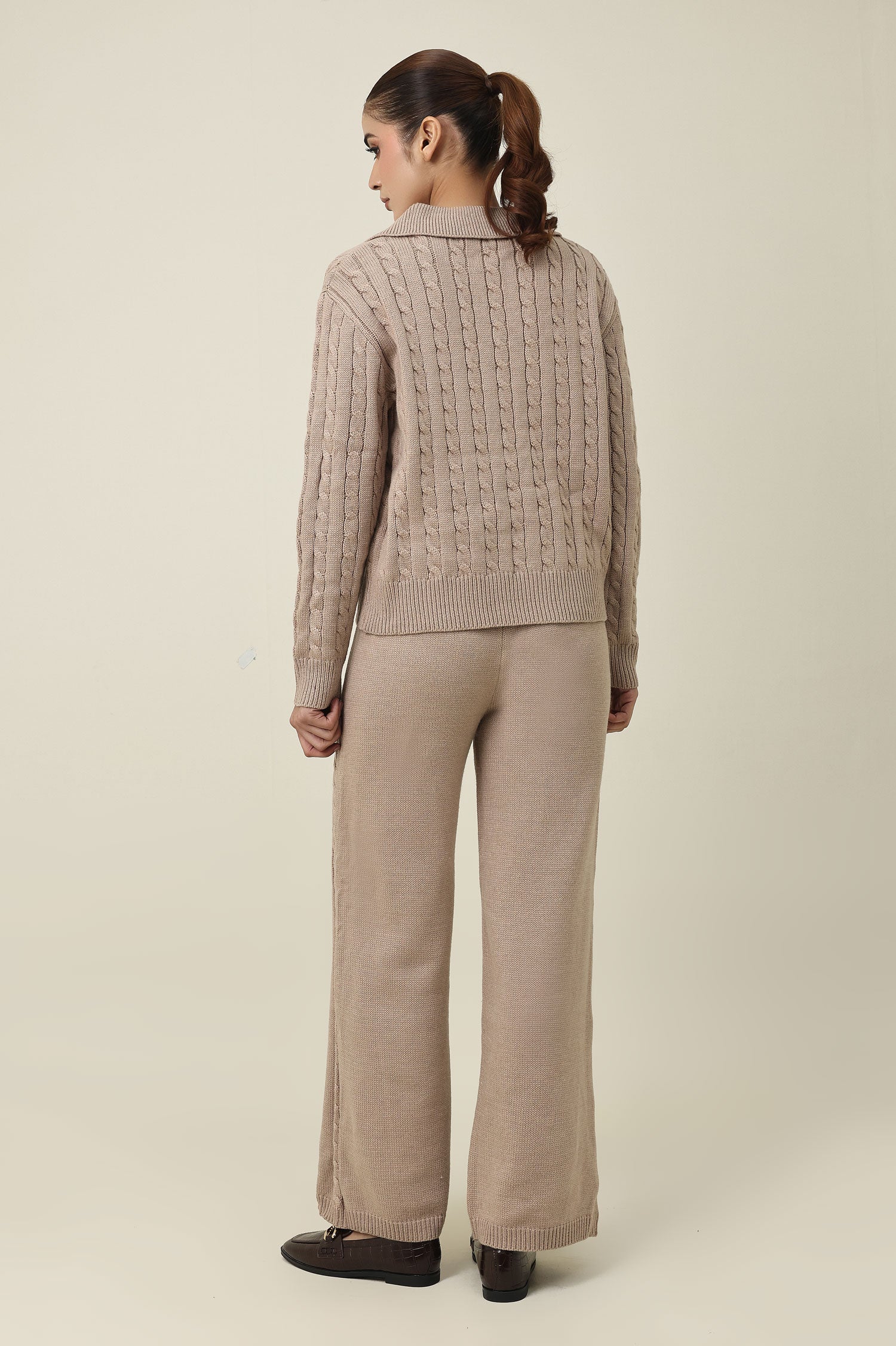 Features a ribbed-knit finish with prominent cable patterns running throughout. The collared neckline adds a heritage touch, paired with clean wide-leg trousers. A seamless choice for cool-weather layering.