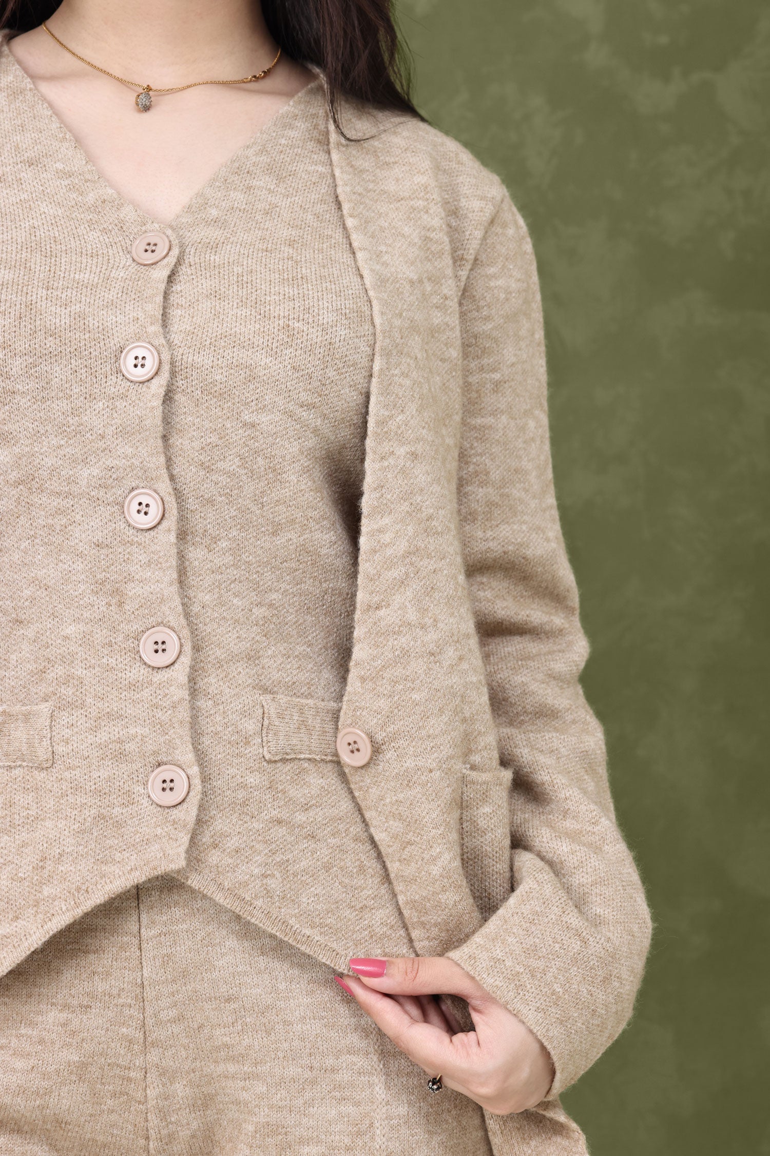 Features a classic v-neck vest layered under a soft jacket.
