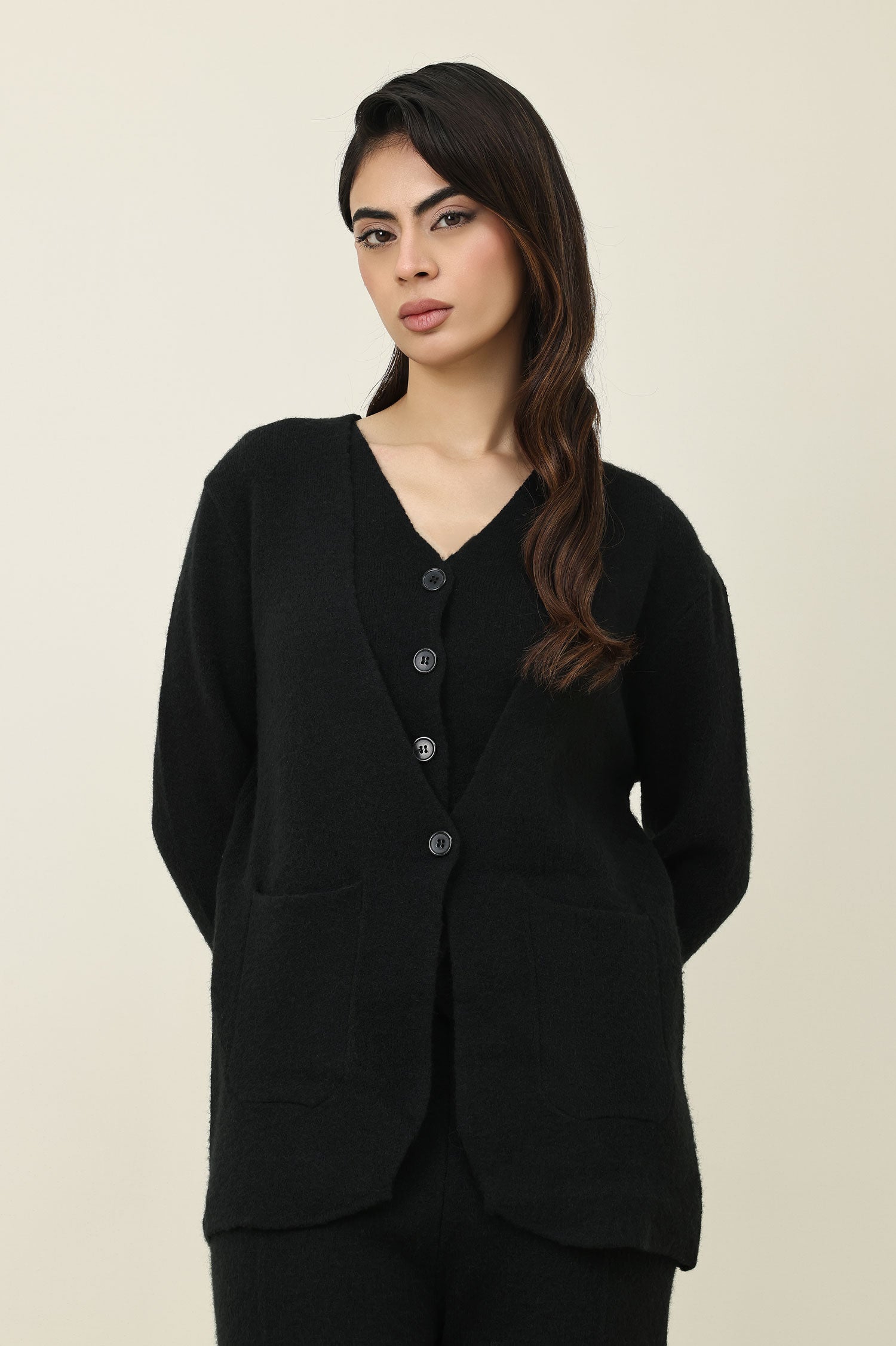 Features a classic v-neck vest layered under a soft jacket.