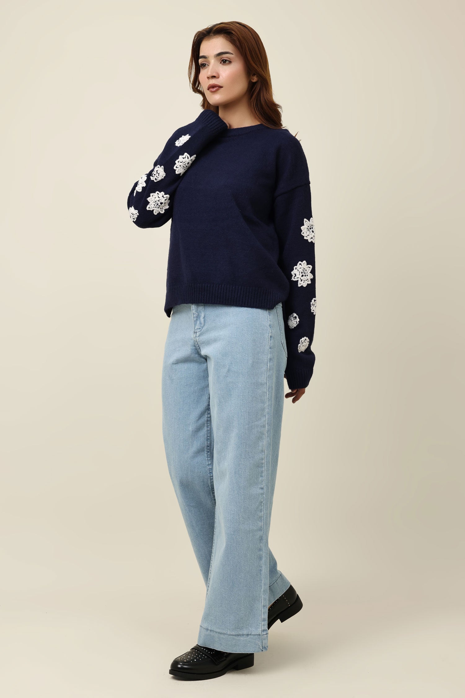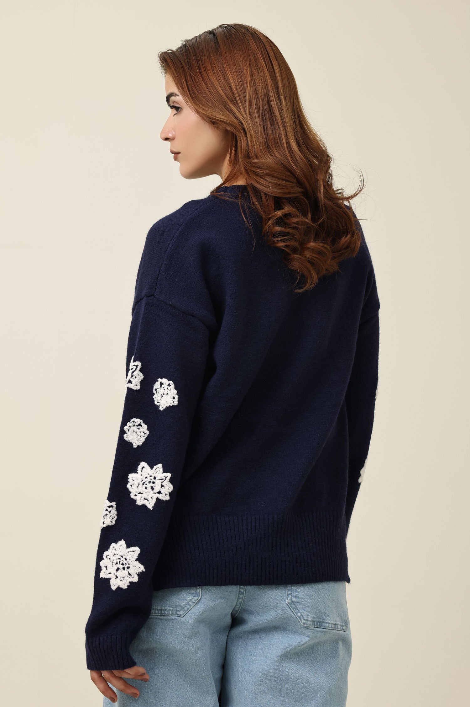 This sweater features delicately placed floral appliqués along the sleeves for an elevated tactile detail. The relaxed silhouette and ribbed finishes create a balanced, comfortable shape. designed to blend minimal structure with intricate embellishment, it brings a refined artisanal touch to everyday layering.
