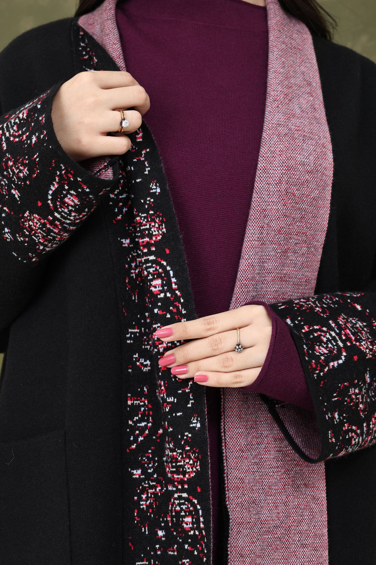 Flowing silhouette sweater designed with understated detail. Intricate pattern highlights the wide cuffs and front border. Tailored for grace and easy sophistication.