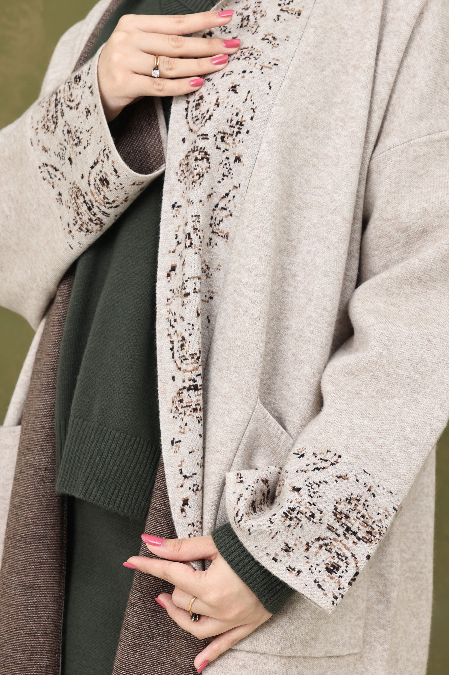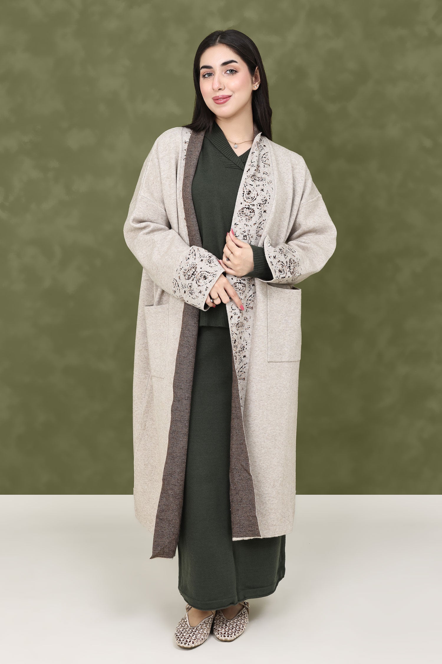 Flowing silhouette designed with understated detail. Intricate embroidery highlights the wide cuffs and inner border. Tailored for grace and easy sophistication.