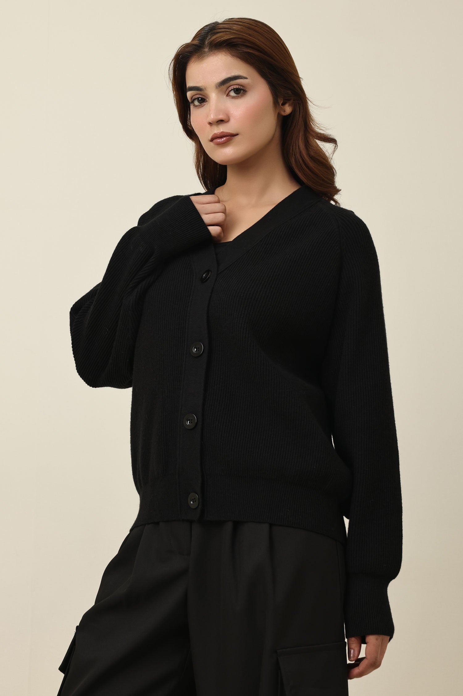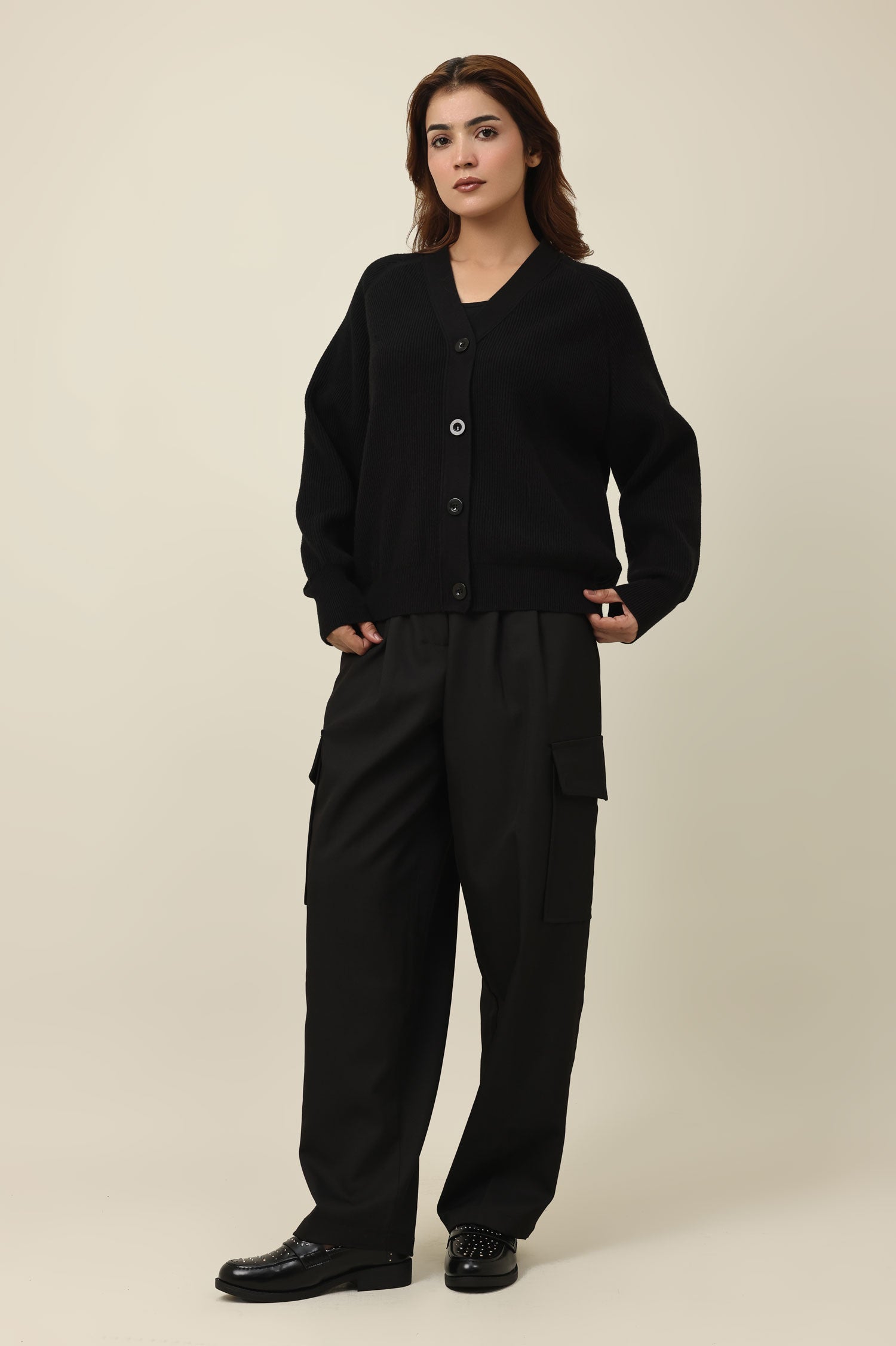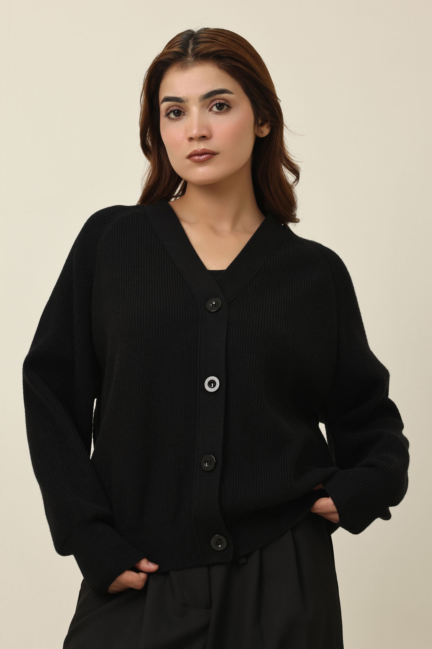 This cardigan features a gentle drape that enhances its relaxed silhouette. The deep v-neckline and minimal button fastening create a clean, timeless structure with slightly dropped sleeves and a smooth hem finish, it blends comfort with refined simplicity for versatile everyday layering.