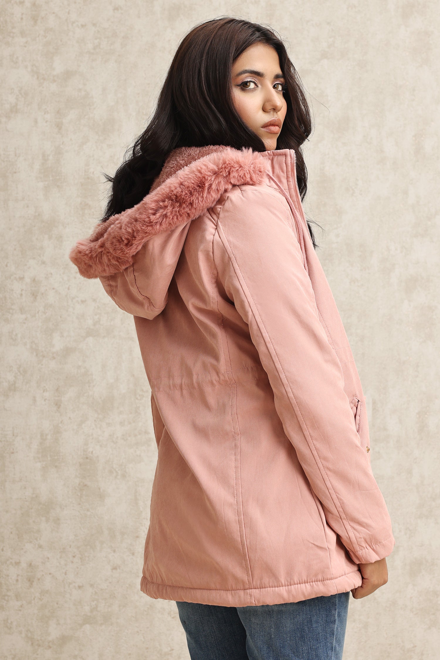 Stay stylish and warm with this hooded jacket featuring adjustable drawstrings and a zip-up closure. A perfect blend of practicality and elegance for your casual outings.