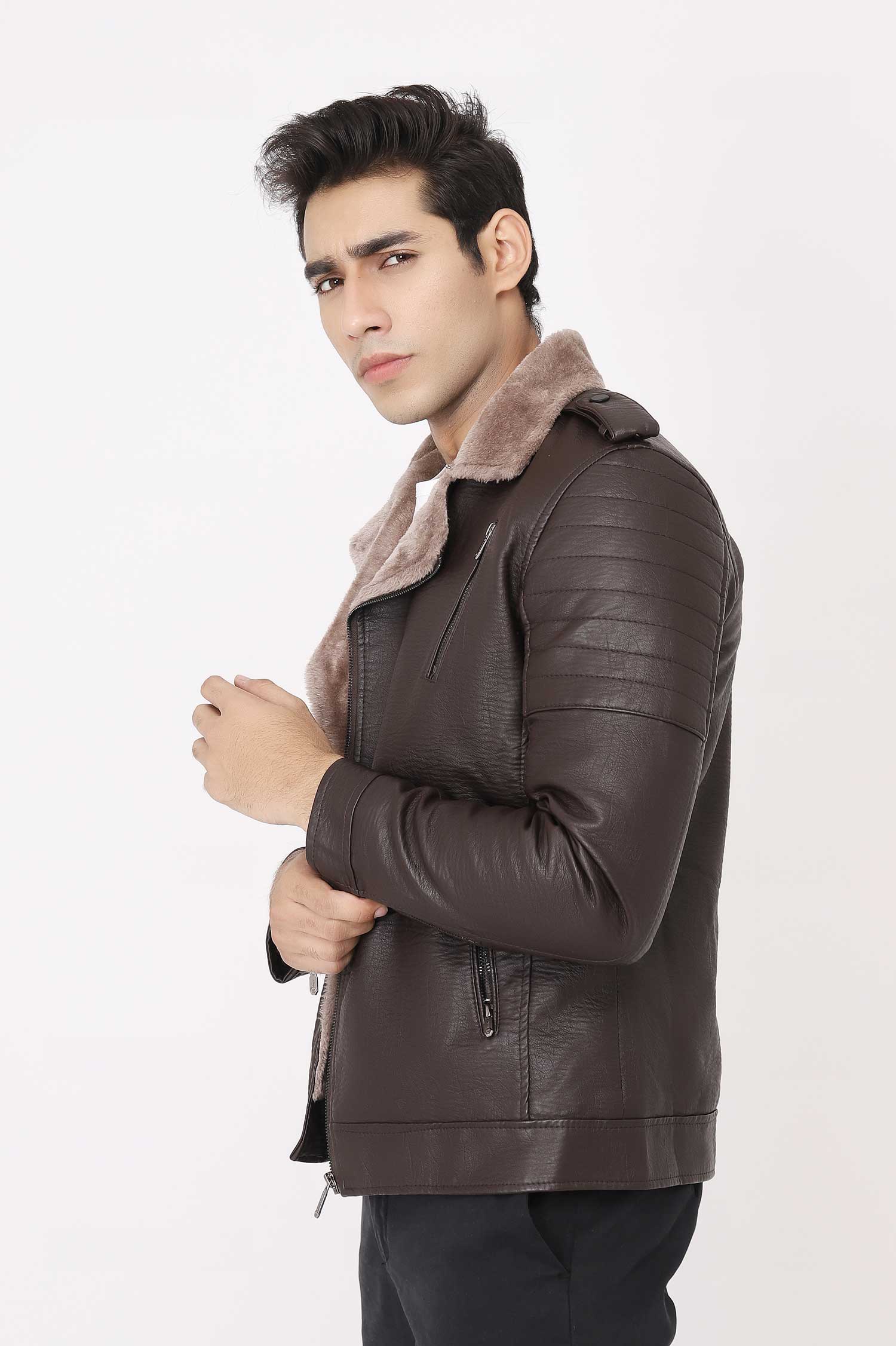 SHEARLING-LINED FAUX LEATHER BIKER JACKET-COFFEE
