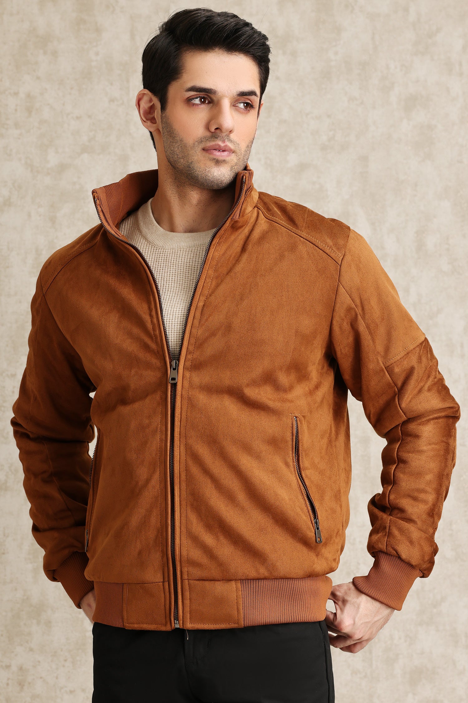 A refined bomber jacket crafted with a sleek suede finish, featuring a zip-up design and ribbed detailing. Its tailored fit and soft texture exude timeless sophistication and modern charm.