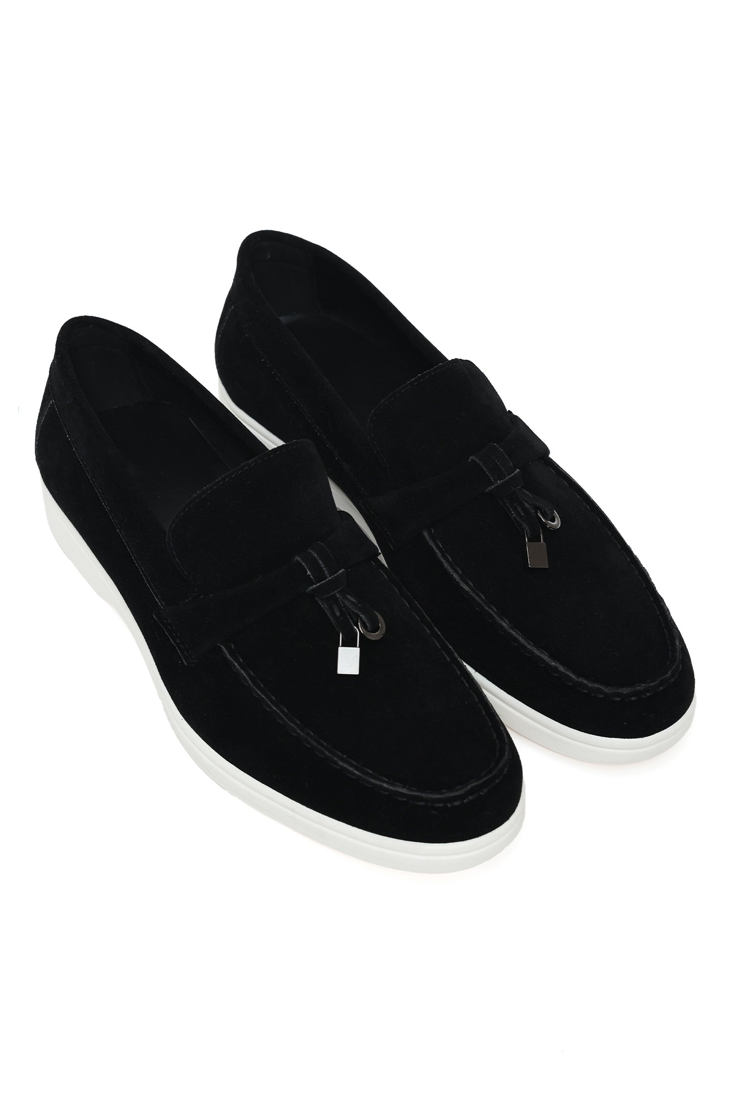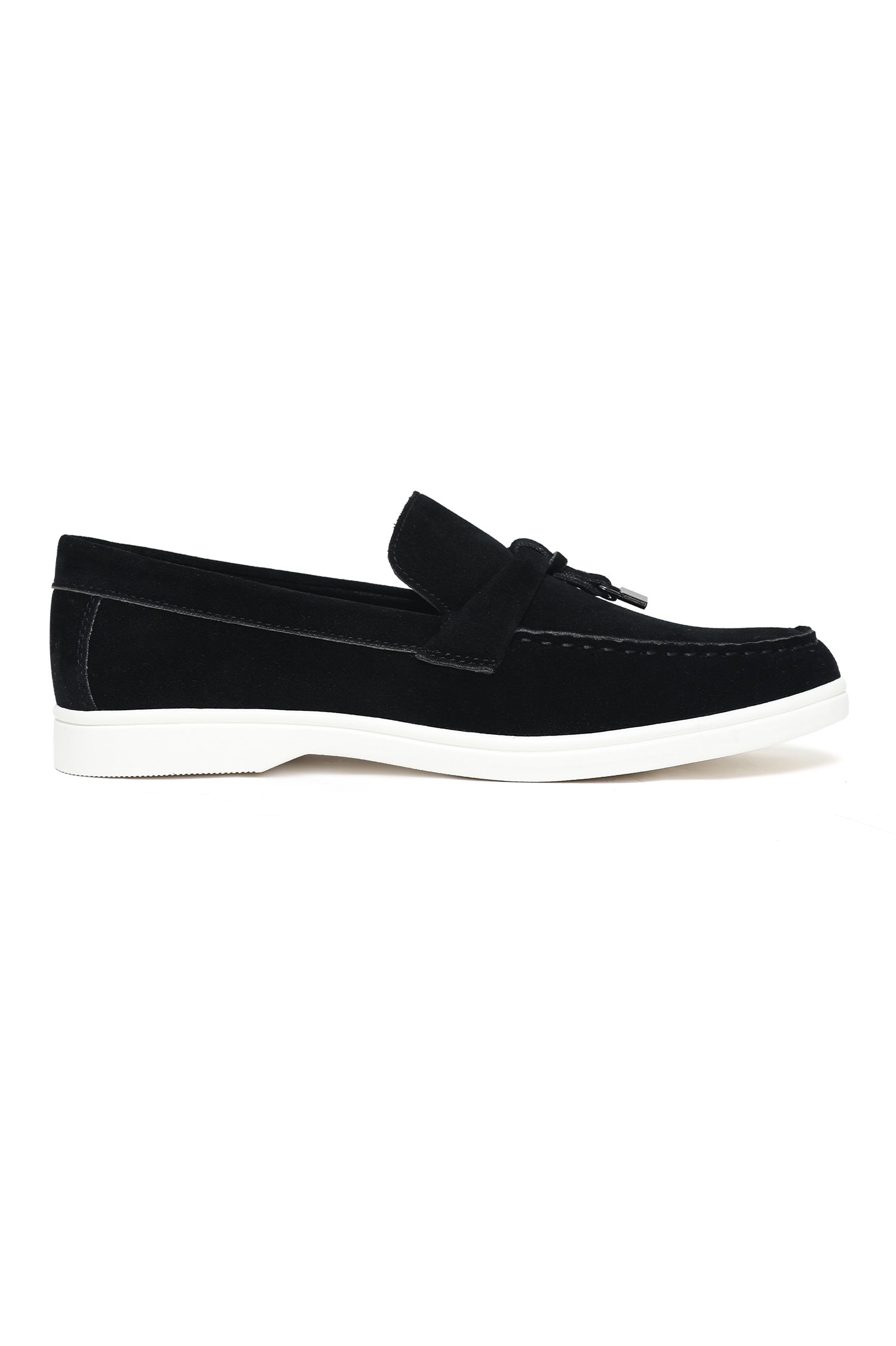 Sophisticated suede loafers featuring a minimalist design with a stylish tassel enhanced by metallic embellishments. Crafted for superior comfort, they include a soft lining and a lightweight contrast sole, making them ideal for effortless day-to-evening transitions. A timeless choice for adding a refined touch to casual or smart-casual outfits.