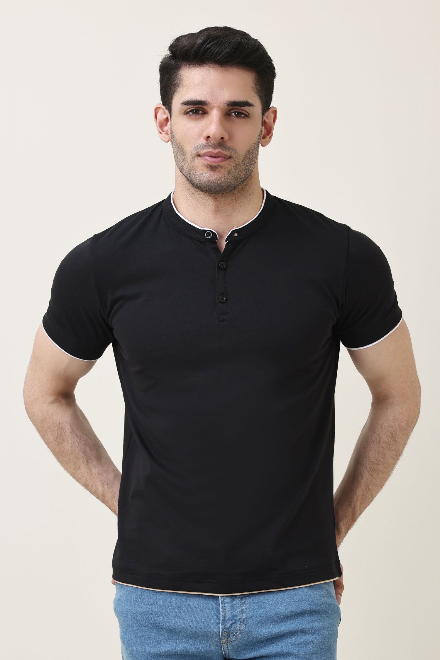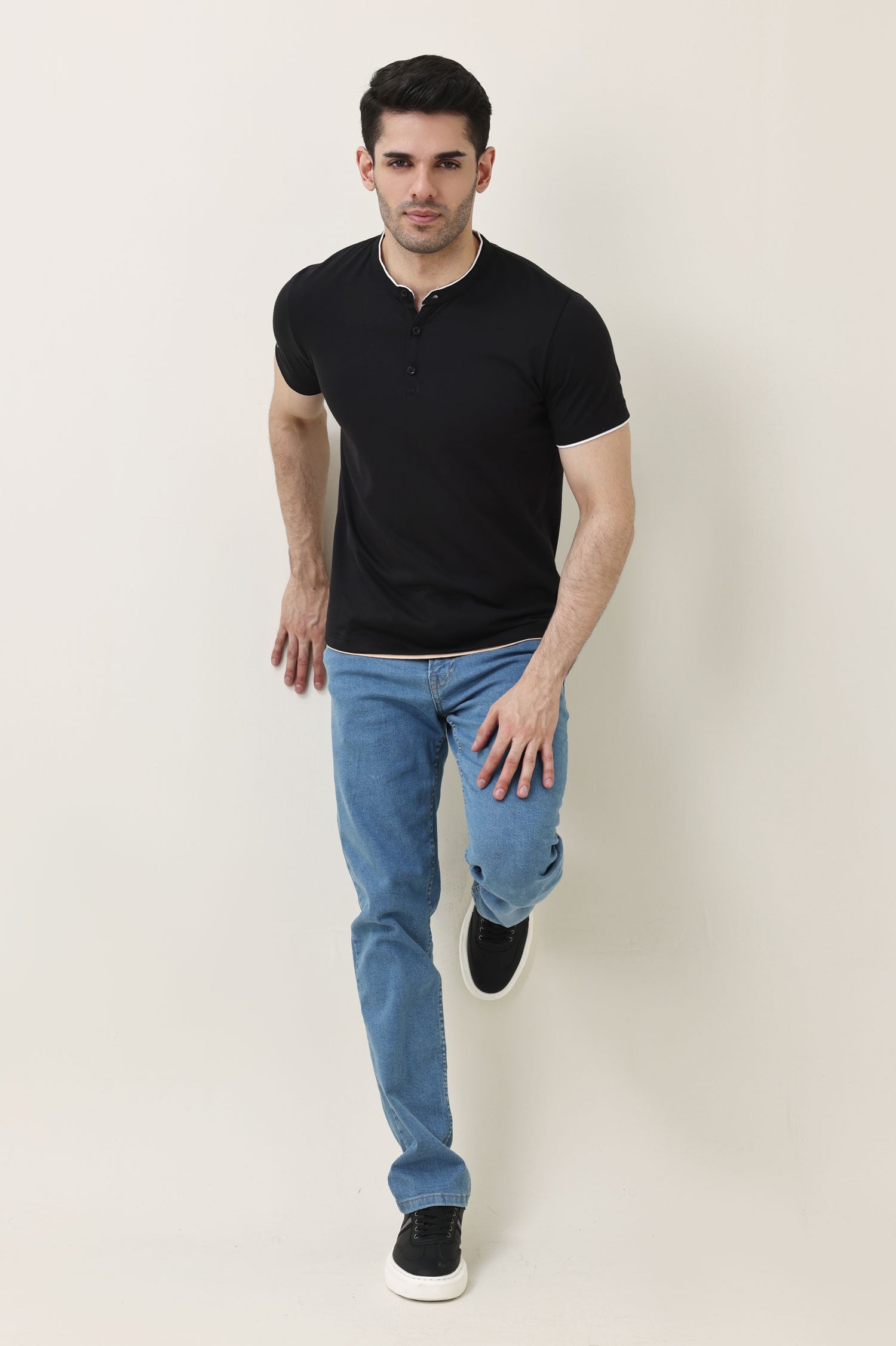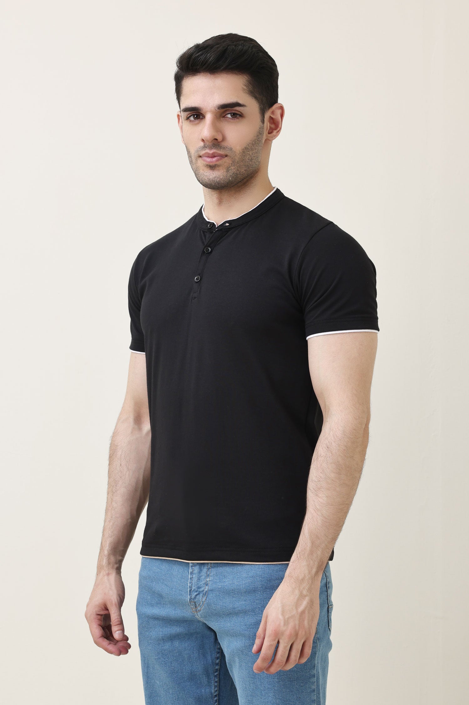 Trim sleeve binding defines a crisp metropolitan silhouette.