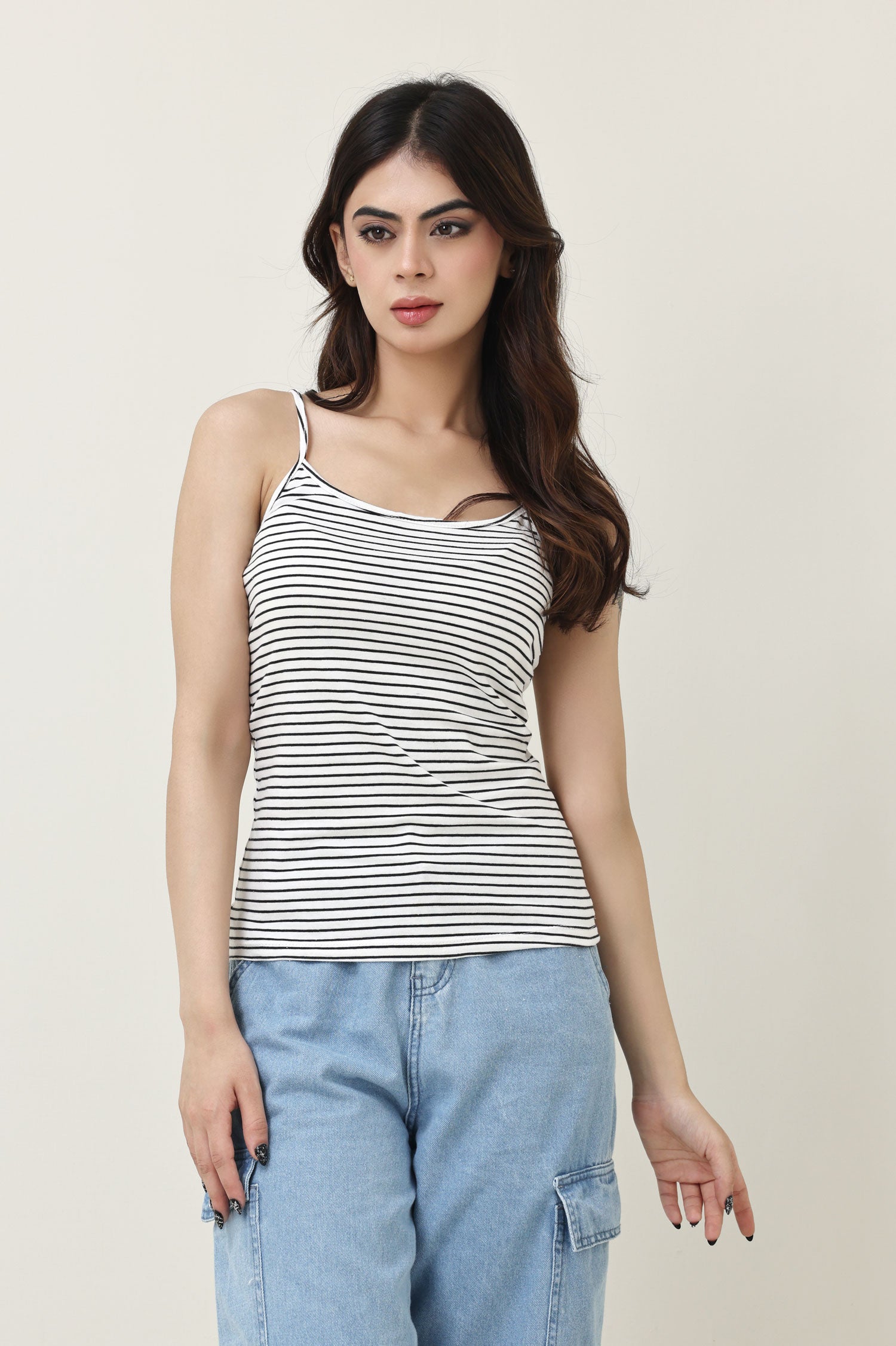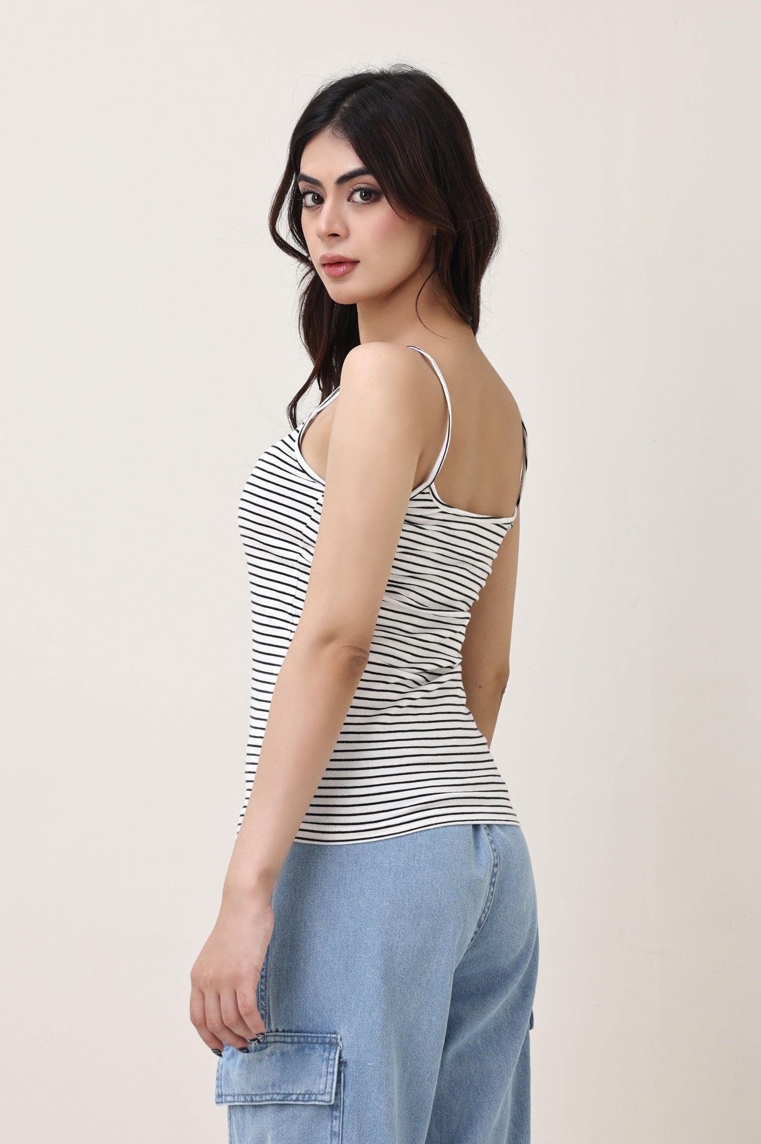 Cut with body-hugging stretch and easy neckline. Micro stripes offer an athletic edge to basics. Refined yet playful styling versatility.