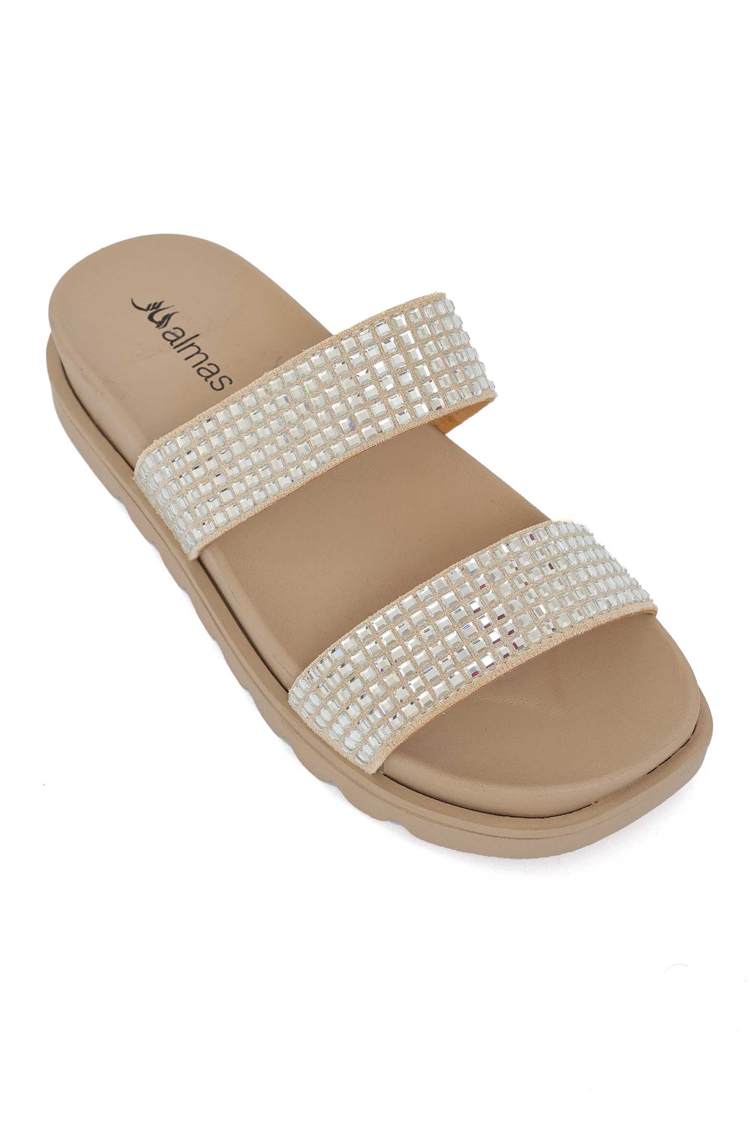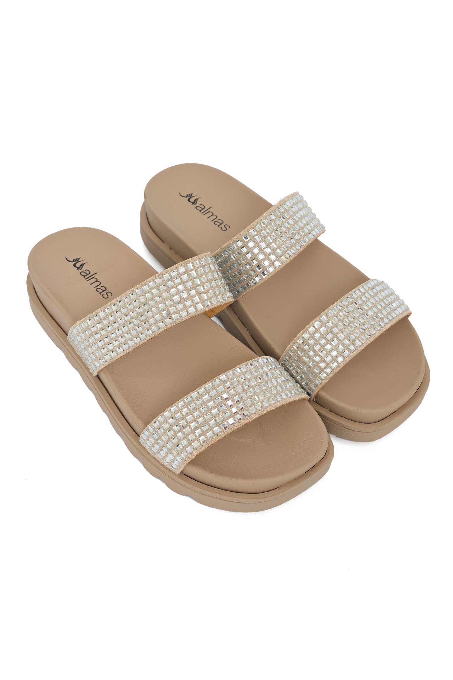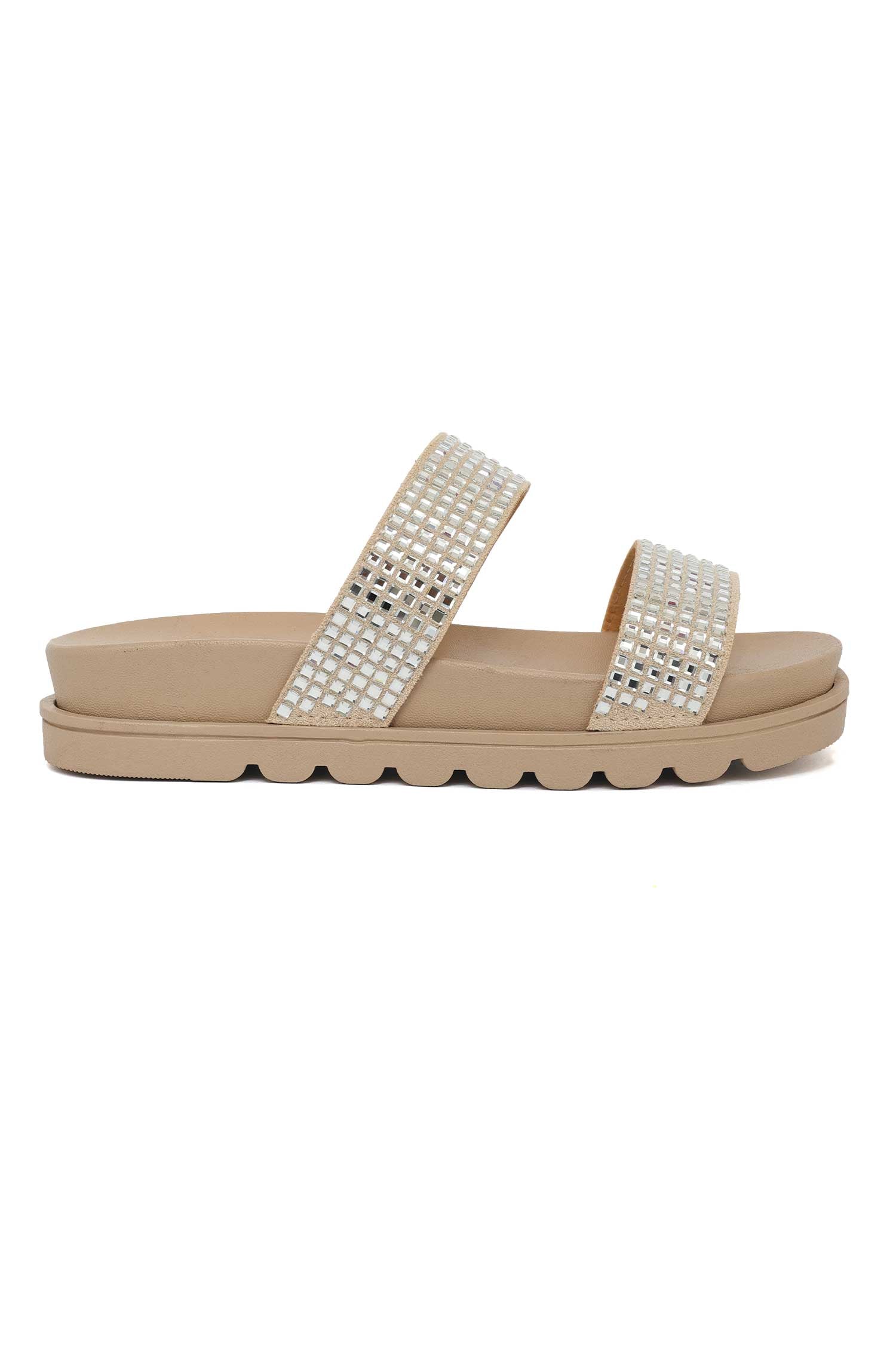 Glamorous meets everyday wear in these sparkle-strap slides. Lightweight, comfortable, and easy to slip on, featuring two gleaming straps that catch the light from every angle. Ideal for lounging by the pool, casual strolls, or weekend errand