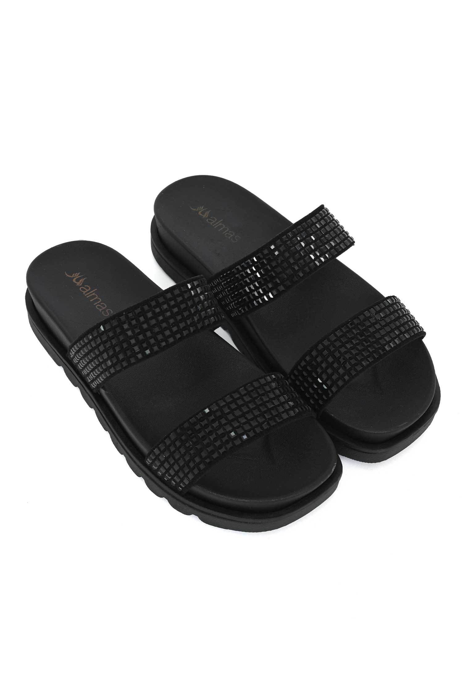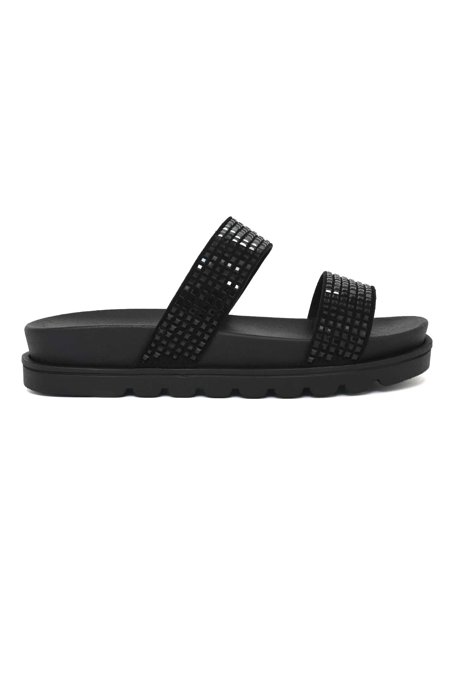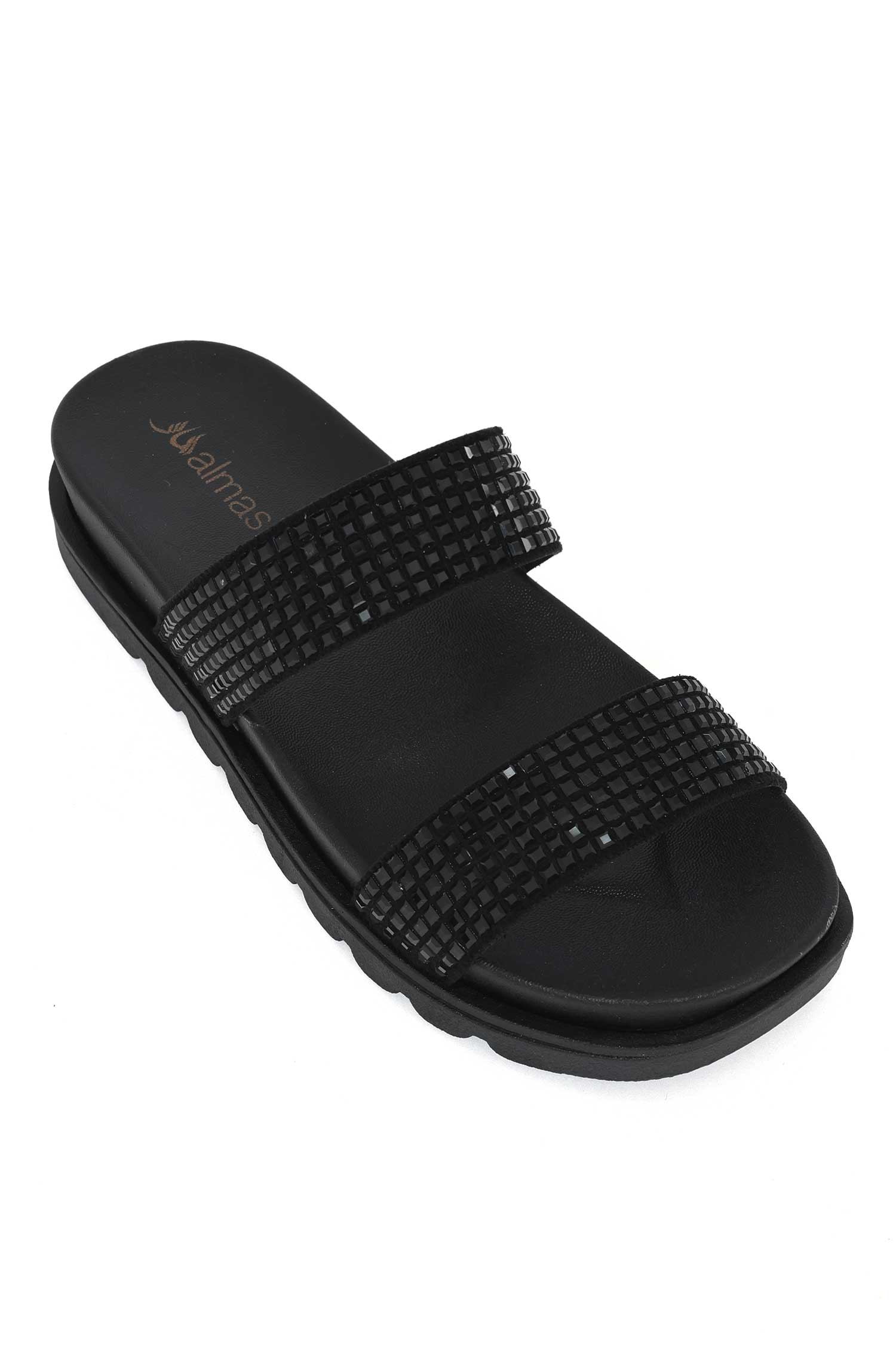 Glamorous meets everyday wear in these sparkle-strap slides. Lightweight, comfortable, and easy to slip on, featuring two gleaming straps that catch the light from every angle. Ideal for lounging by the pool, casual strolls, or weekend errand