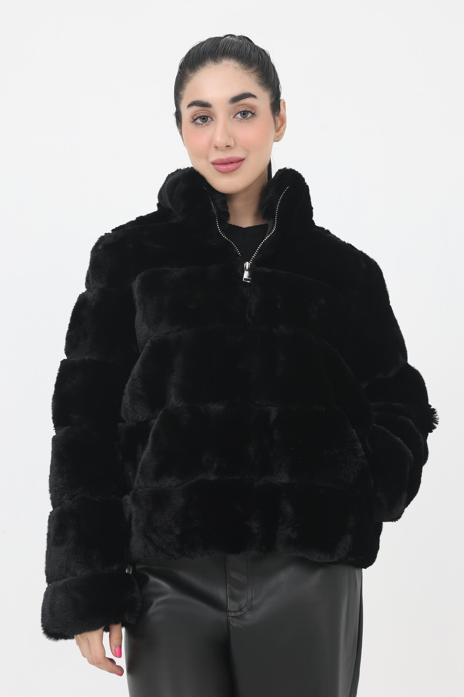 Faux fur coat with a lapel collar and long sleeves. Featuring front in-seam pockets, contrast interior lining.