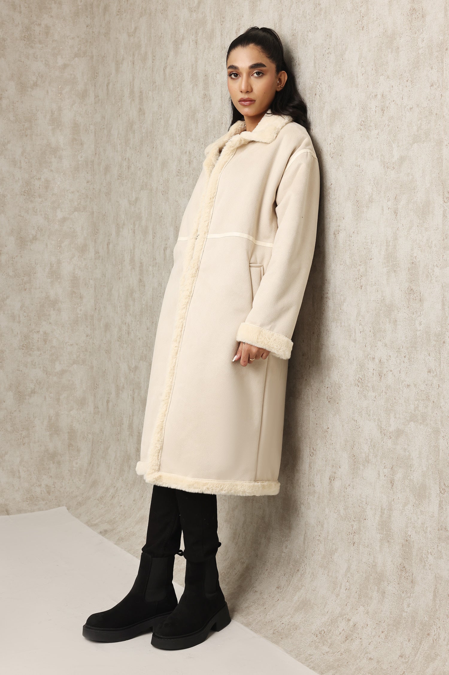Embrace timeless elegance with this longline coat featuring a soft shearling trim and tailored structure. Designed with streamlined seams, practical side pockets, and a sophisticated silhouette, this coat combines warmth and refined style for the perfect winter statement.