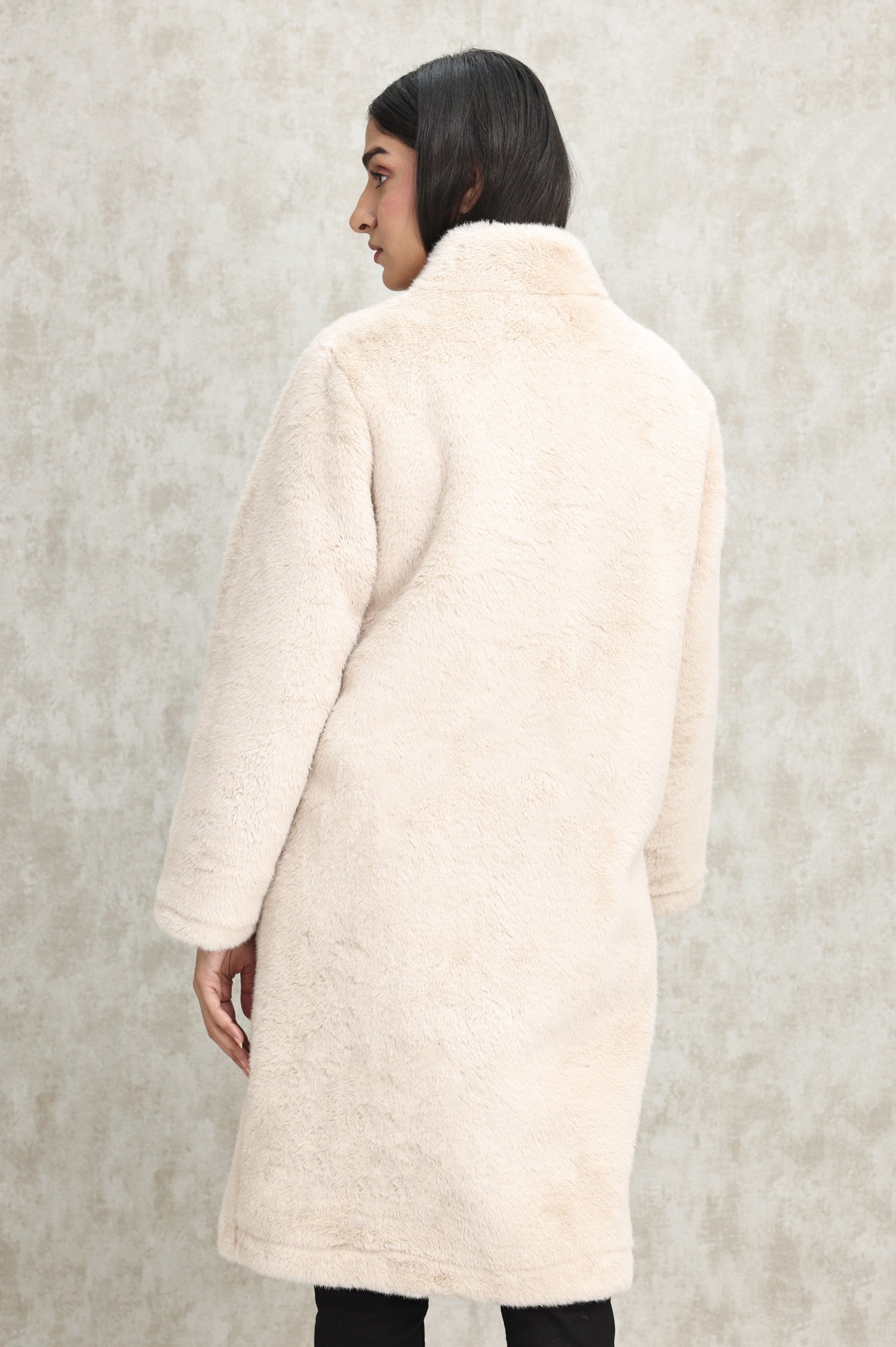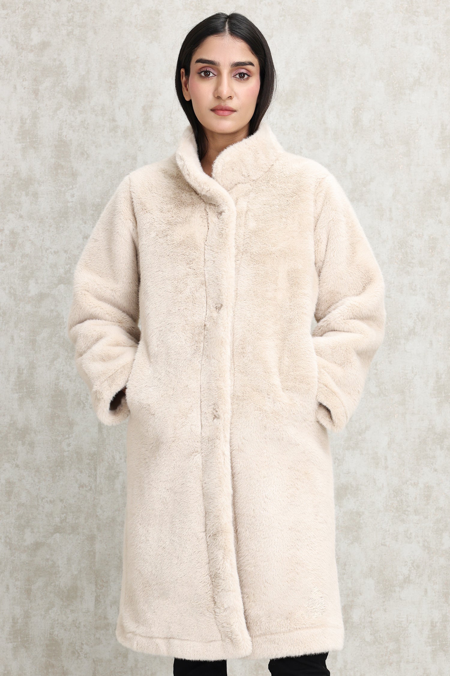 Step out in style with this velvety faux fur overcoat. Designed for ultimate comfort, it boasts a full-length cut, smooth lining, and deep pockets for functionality and elegance.