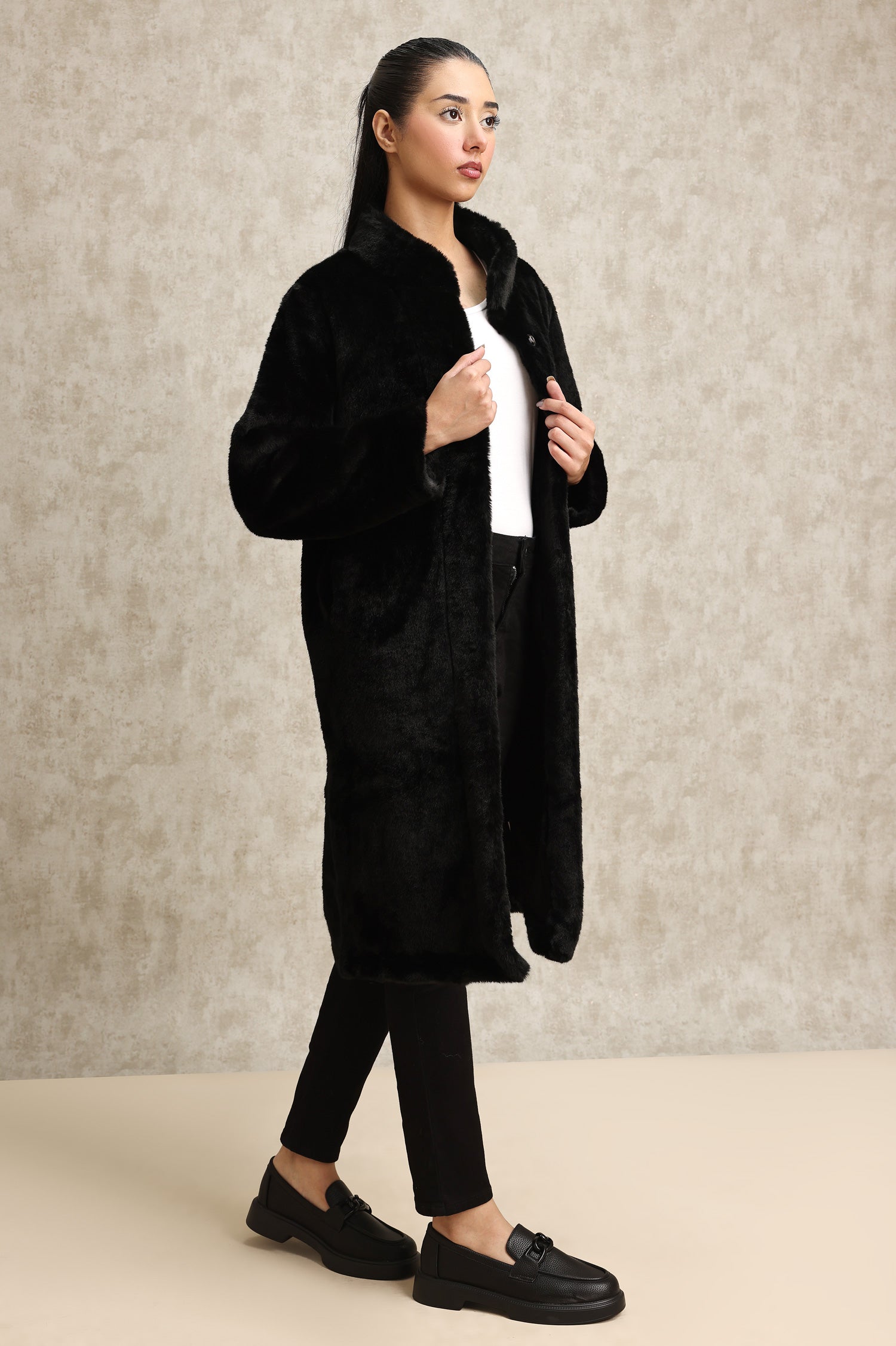 VELVETY FAUX FUR OVERCOAT-BLACK