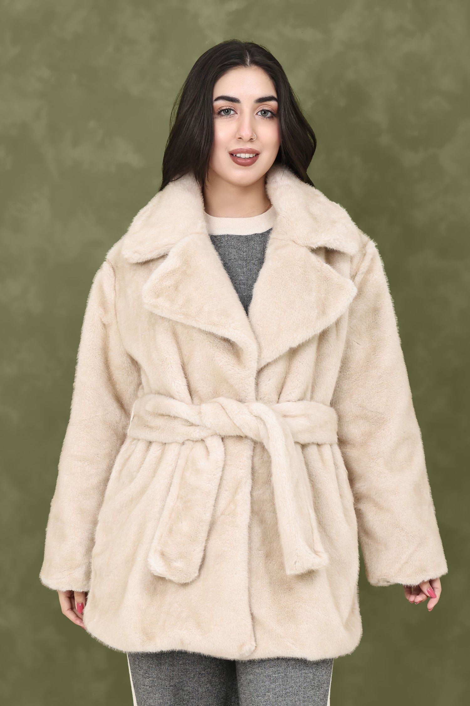 Short faux fur jacket with tie belt and exaggerated collar lapels.