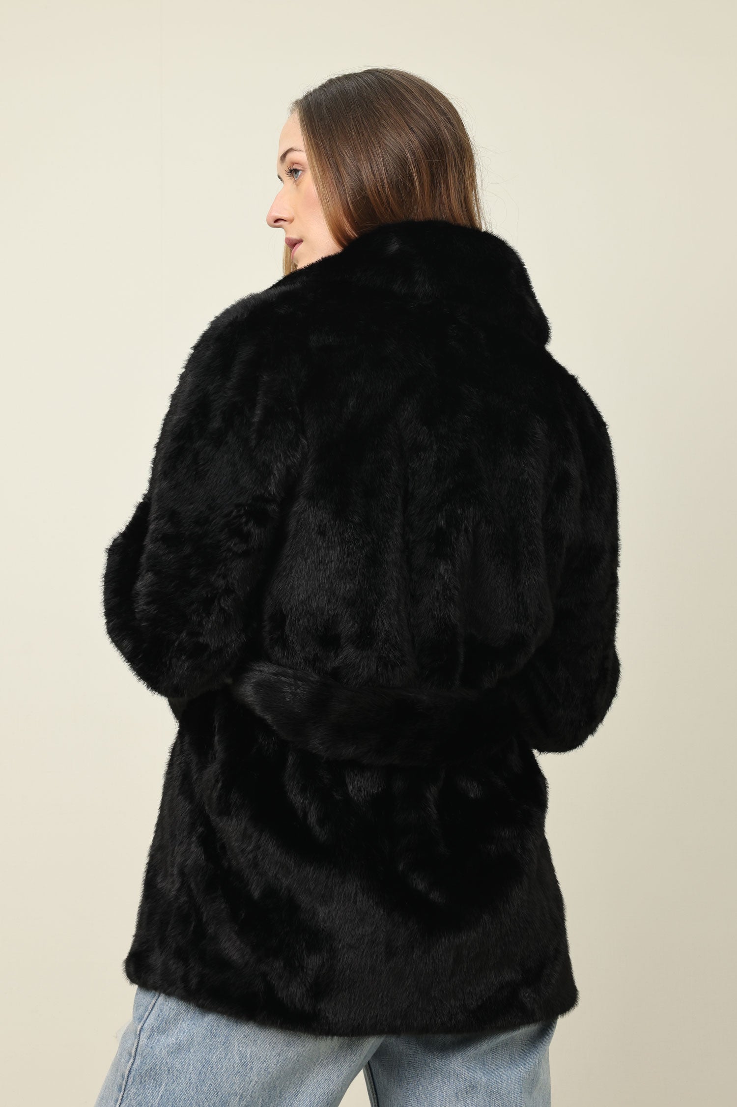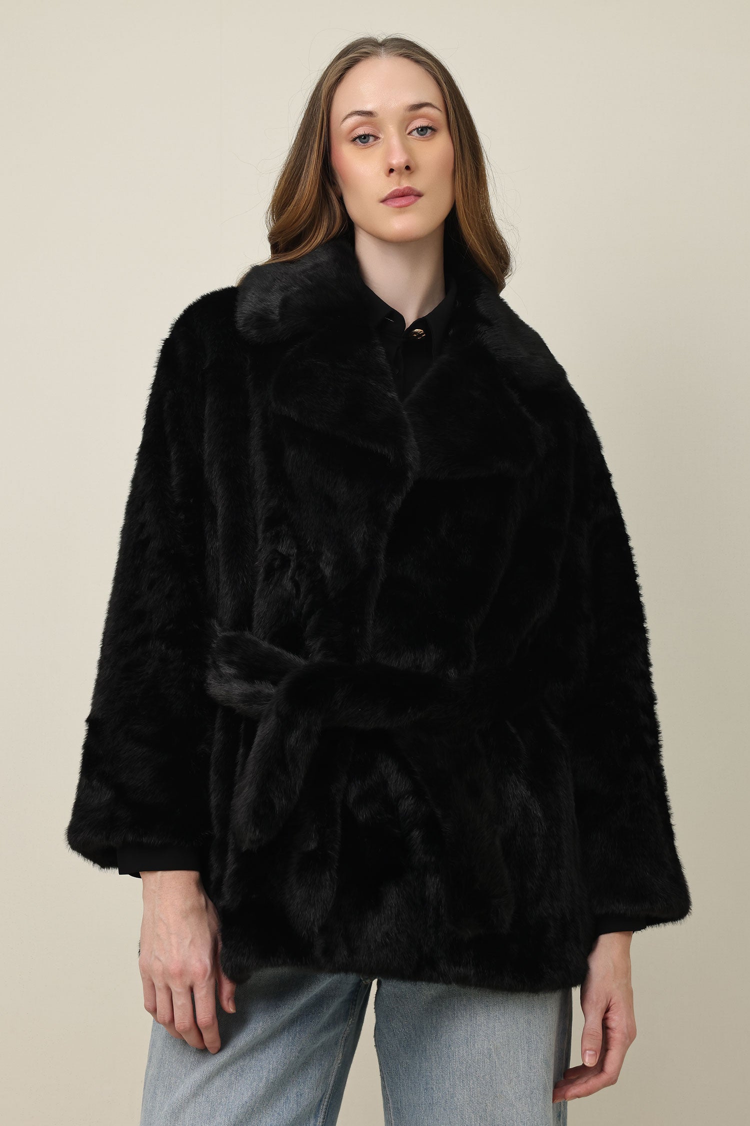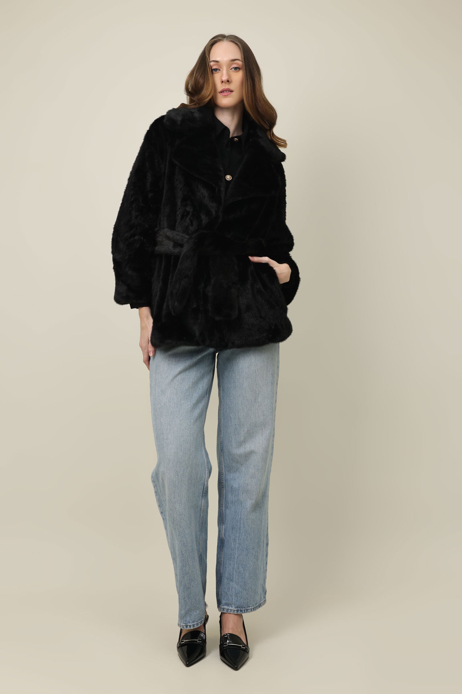 Short faux fur jacket with tie belt and exaggerated collar lapels.