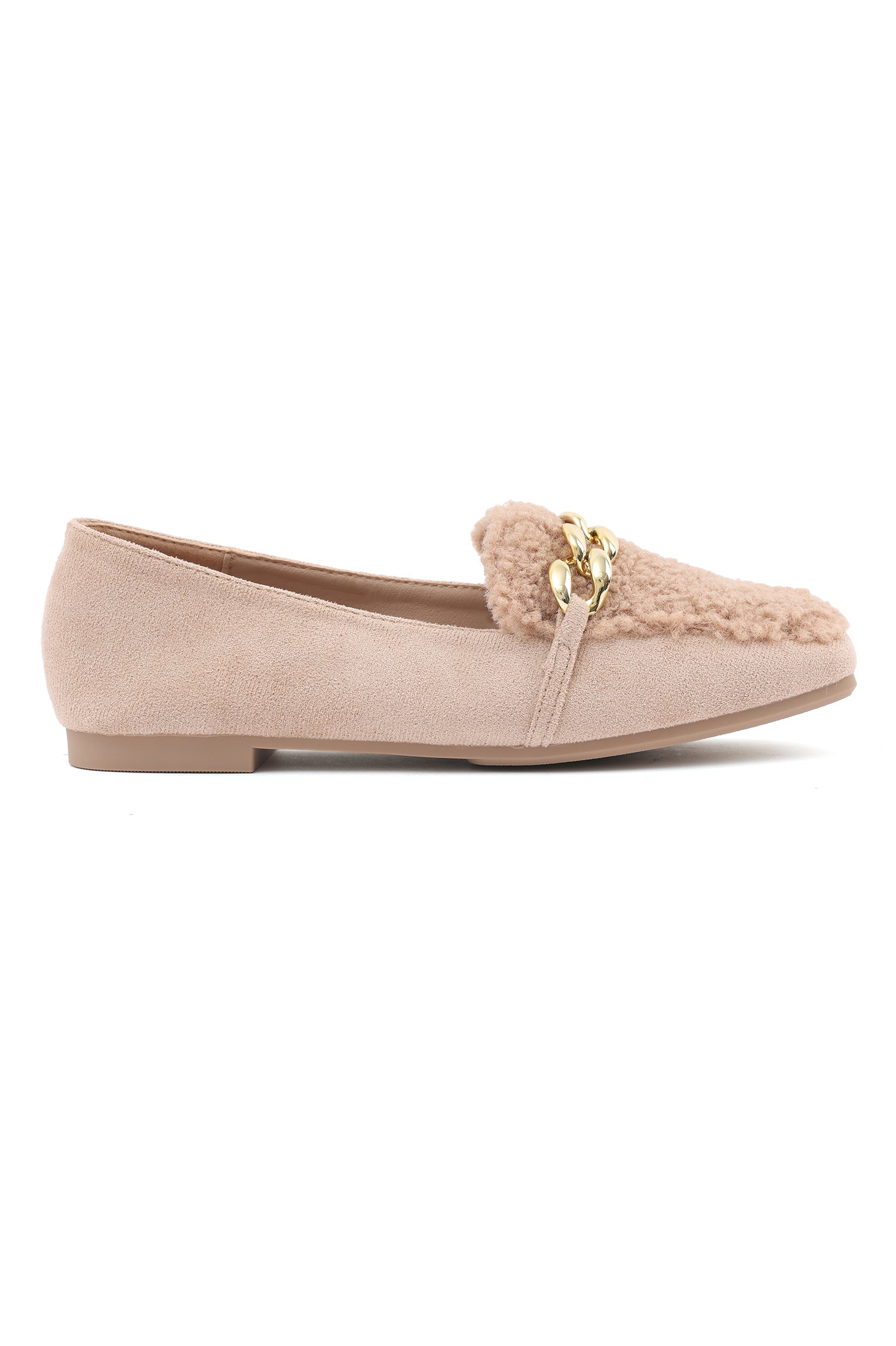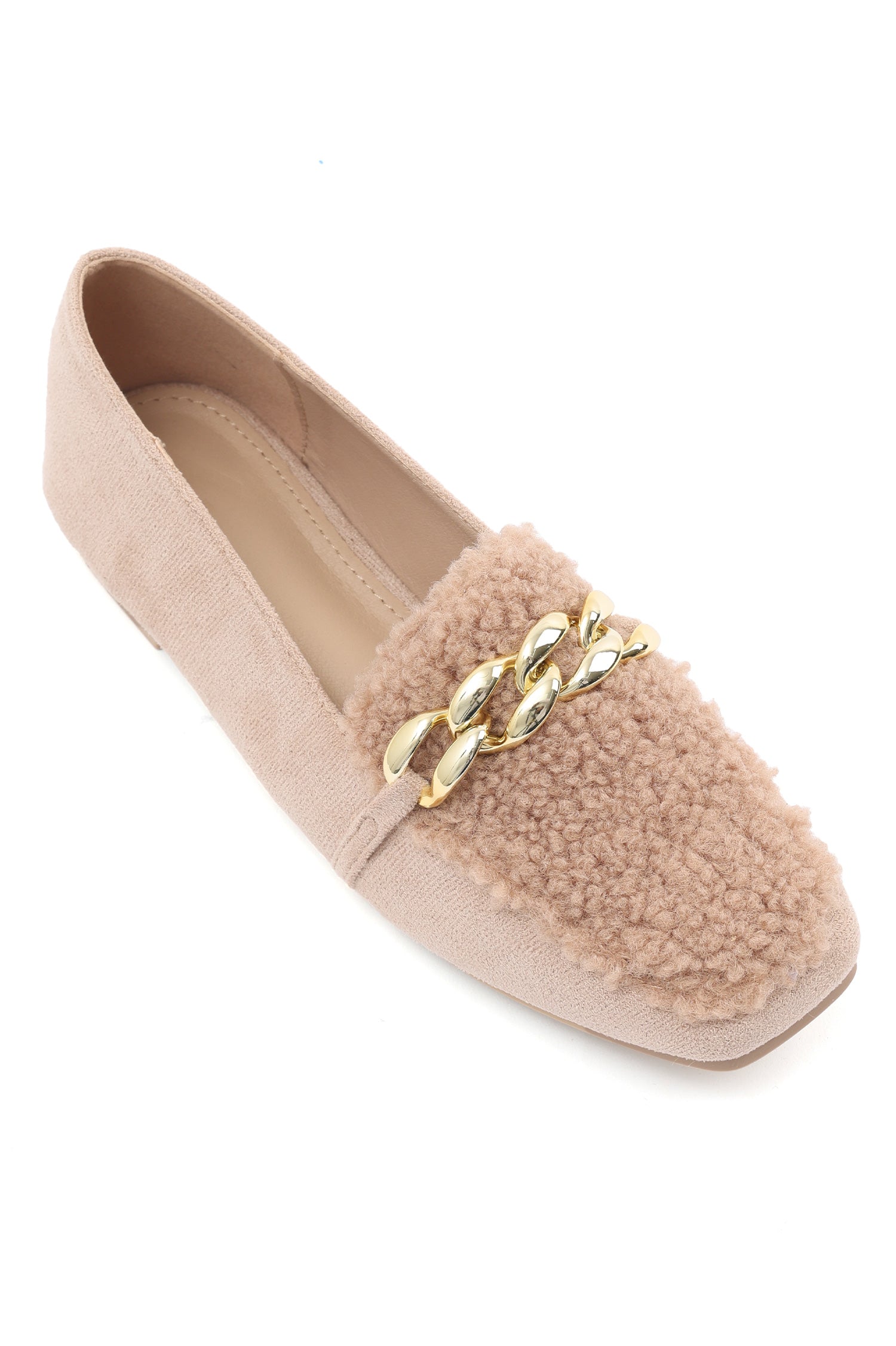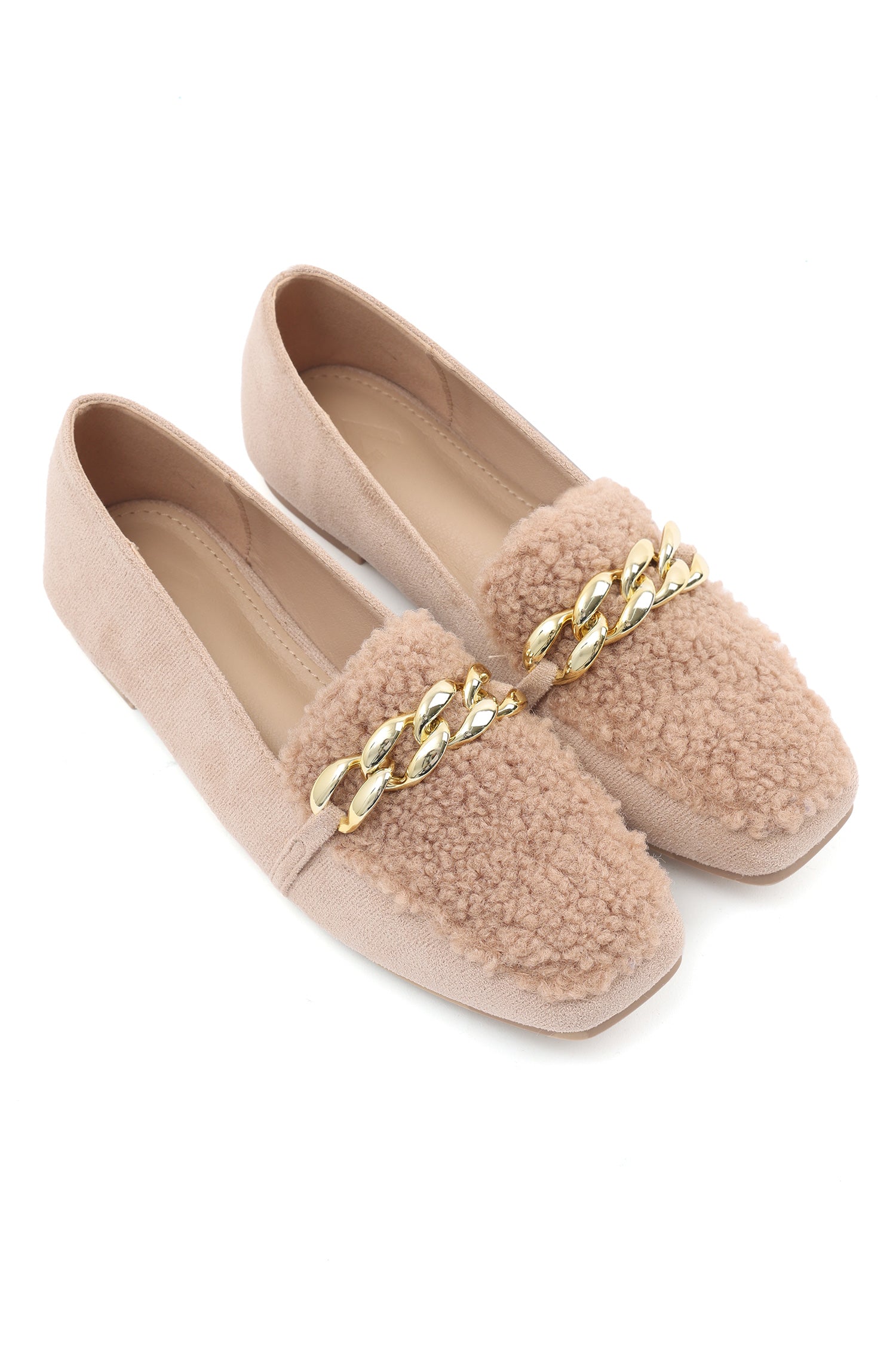 Embrace cozy sophistication with these plush loafers, featuring a luxe chain accent for added charm. The soft, textured material offers ultimate comfort, making them an elegant choice for day-to-night wear. Perfectly blending style and ease, these loafers are a must-have addition to your wardrobe.
