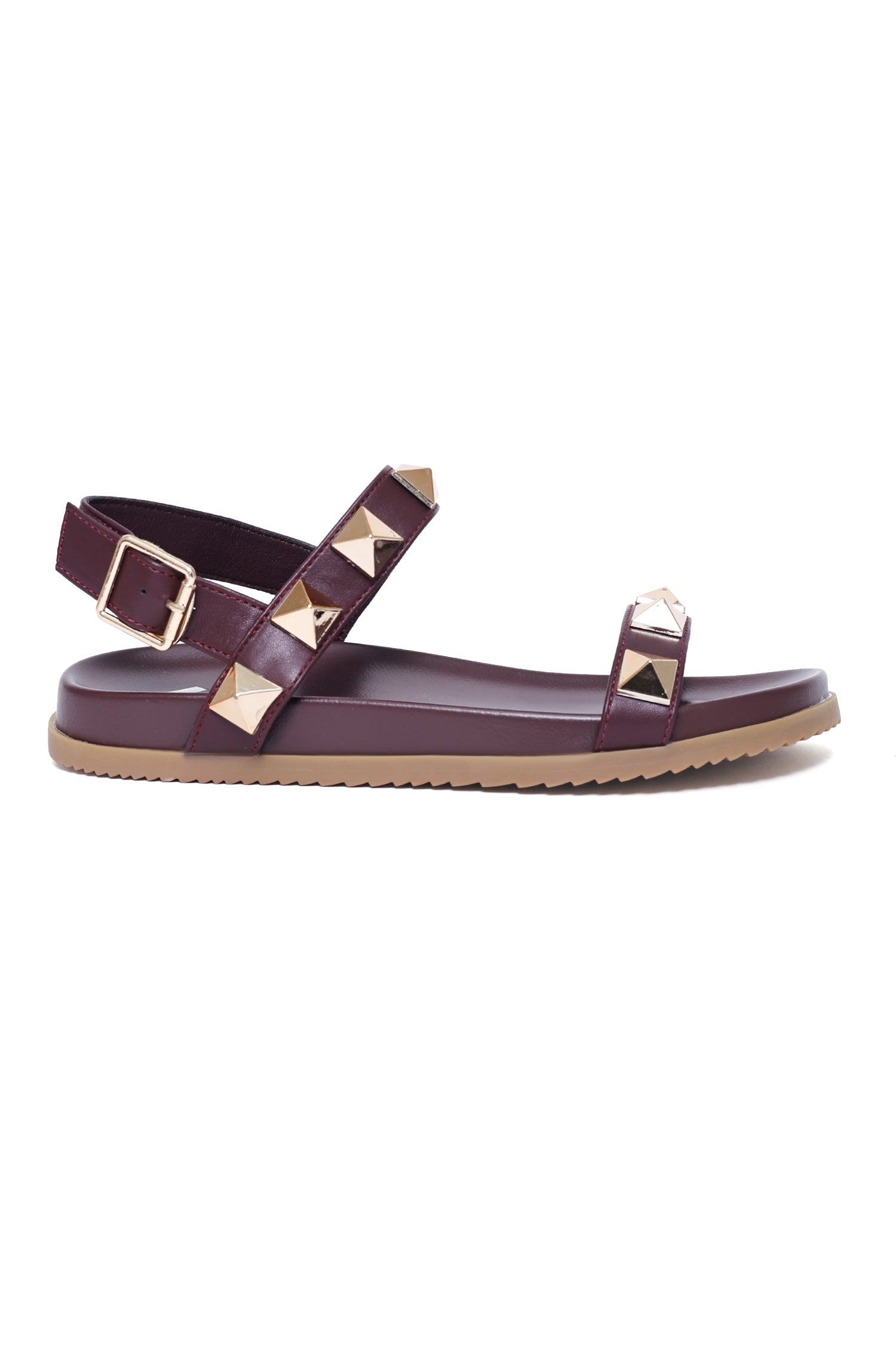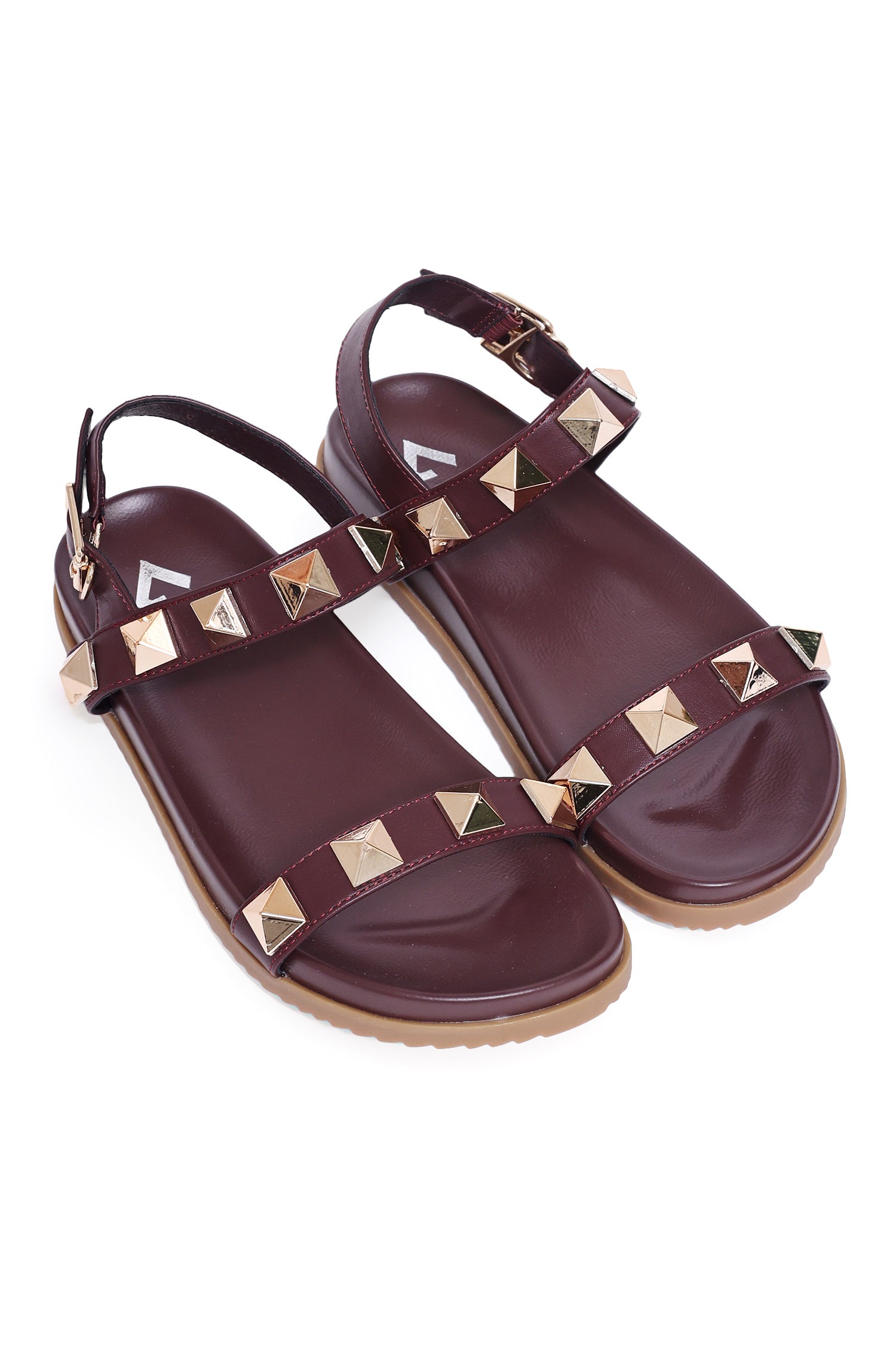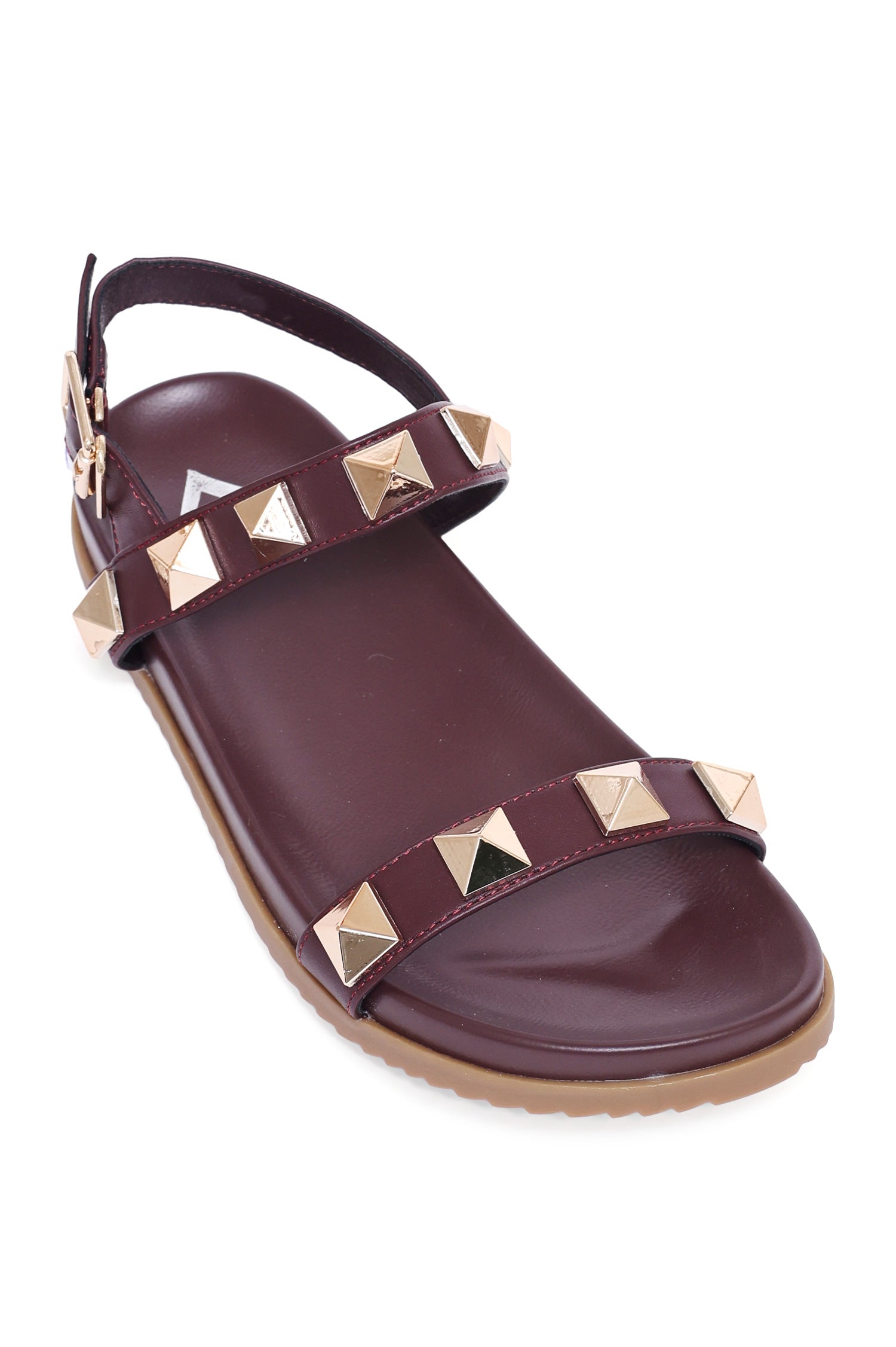 Elevate your edgy-chic style with these studded sandals, featuring sleek straps adorned with bold pyramid studs. The cushioned footbed ensures supreme comfort, while the secure buckle closure provides a perfect fit.