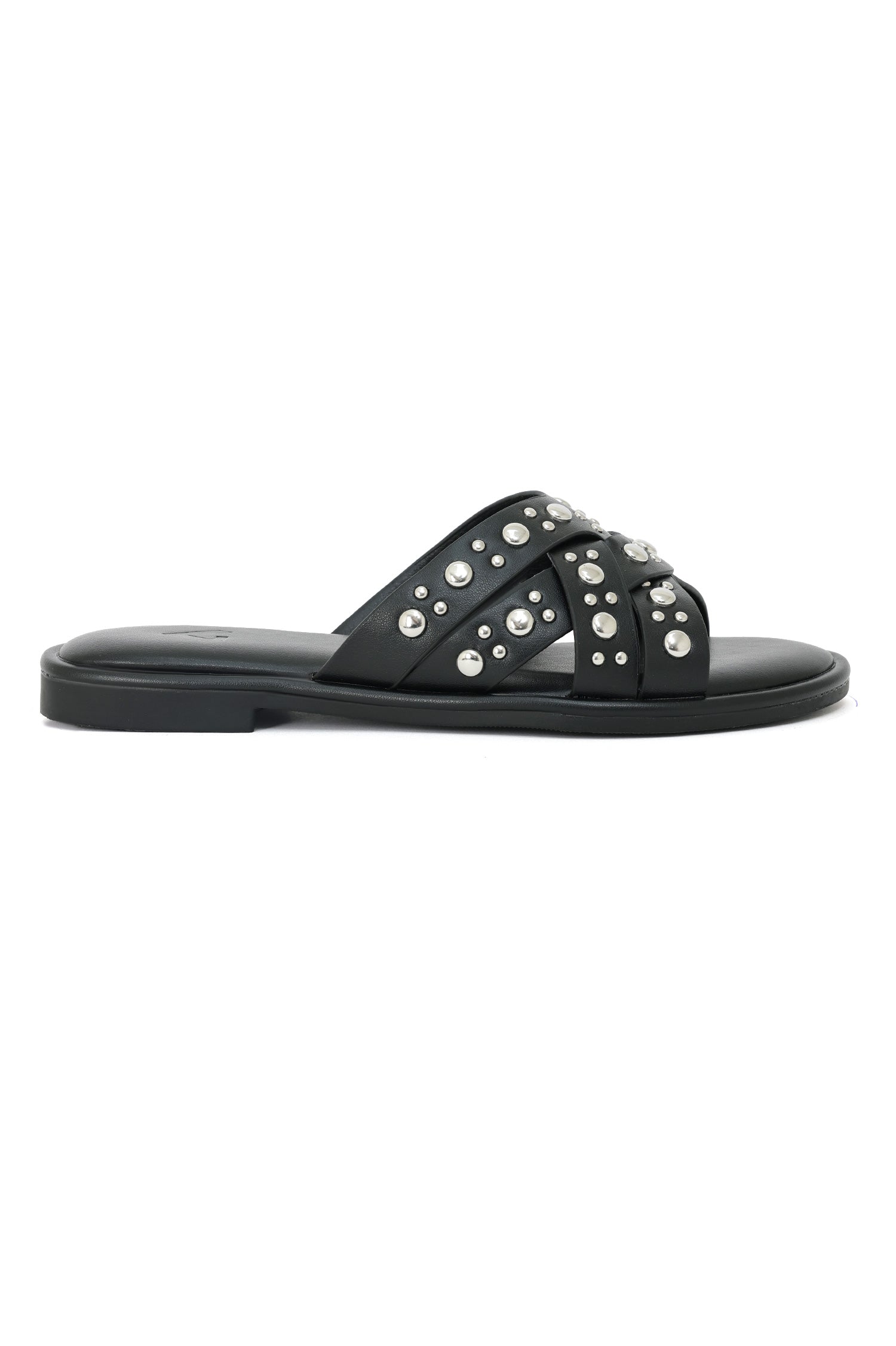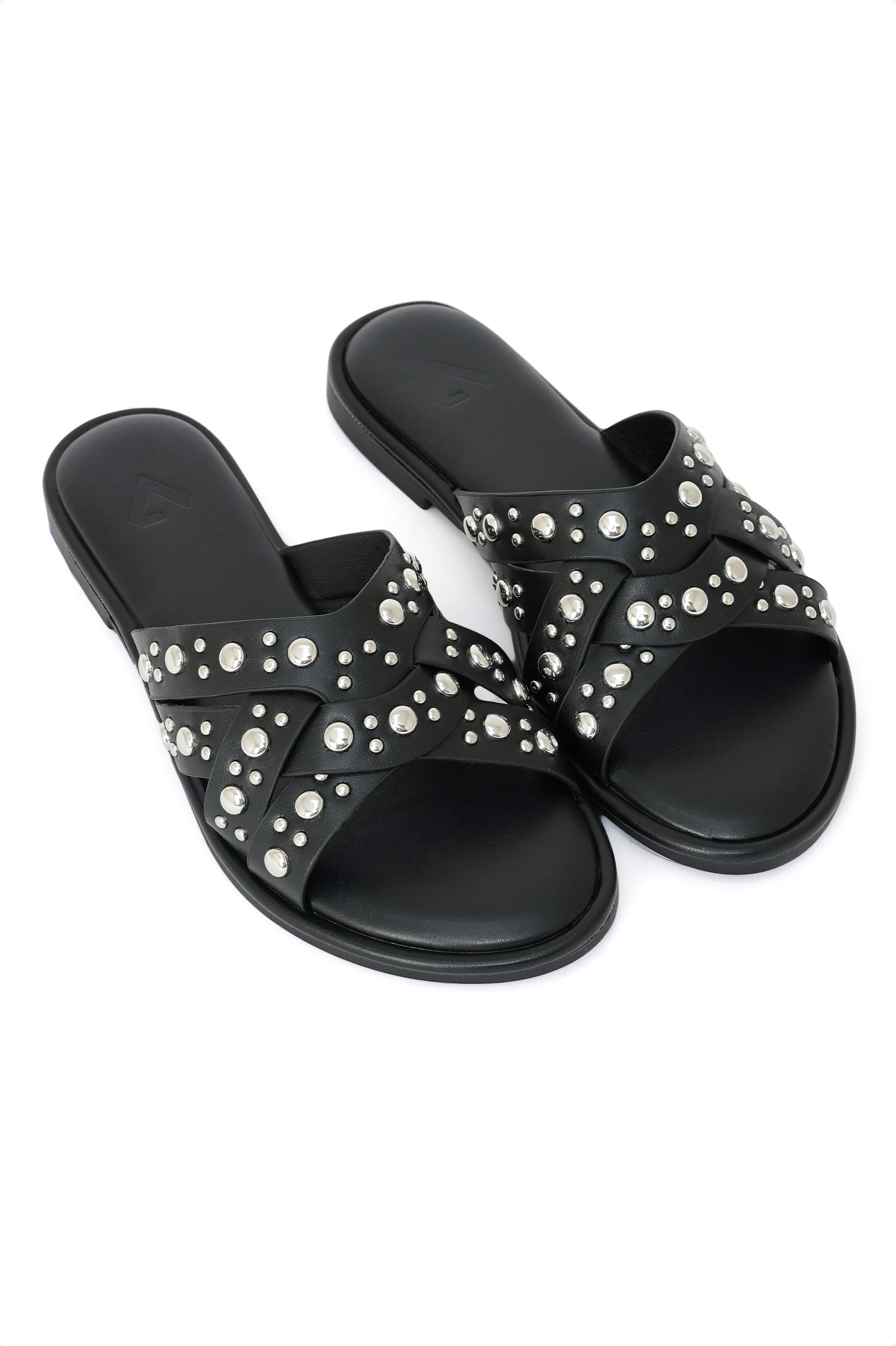 Edgy meets easy in these criss-cross slides featuring metallic dome studs on smooth faux leather. The cushioned foot bed ensures all-day comfort, while the gleaming detail adds a street-chic flair to casual fits or summer layers.