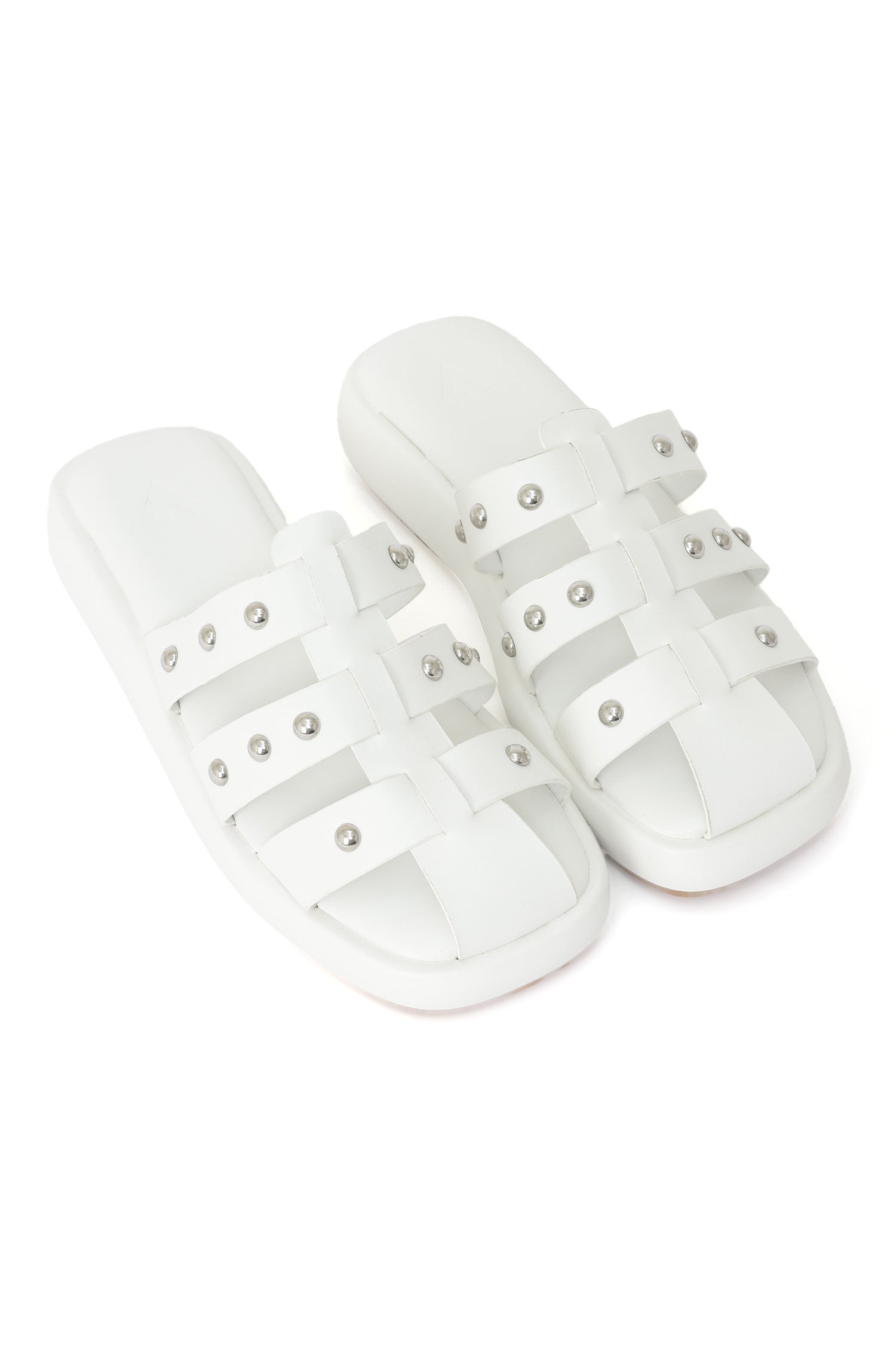 Bold yet minimal, these structured slides feature wide cage-style straps embellished with metallic studs for a touch of edge. The cushioned foot bed ensures all-day comfort, while the sleek matte finish makes them a go-to for contemporary everyday wear.