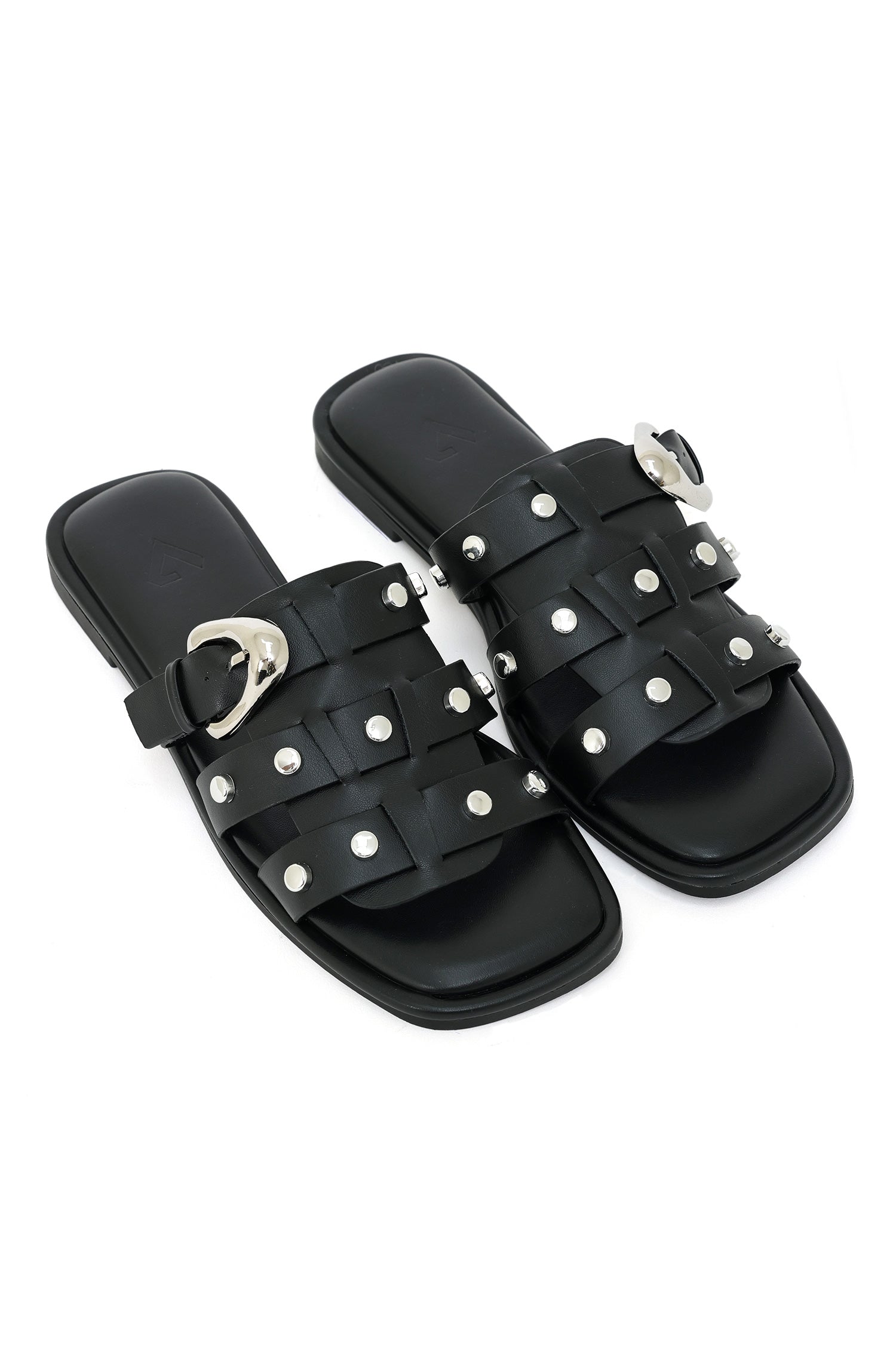 Boldly built with interlaced straps, metallic rivet accents, and a statement side buckle, these slides exude effortless edge. A squared foot bed adds structure while the slip-on design keeps it cool and convenient.