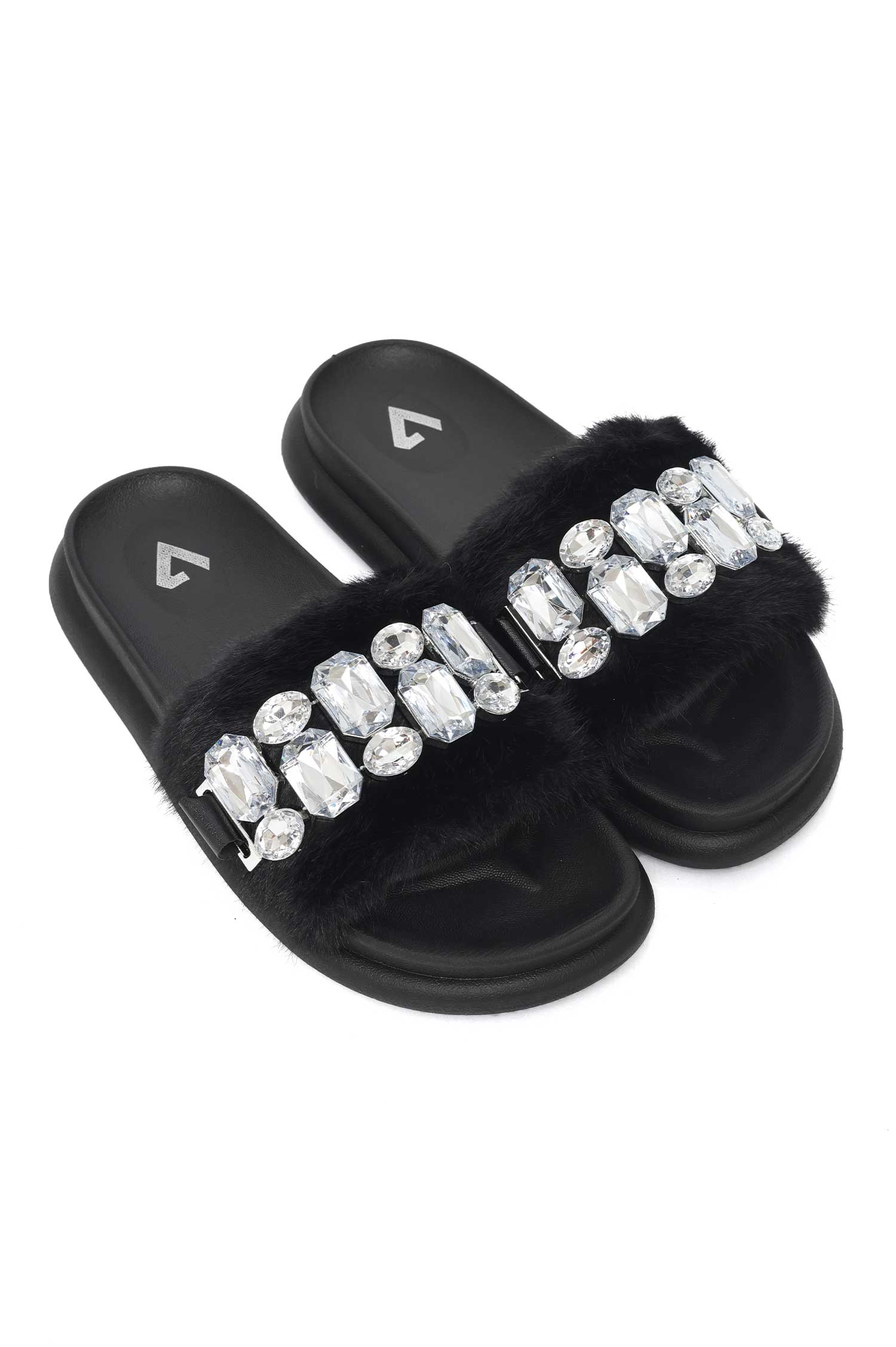 The velvety fur lining hugs the foot while polished crystals reflect light from every angle. A perfect pairing of softness and radiance. Ideal for stylish lounging.