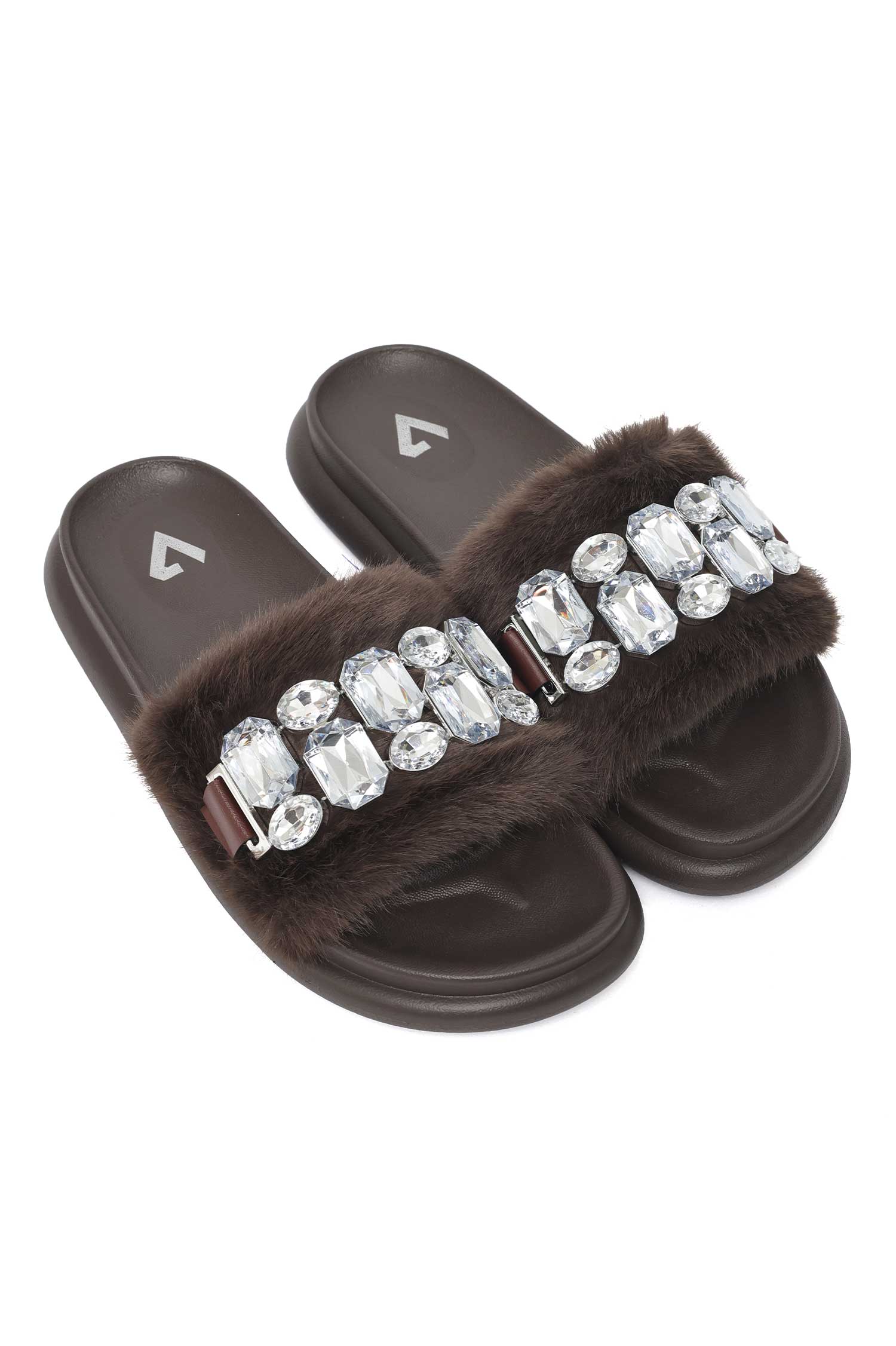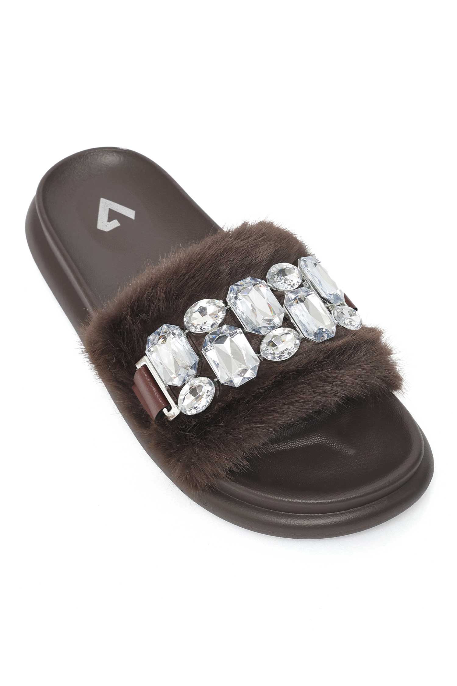 The velvety fur lining hugs the foot while polished crystals reflect light from every angle. A perfect pairing of softness and radiance. Ideal for stylish lounging.