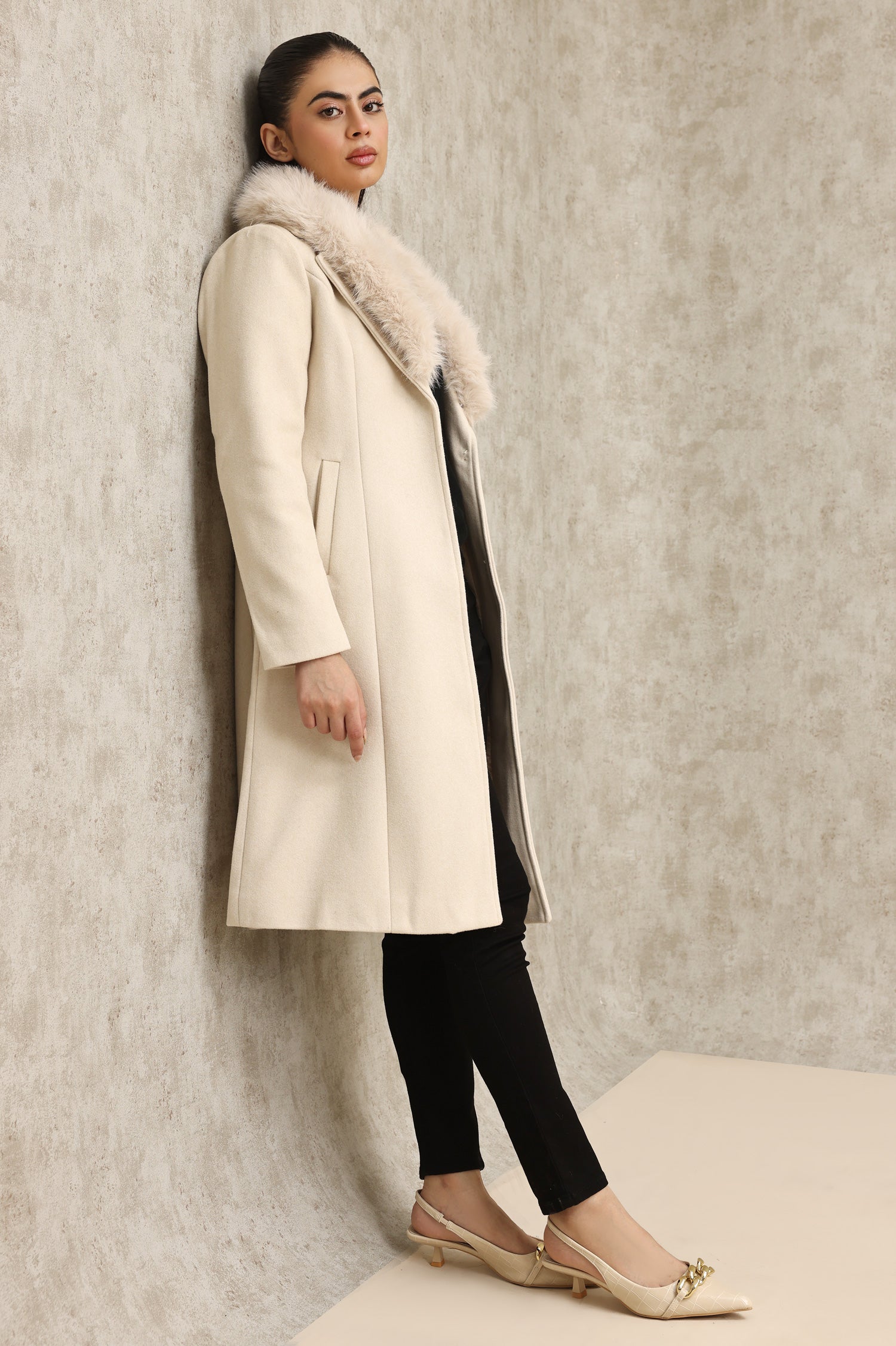 FAUX FUR COLLAR OVERCOAT-BEIGE