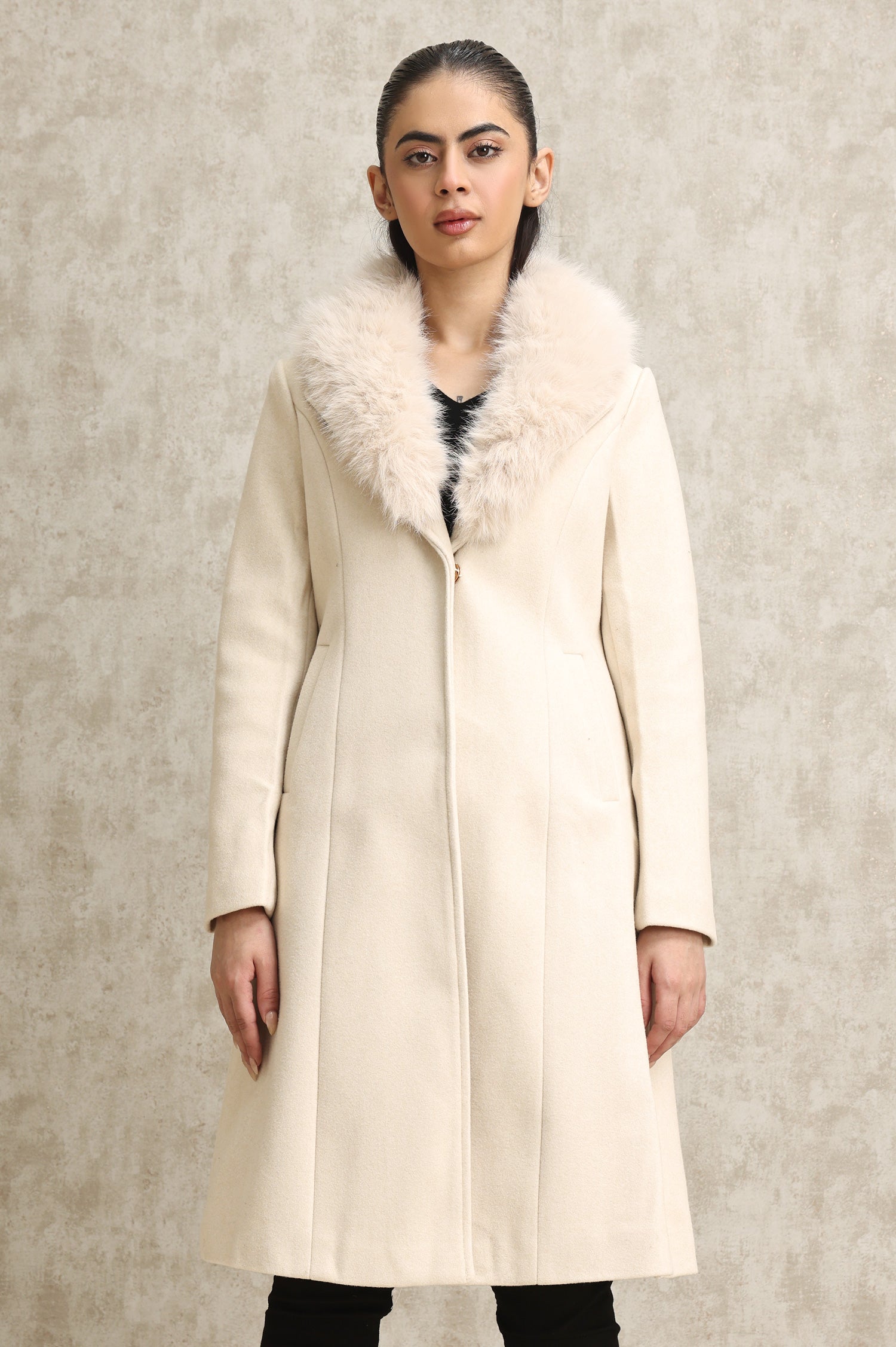 Stay cozy in this chic overcoat featuring a plush fur collar and modern tailoring, ideal for sophisticated outerwear.