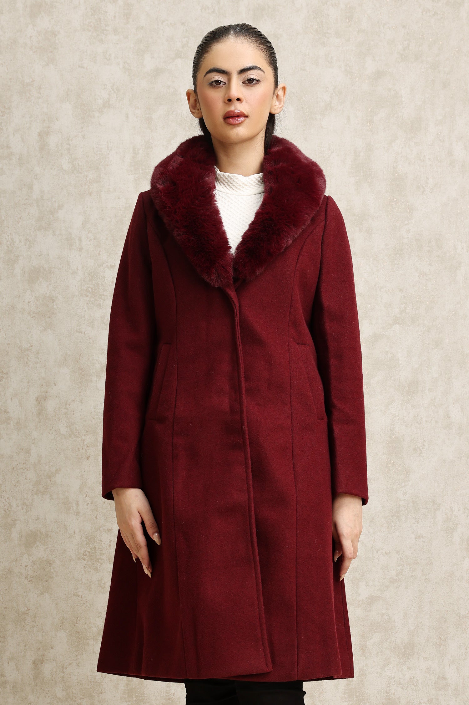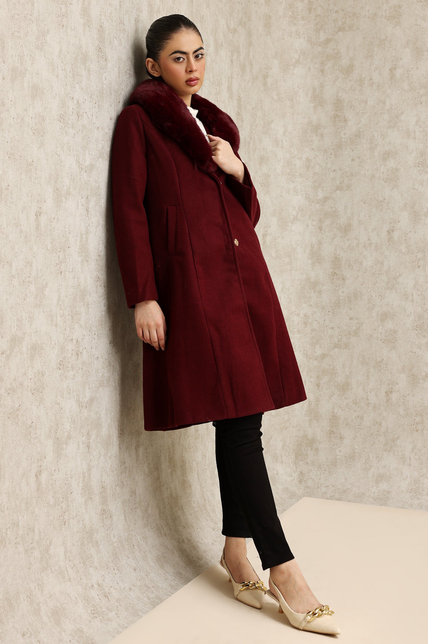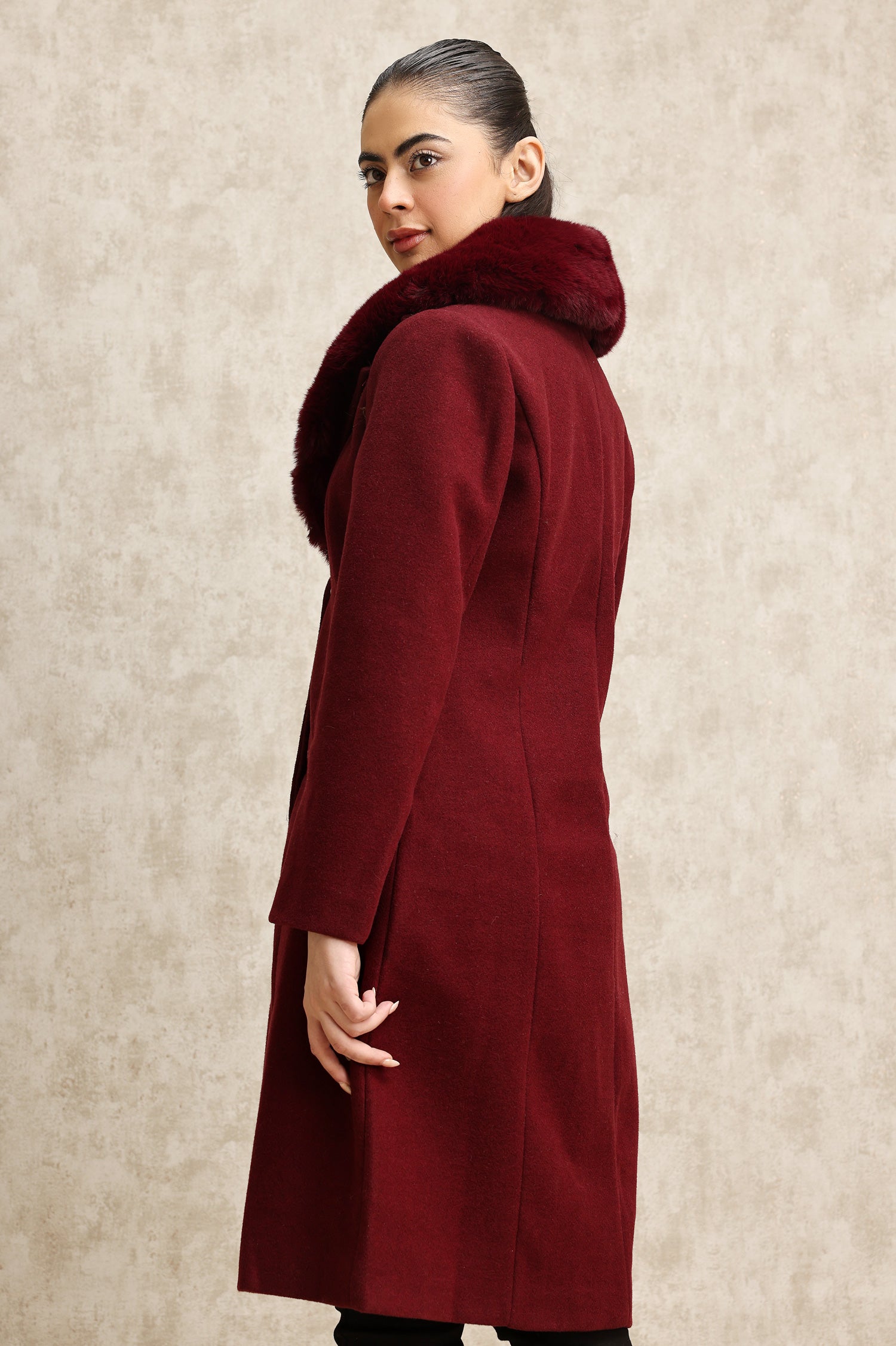 FAUX FUR COLLAR OVERCOAT-WINE