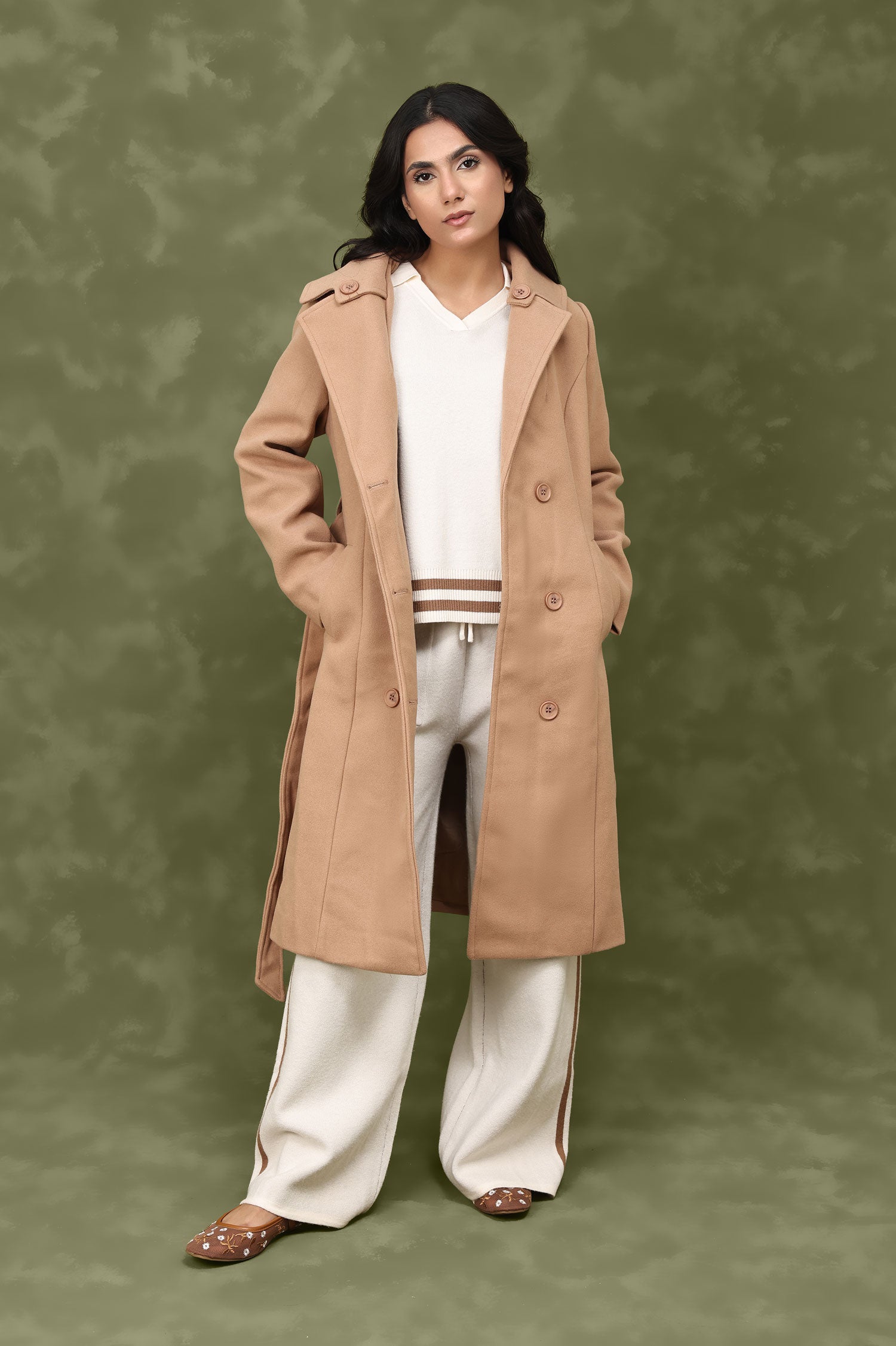 Upgrade your outerwear with this trench-inspired coat, designed with double-breasted buttons and a tie-up belt for a flattering silhouette.