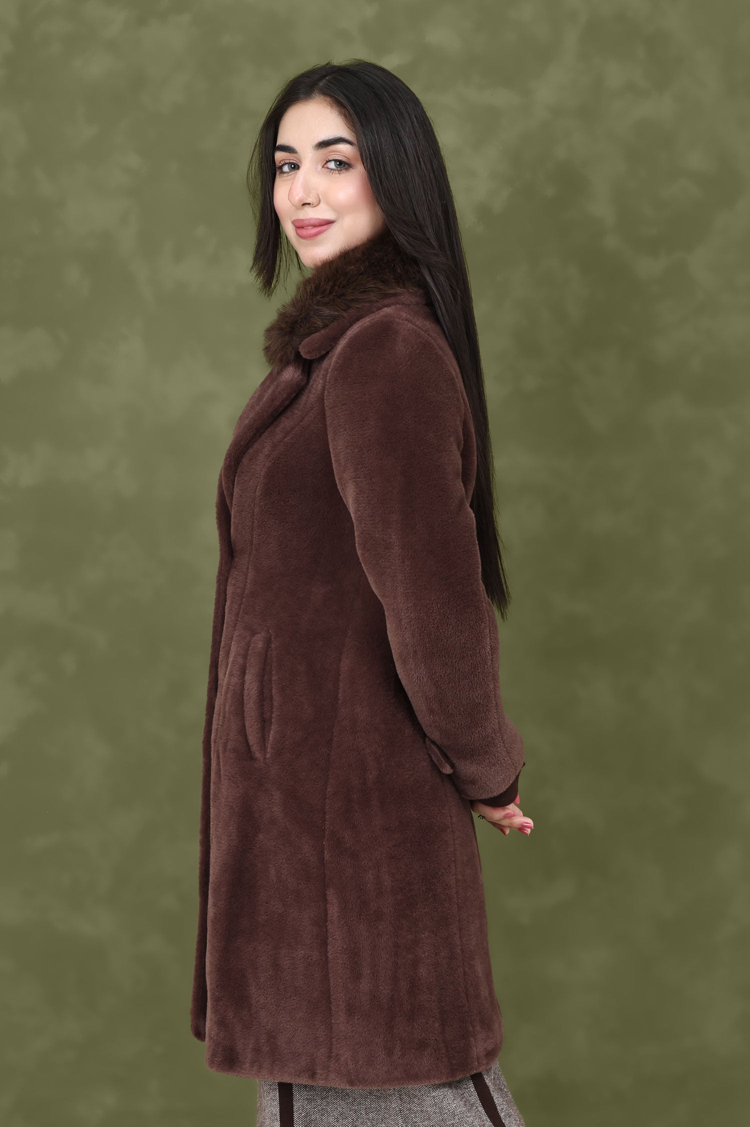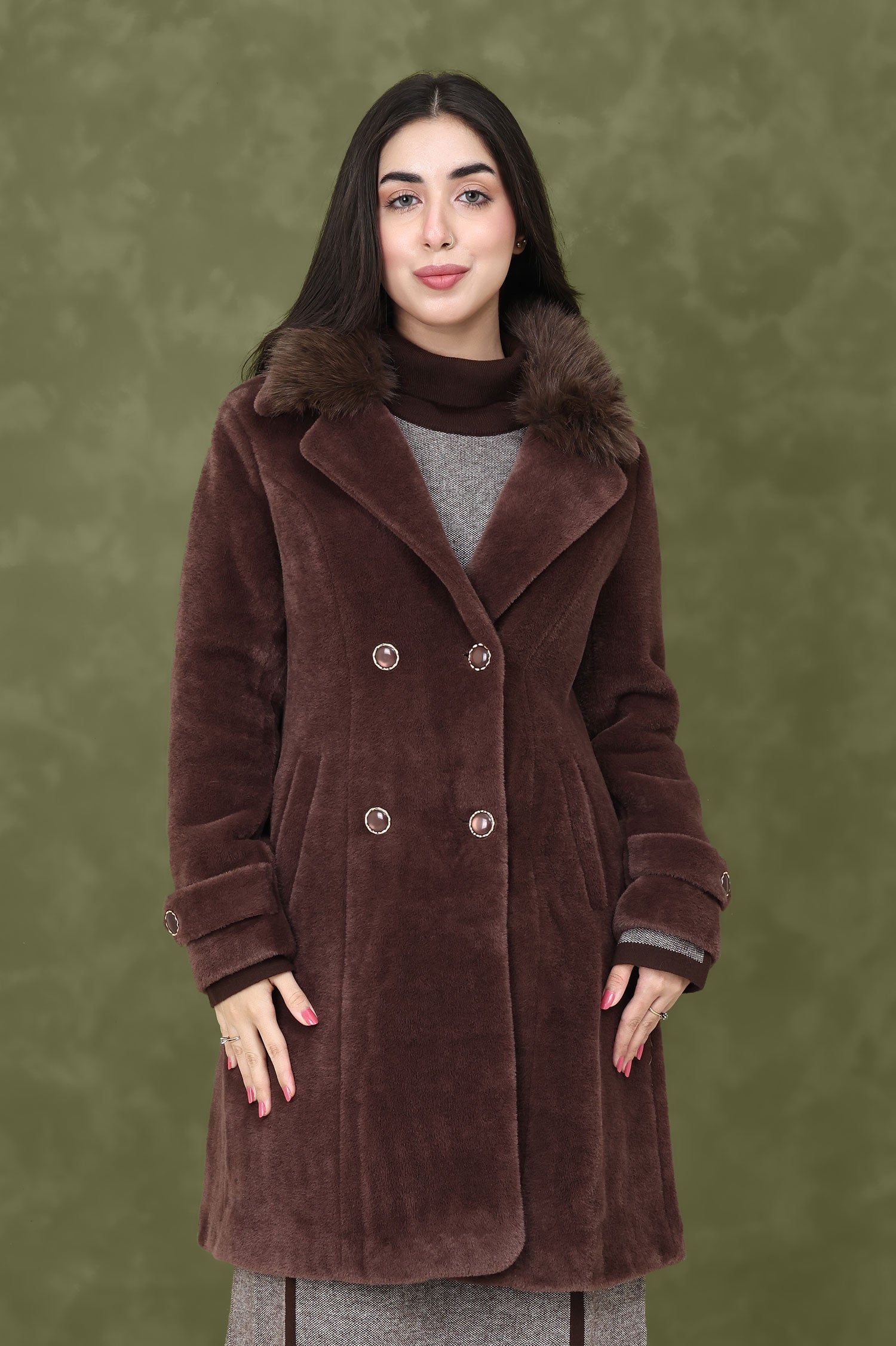 A perfect blend of comfort and style, this winter coat features a soft wool texture, double-breasted buttons, and a plush fur-trimmed collar.