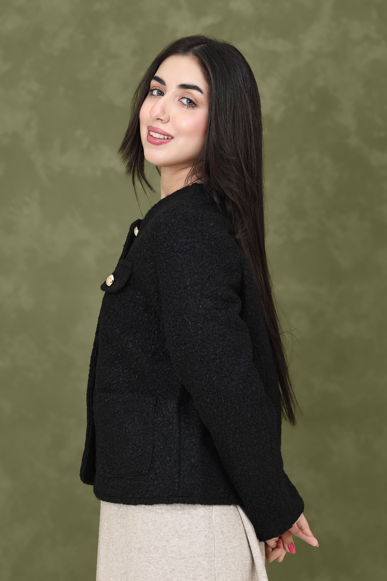 This textured tweed jacket features a refined design with a round neckline, decorative buttons, and functional front pockets for a timeless appeal.