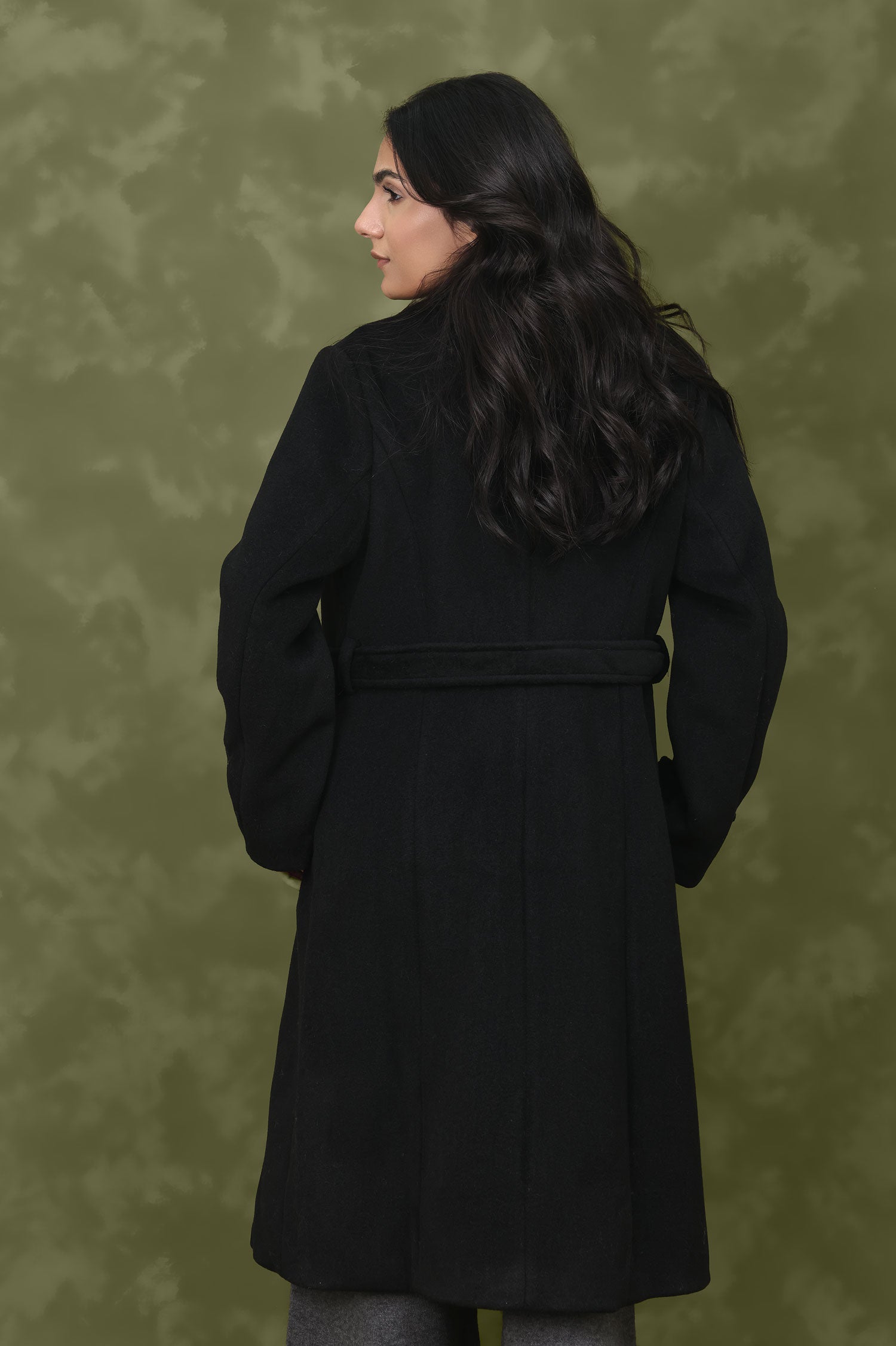 Mid-length coat tailored with notch lapels and belted waist.