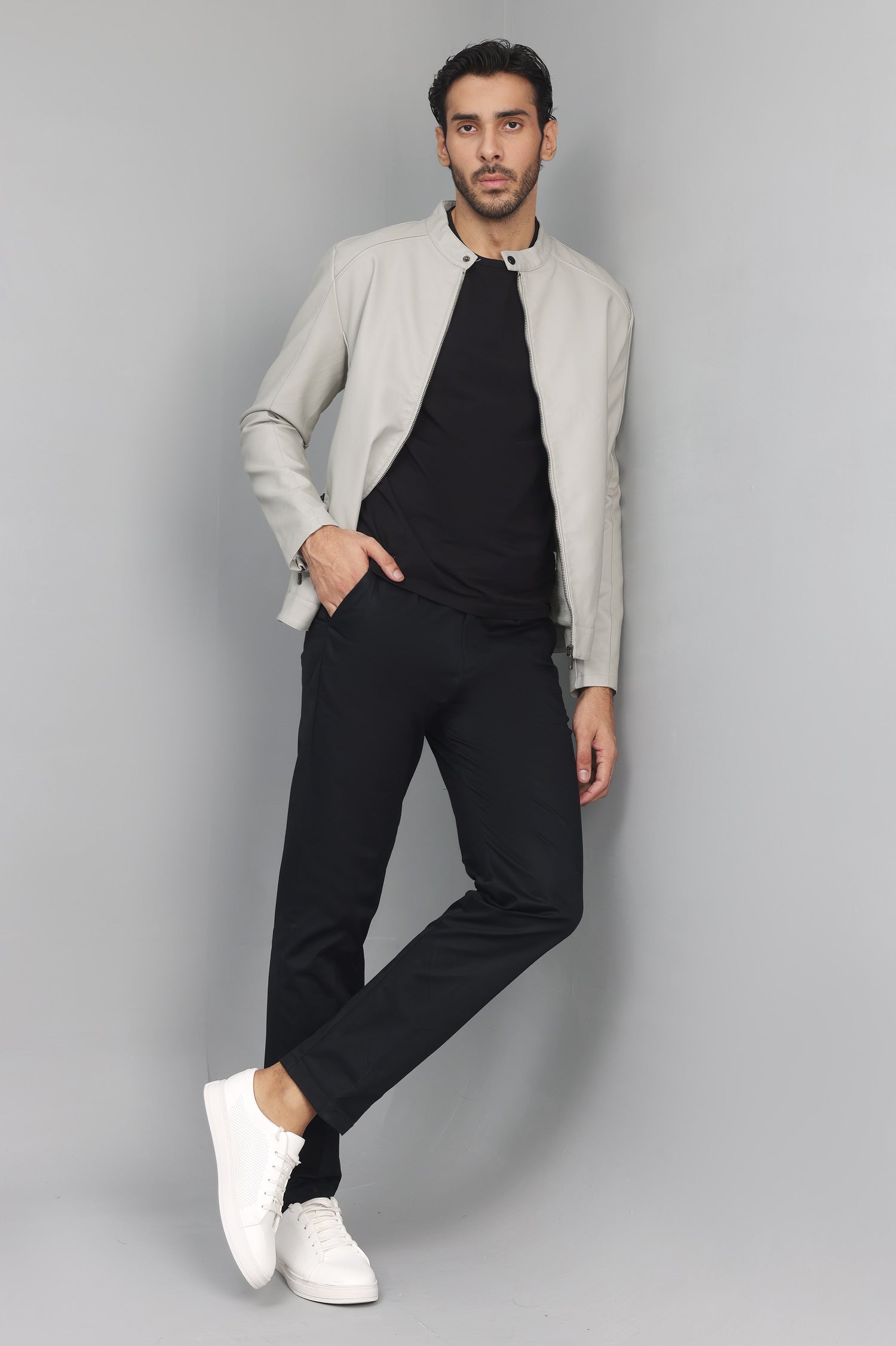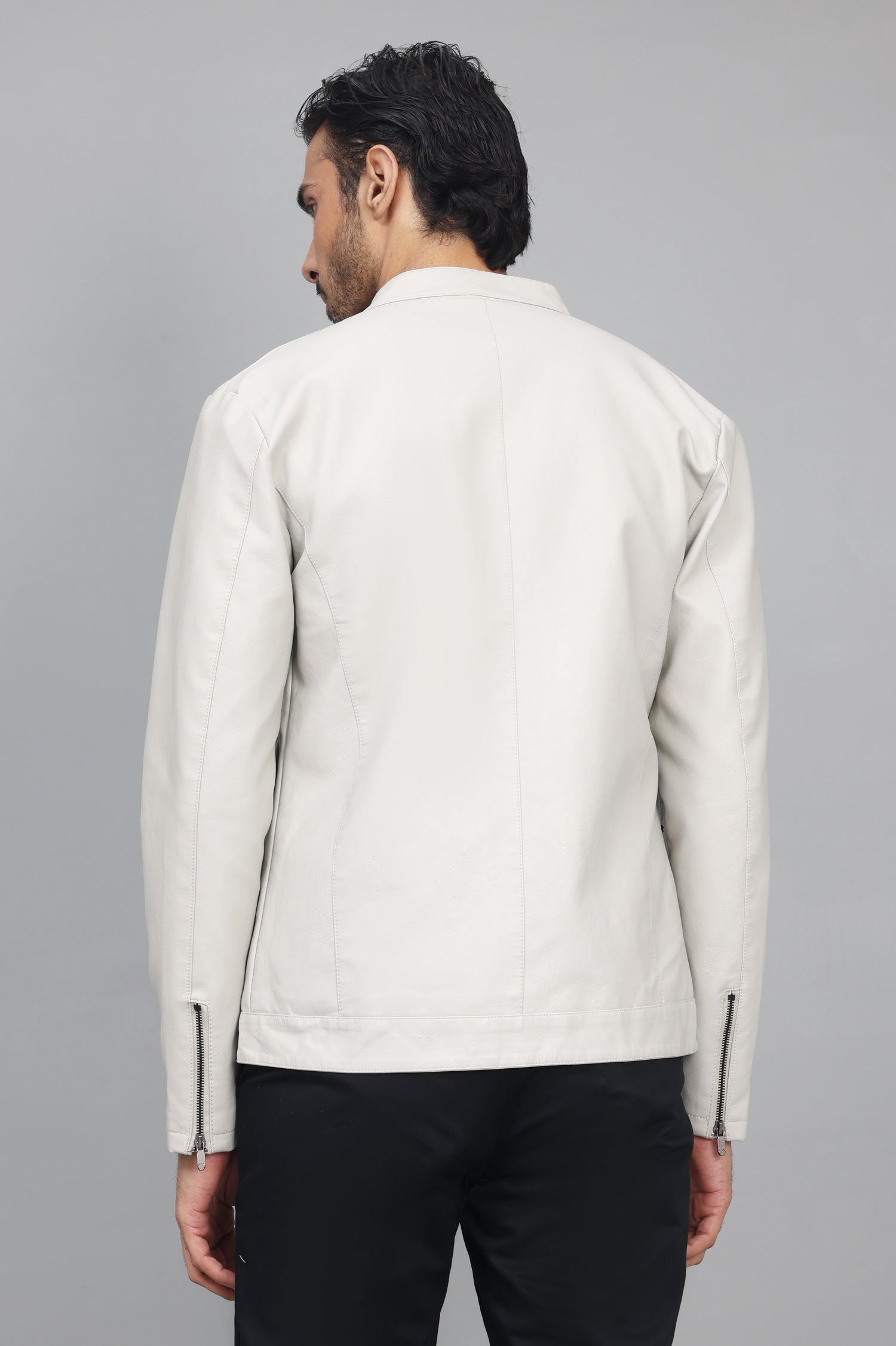 This streamlined jacket features a bold stand collar and durable zipper, inspired by moto designs. Perfect for everyday sophistication, it delivers a confident and sharp aesthetic.