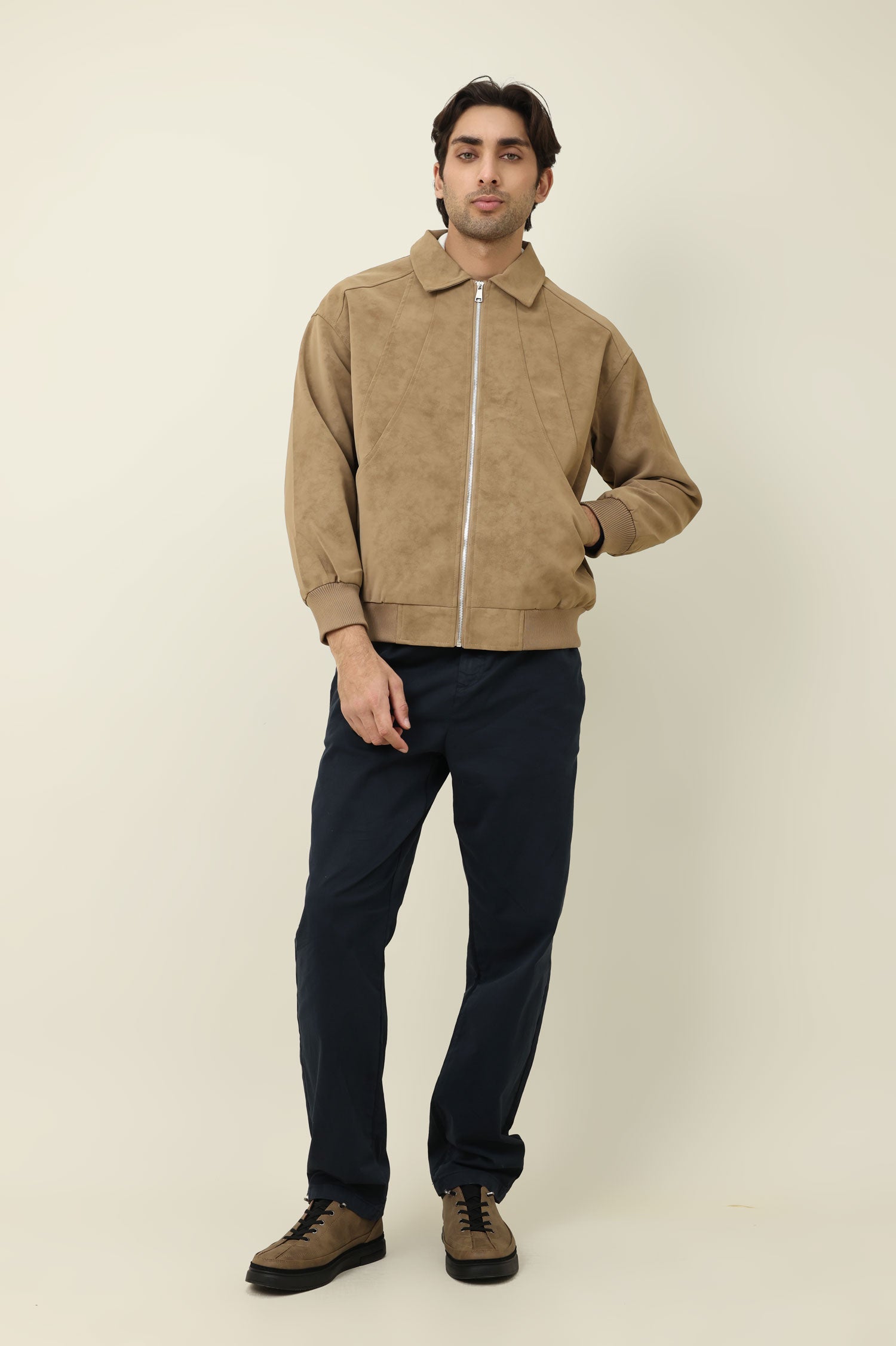 Designed with a slightly oversized cut and soft matte texture, this jacket blends biker influence with casual comfort. Zip-front and wrist cuffs enhance utility. The collar sits neatly with a modern notch.