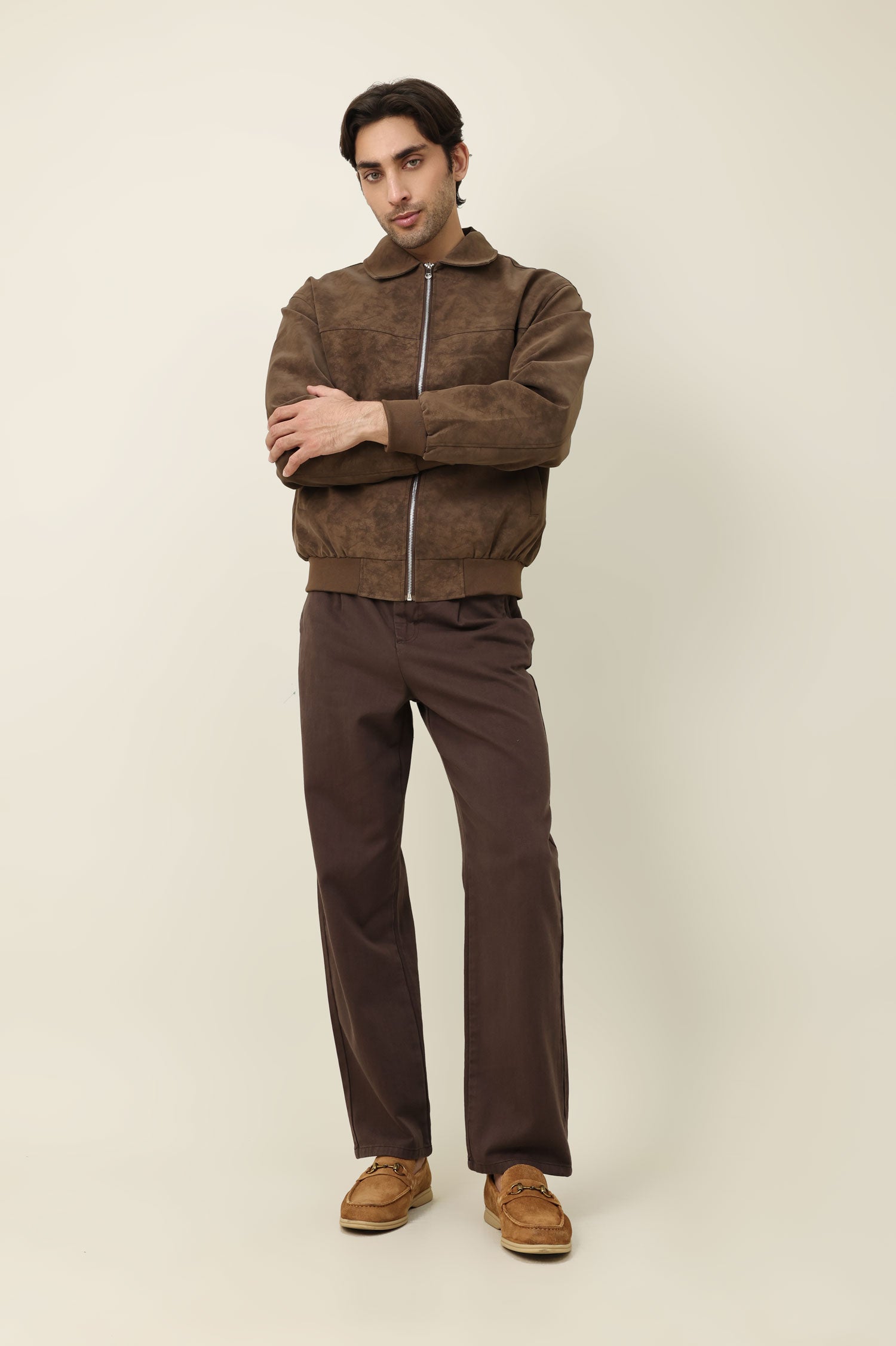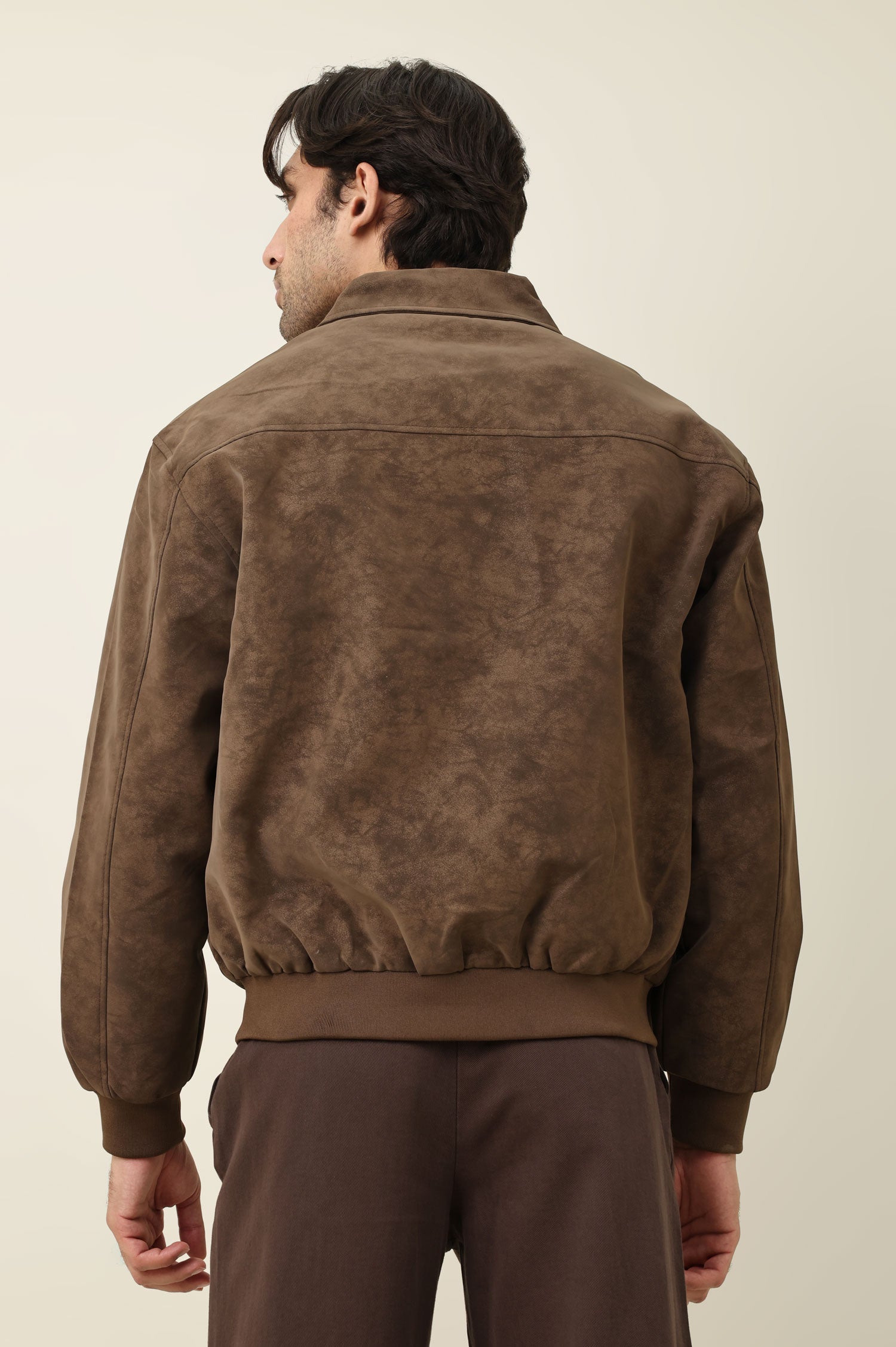 Soft, structured silhouette with a relaxed fit that emphasizes clean lines and timeless appeal. the texture showcases a rich suede finish with subtle tonal variations, giving depth and character to the surface. a full-zip front and ribbed cuffs provide functional detail while preserving an understated, versatile look.