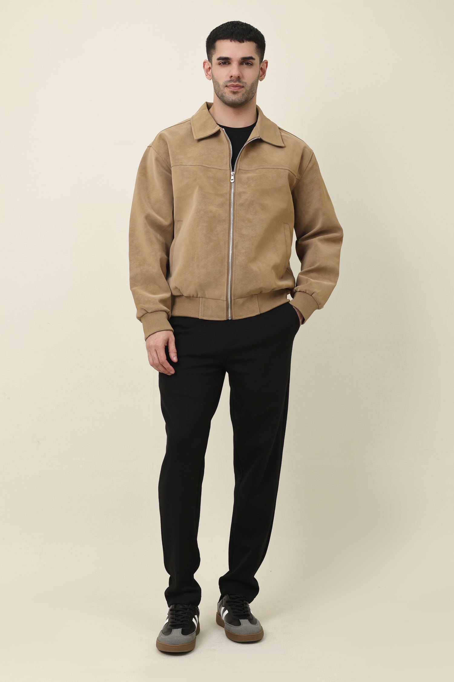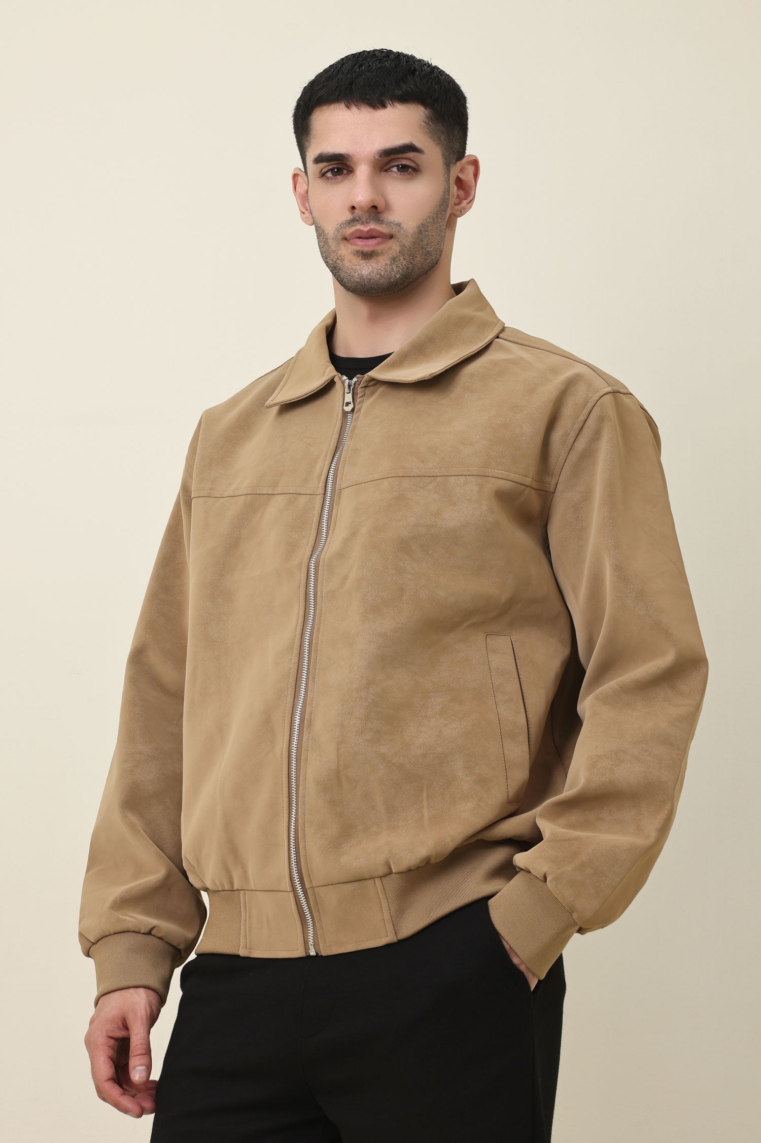 Soft, structured silhouette with a relaxed fit that emphasizes clean lines and timeless appeal. the texture showcases a rich suede finish with subtle tonal variations, giving depth and character to the surface. a full-zip front and ribbed cuffs provide functional detail while preserving an understated, versatile look.