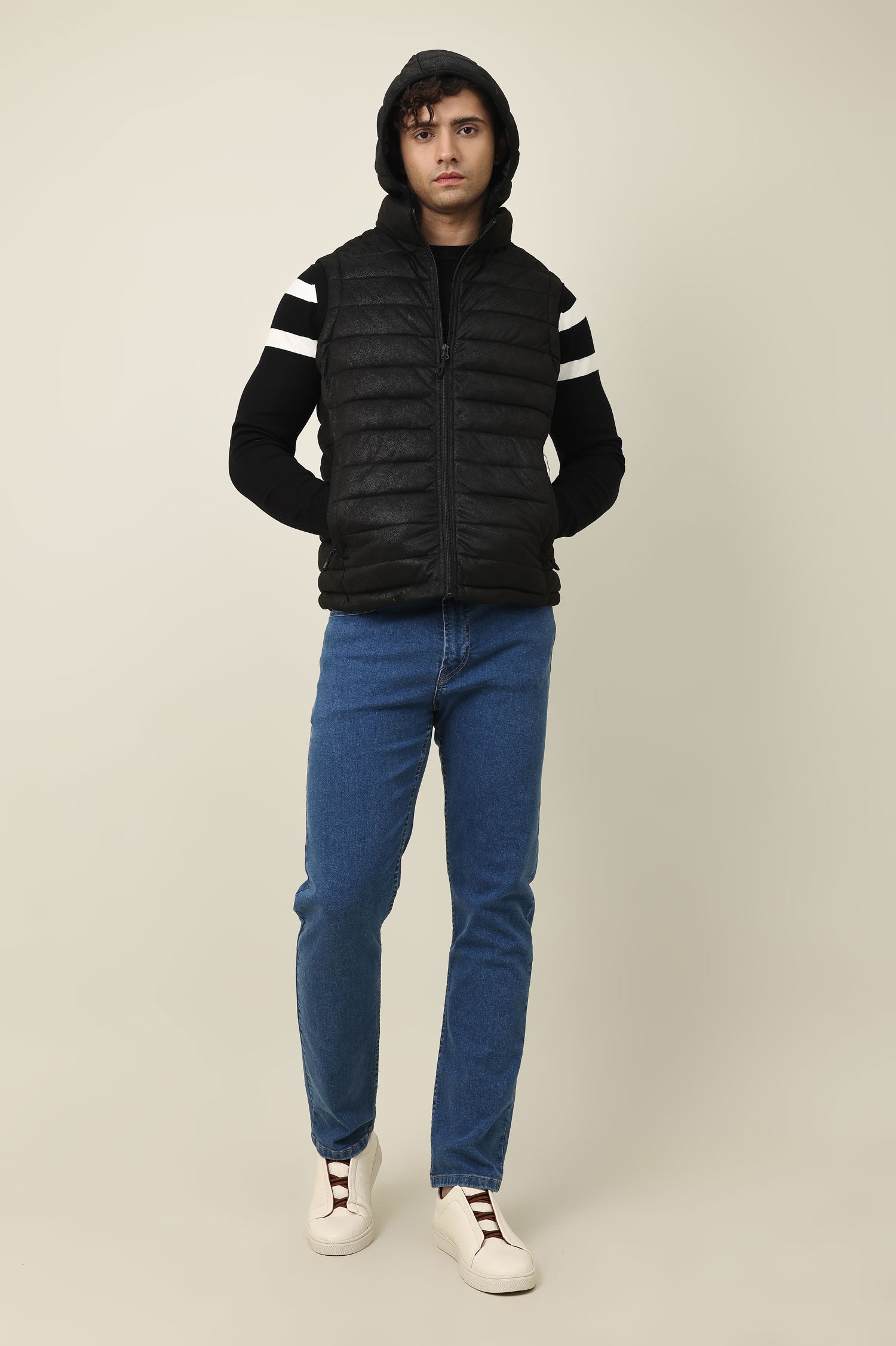 Padded silhouette with horizontal paneling and a protective hood. The clean front zip and hidden side pockets offer a smooth, practical finish. Ideal for transitional outerwear styling.
