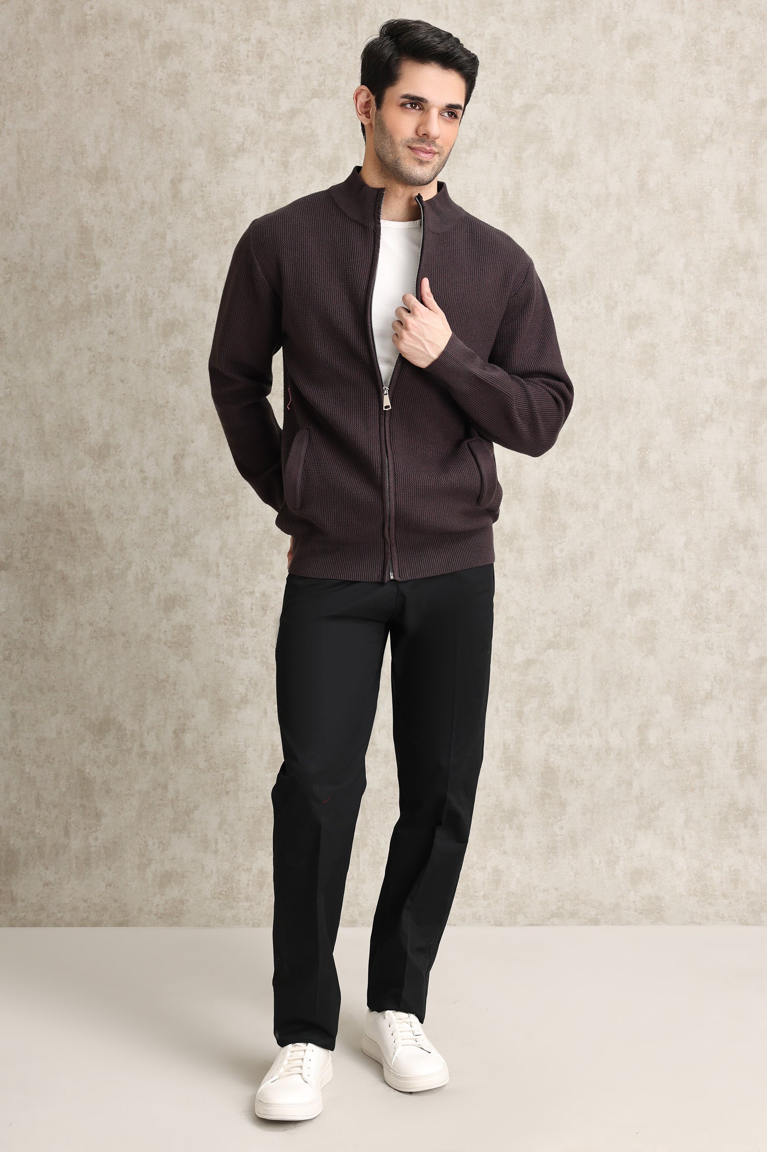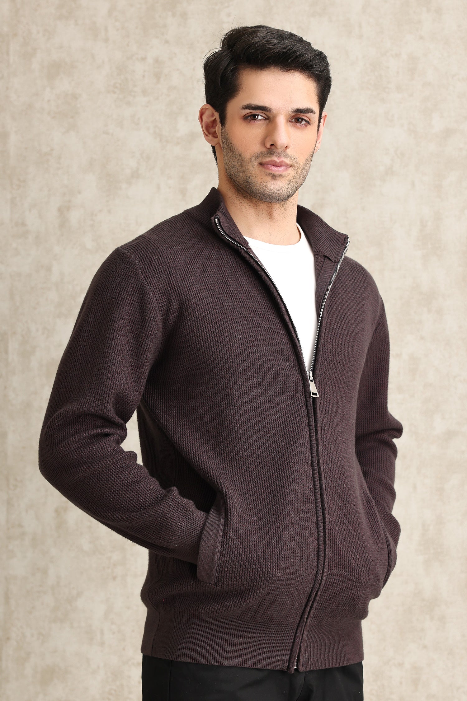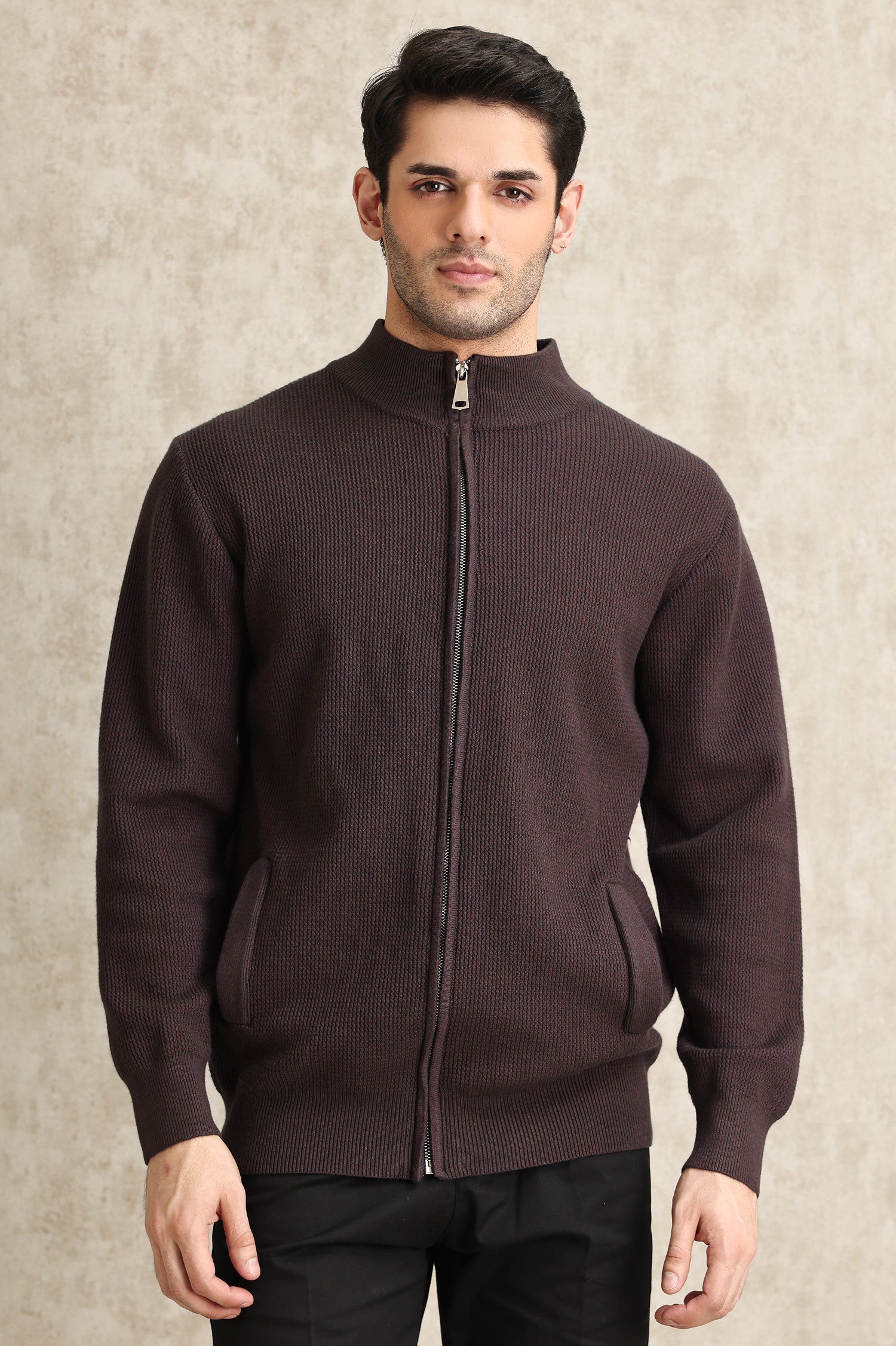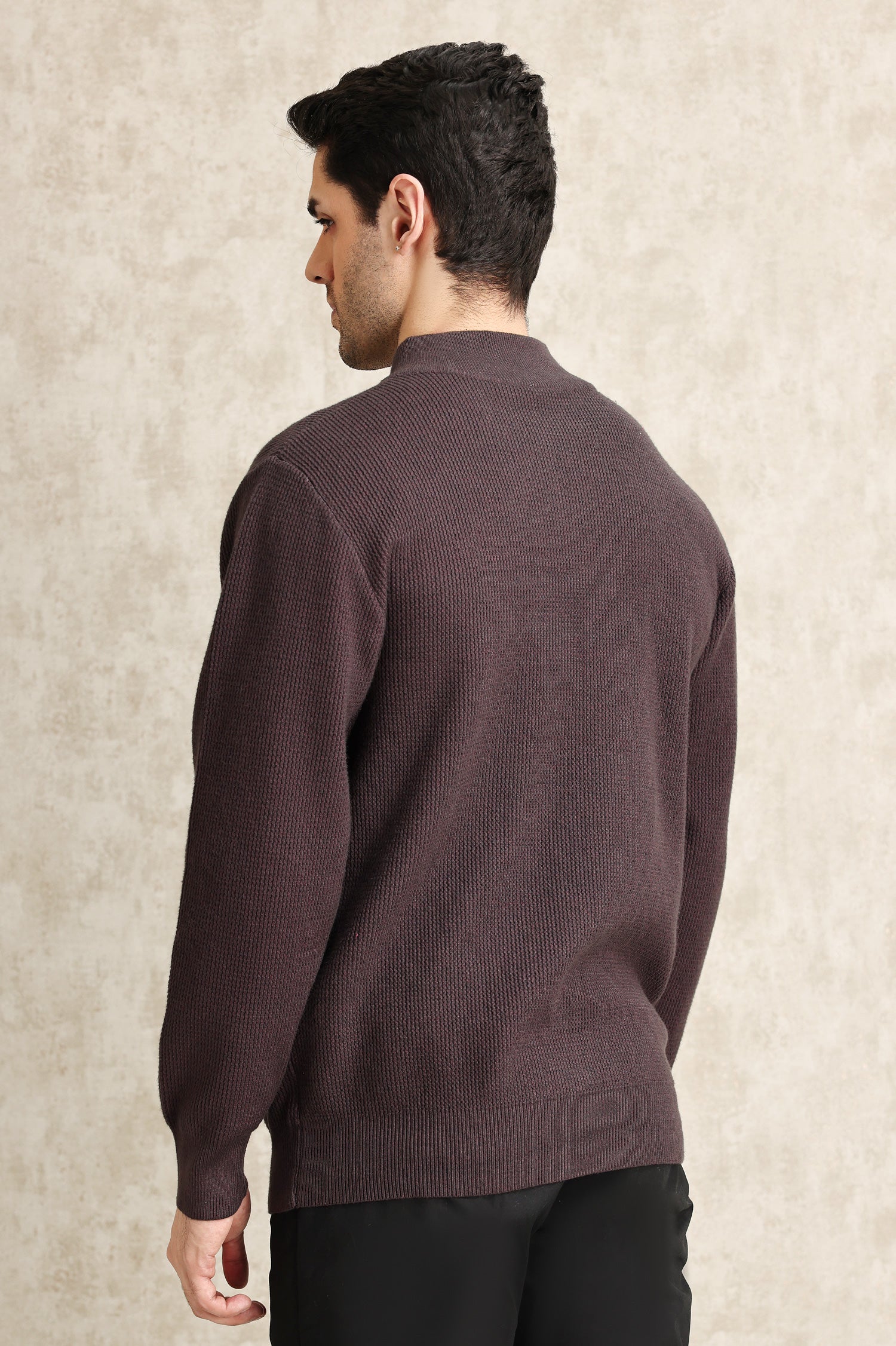 A versatile full-zip sweater featuring a sleek mock neck design and textured knit finish. Perfect for layering or standalone wear, this refined essential offers warmth, comfort, and a modern silhouette for any occasion.
