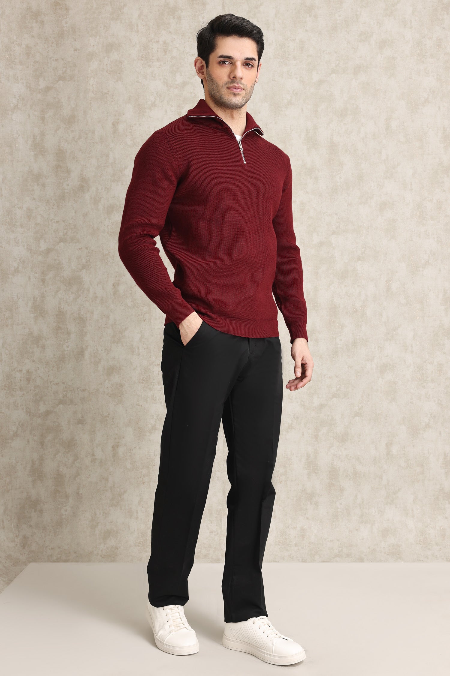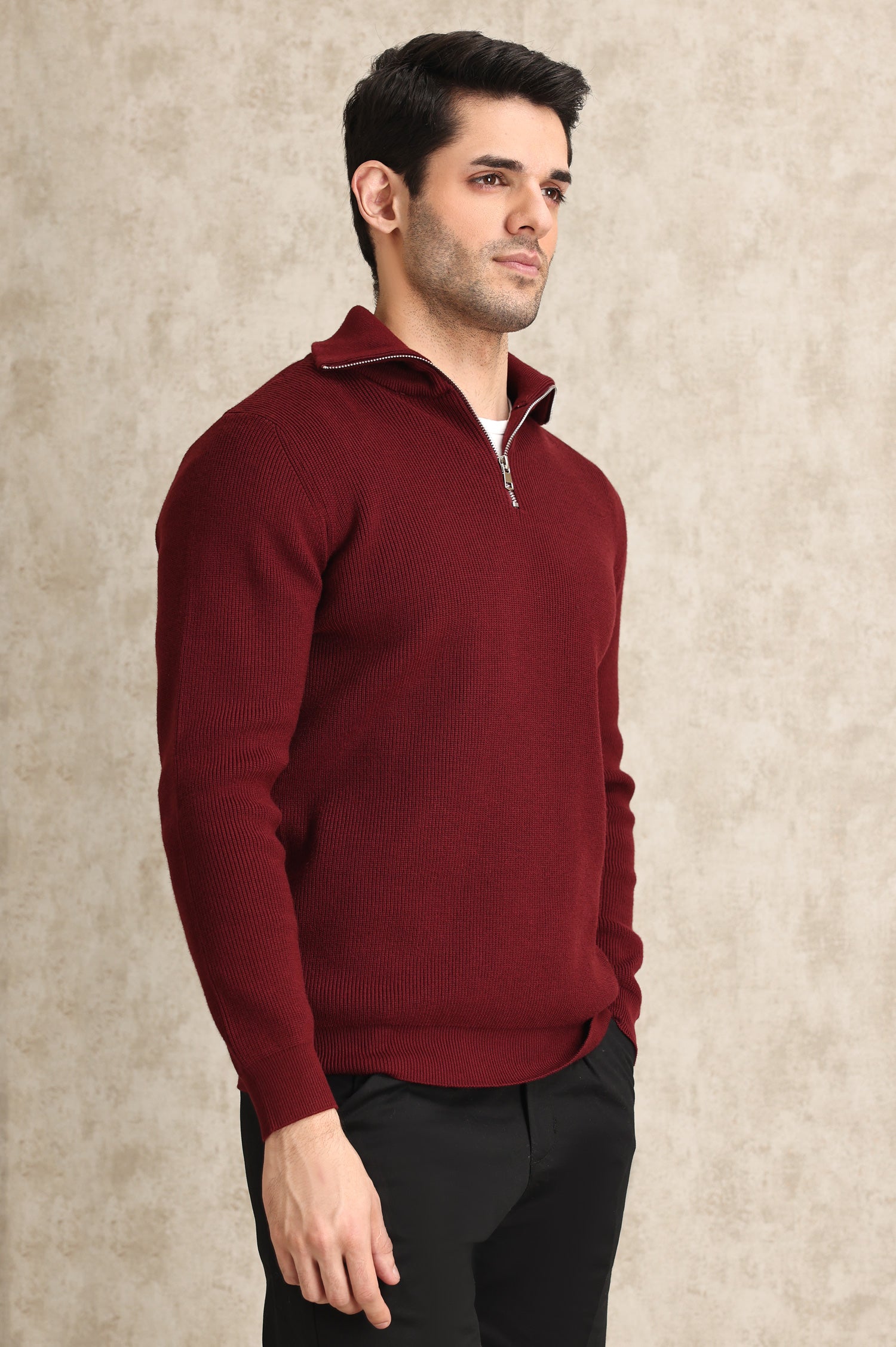 A sleek half-zip sweater with a fine ribbed knit texture. Designed for modern style and versatility, this piece features a relaxed fit and a polished zip collar, perfect for layering or standalone wear.