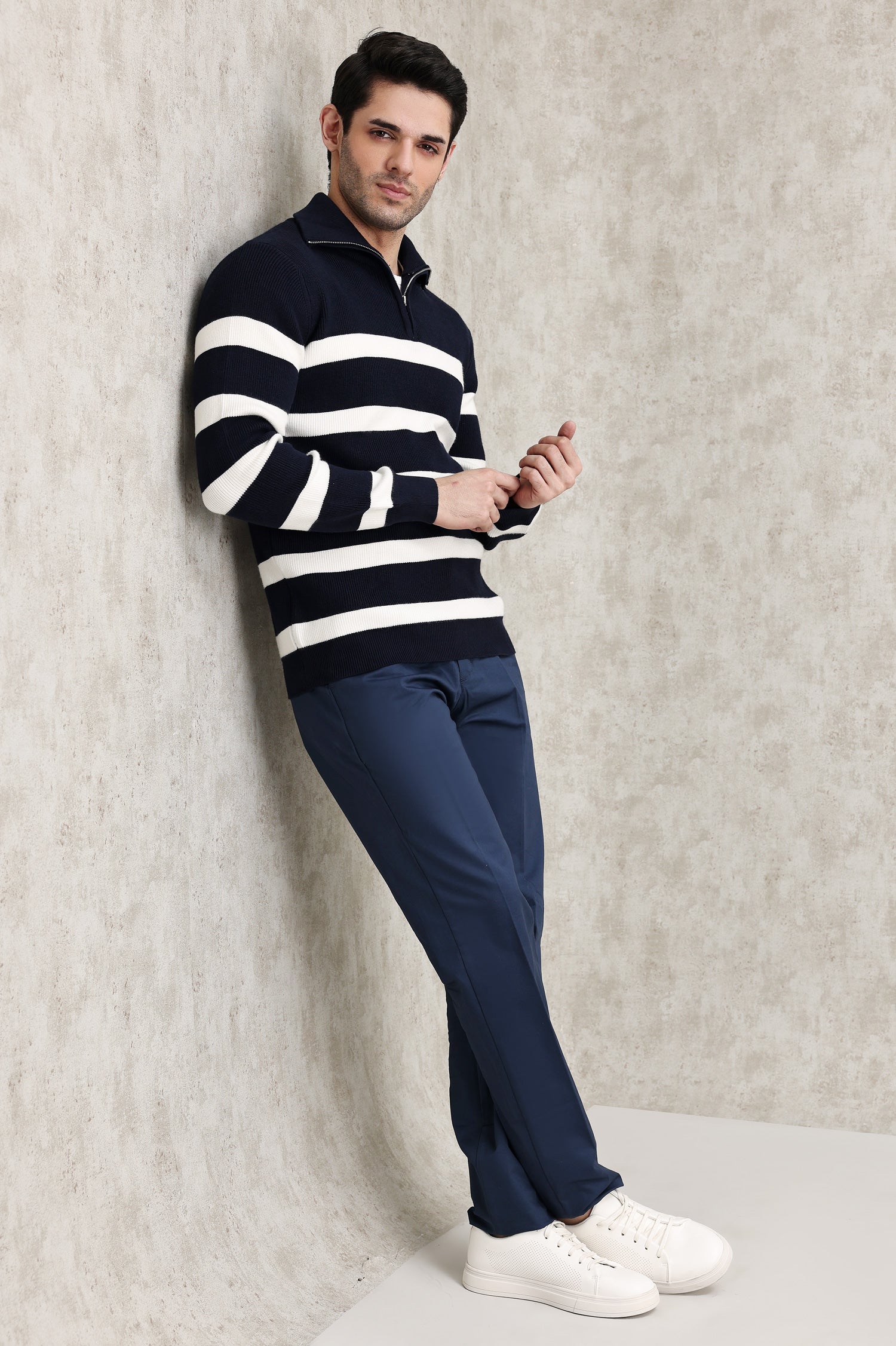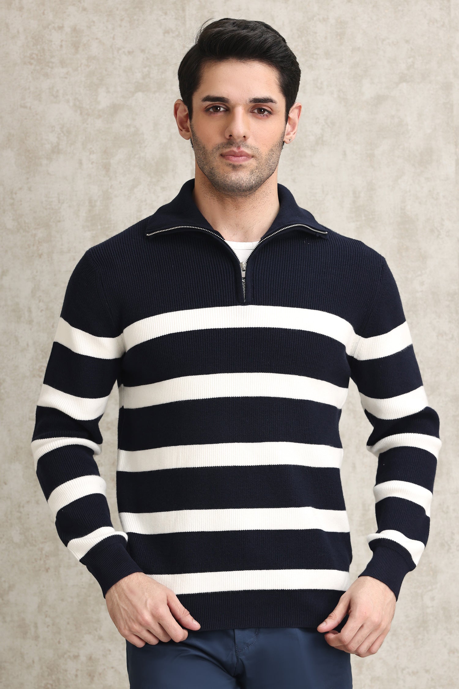 A contemporary half-zip sweater with bold horizontal stripes and a refined ribbed texture. This modern knit combines comfort and style, perfect for elevating casual ensembles with a sleek, polished look.