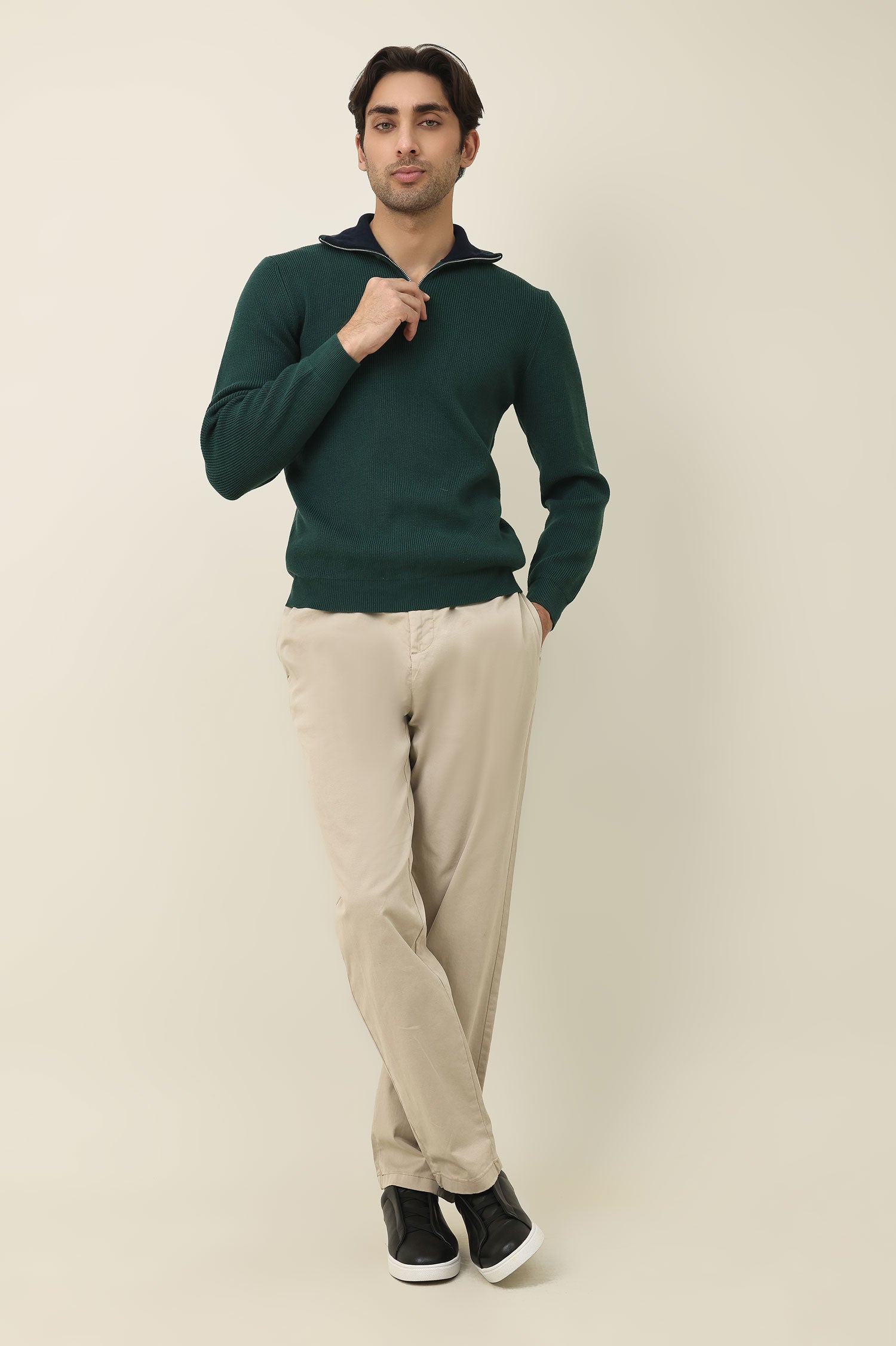 The knit texture presents a crisp, structured surface with subtle vertical ribbing that adds dimension to the shape. A quarter-zip collar detail provides versatile styling options while preserving a clean, minimal aesthetic. This piece is built for everyday wear and layering, combining timeless elegance with durable construction.
